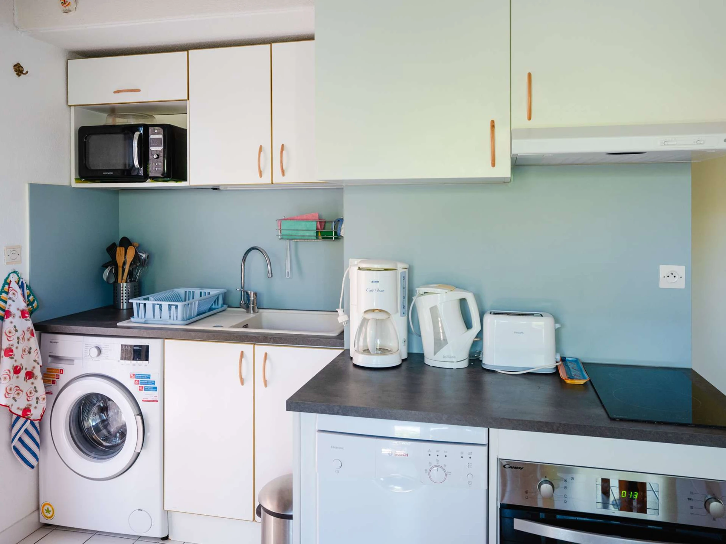 Au rez-de-chaussée le séjour dispose d'un canapé et d'une télévision (chaînes françaises uniquement). La cuisine ouverte sur le séjour est dotée d'un réfrigérateur avec freezer, un four, une plaque de cuisson à induction (2 feux), un lave-vaisselle, micro-onde, grille-pain, bouilloire, cafetière classique et lave-linge