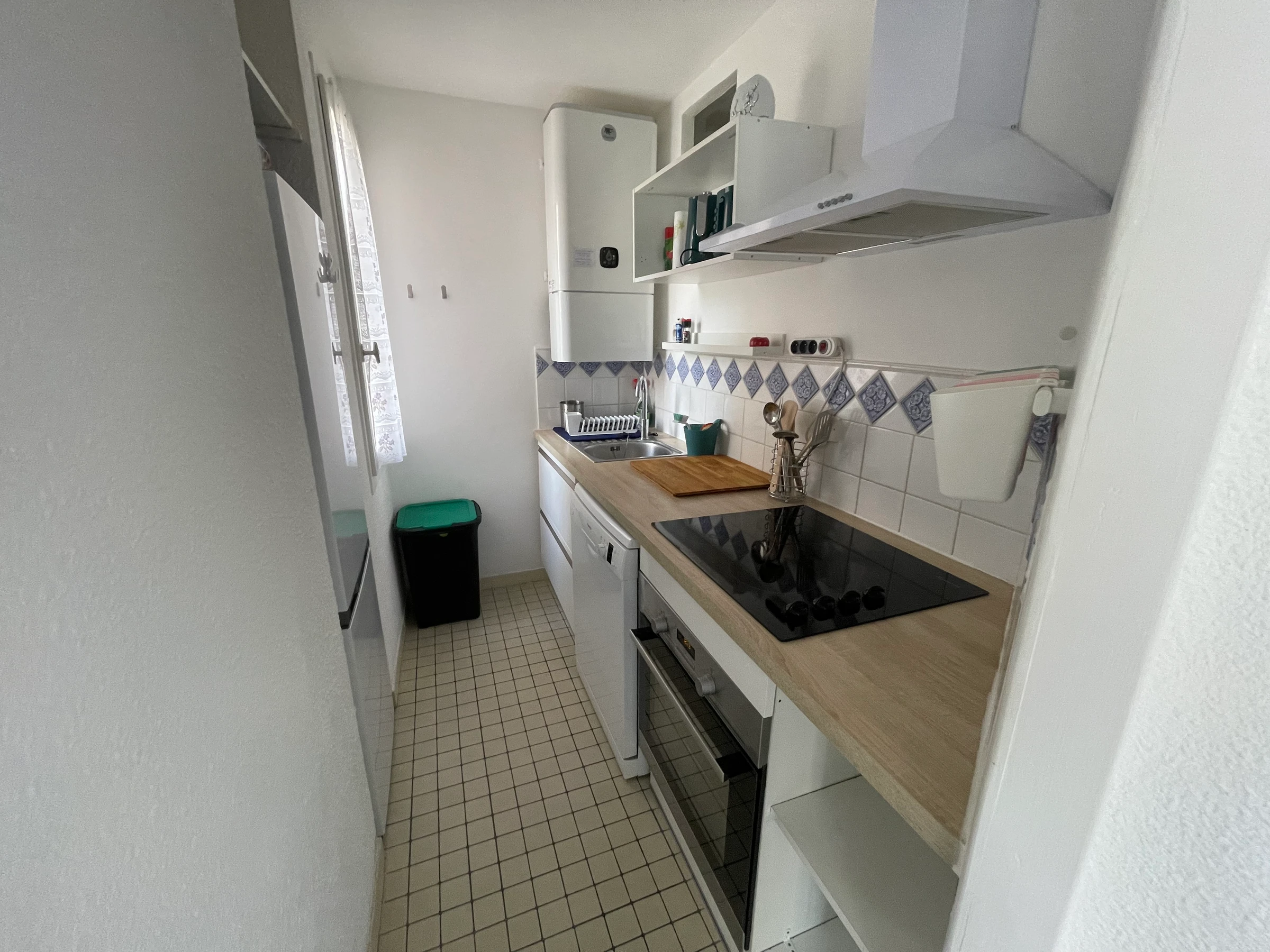 Cuisine indépendante , Loggia équipée en coin repas. Vue dégagée sur la résidence.