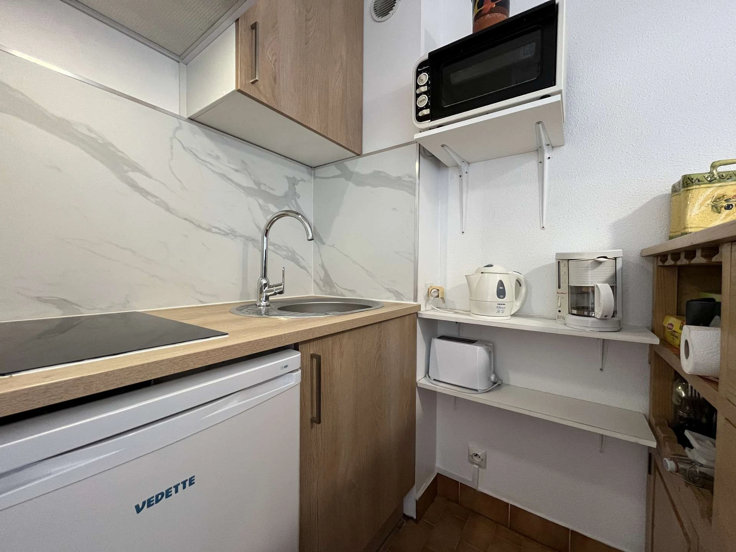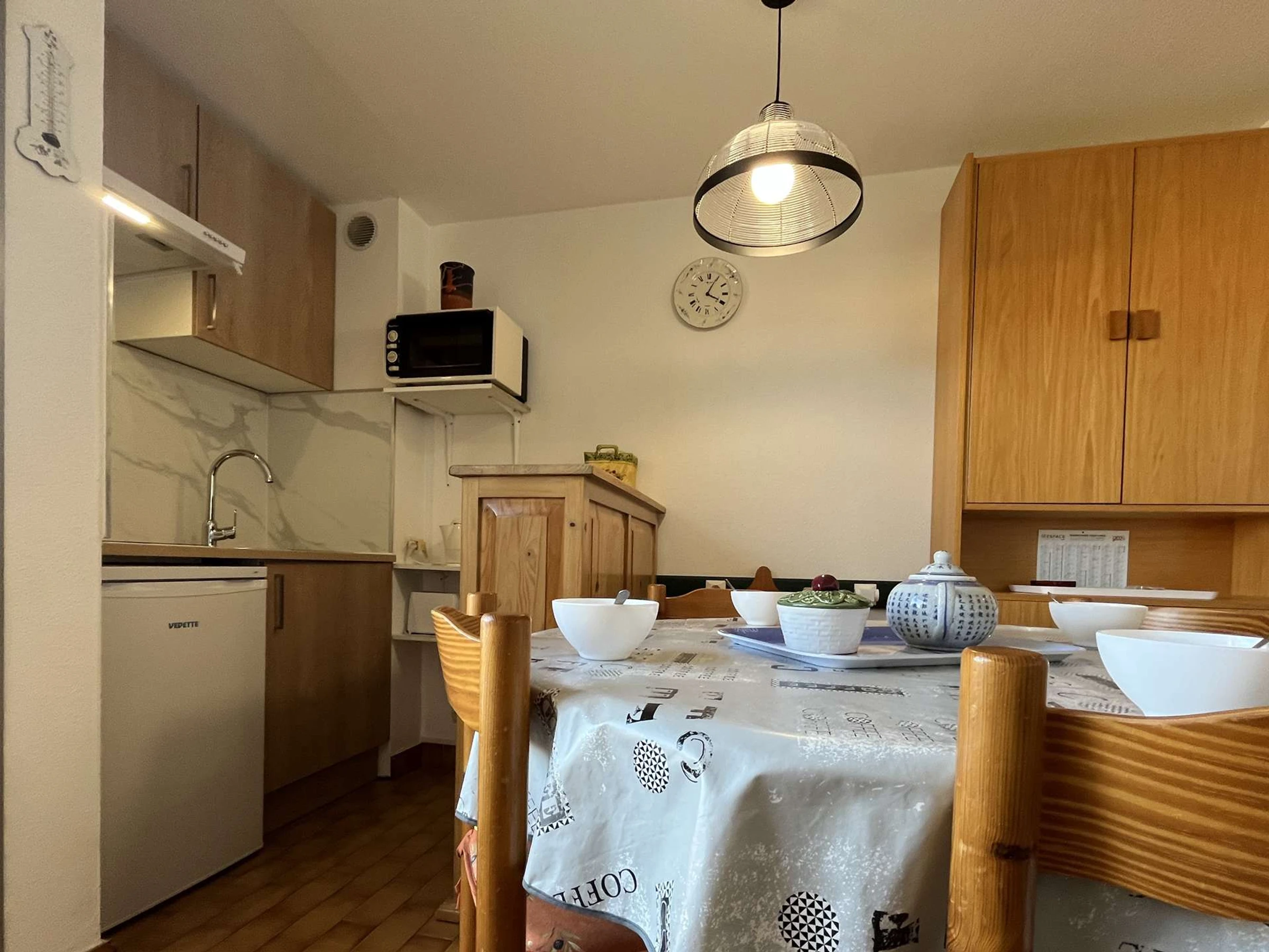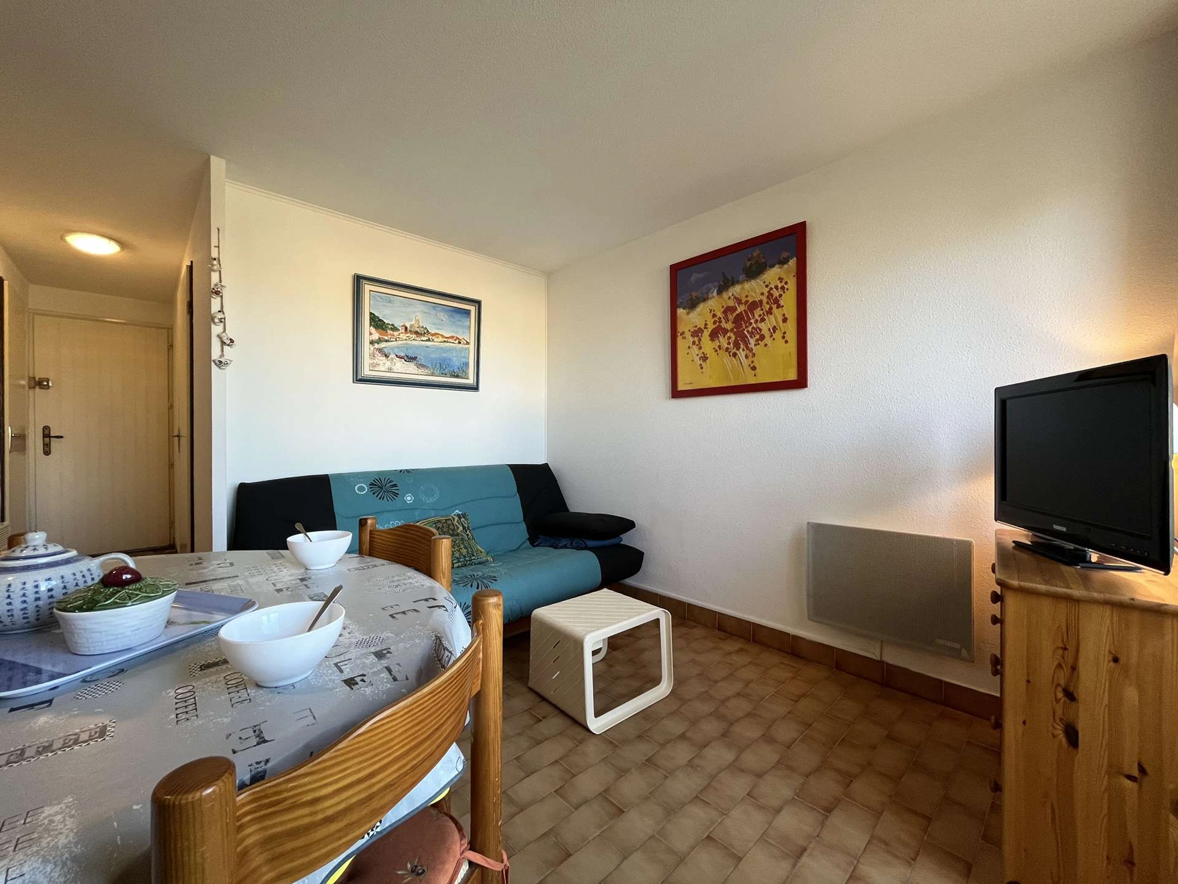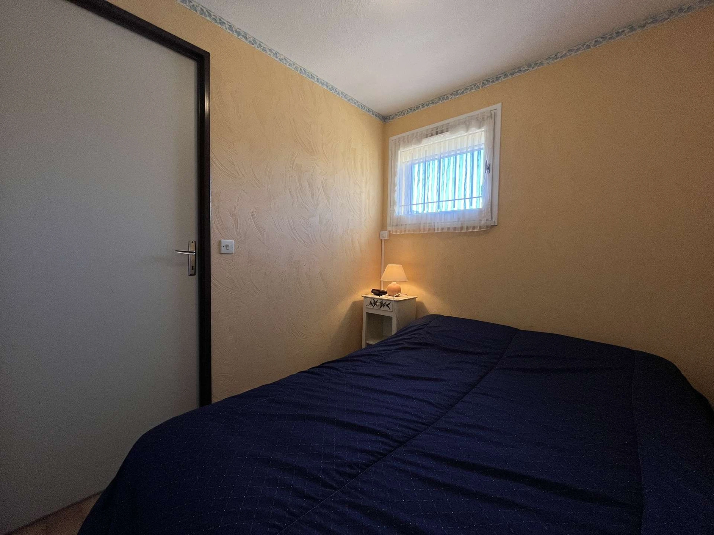 Située au 2e étage avec ascenseur, cette location de vacances se compose d’un séjour avec un canapé convertible deux places, télévision, une cuisine équipée ouverte, une petite chambre avec un lit double en 140 et un placard intégré.