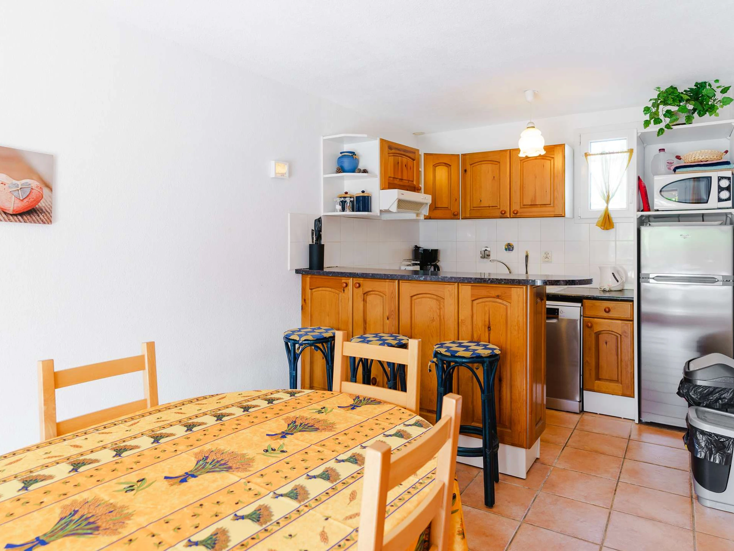 Rez-de-chaussée : espace repas avec cuisine (4 plaques vitrocéramiques, réfrigérateur+freezer, four, lave-vaisselle, micro-ondes); salon avec canapé; télévision (chaînes françaises et étrangères), radio internet et radio CD; lecteur DVD; WC.