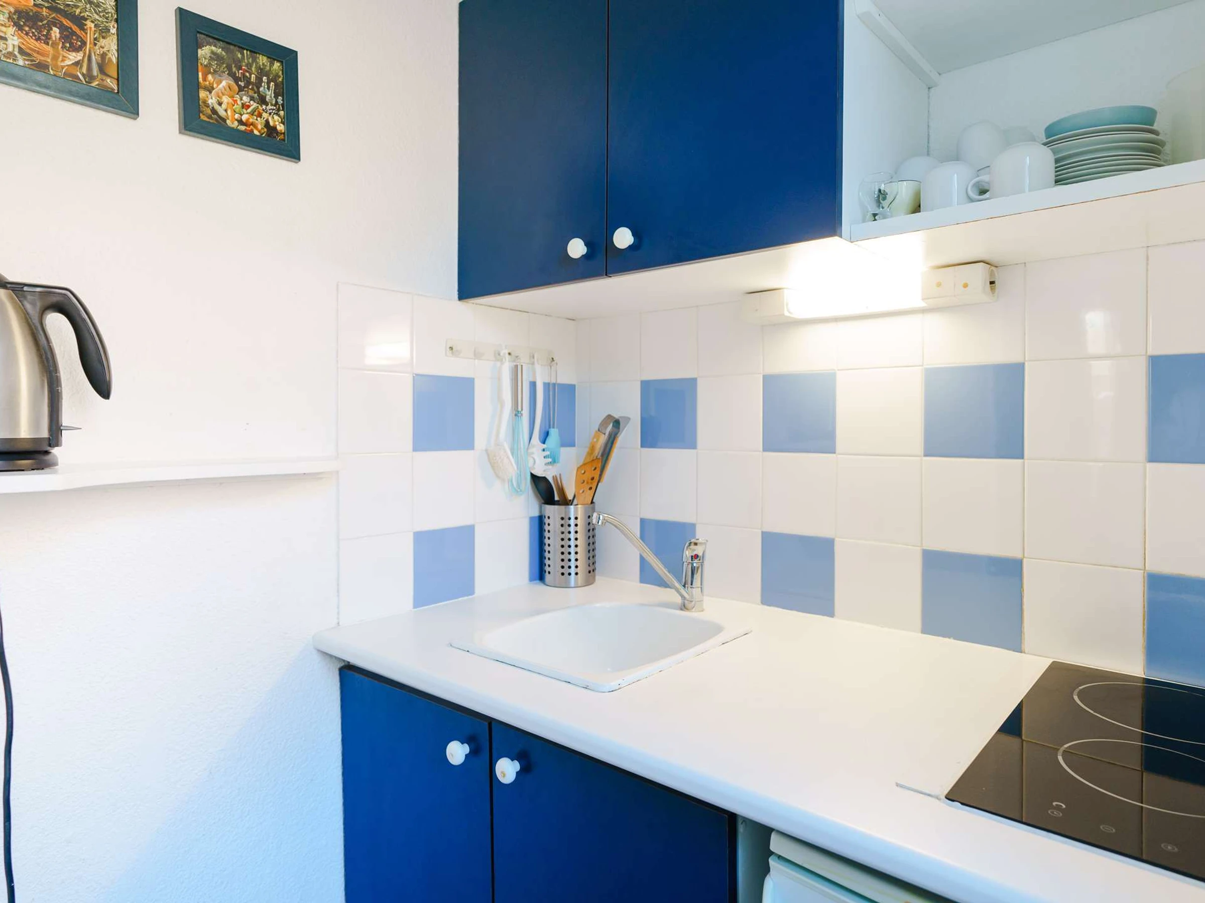 RDC: séjour avec canapé, coin cuisine (2 plaques vitro, micro-ondes, réfrigérateur, cafetière, bouilloire), une salle d'eau (douche) et W.-C. séparé.