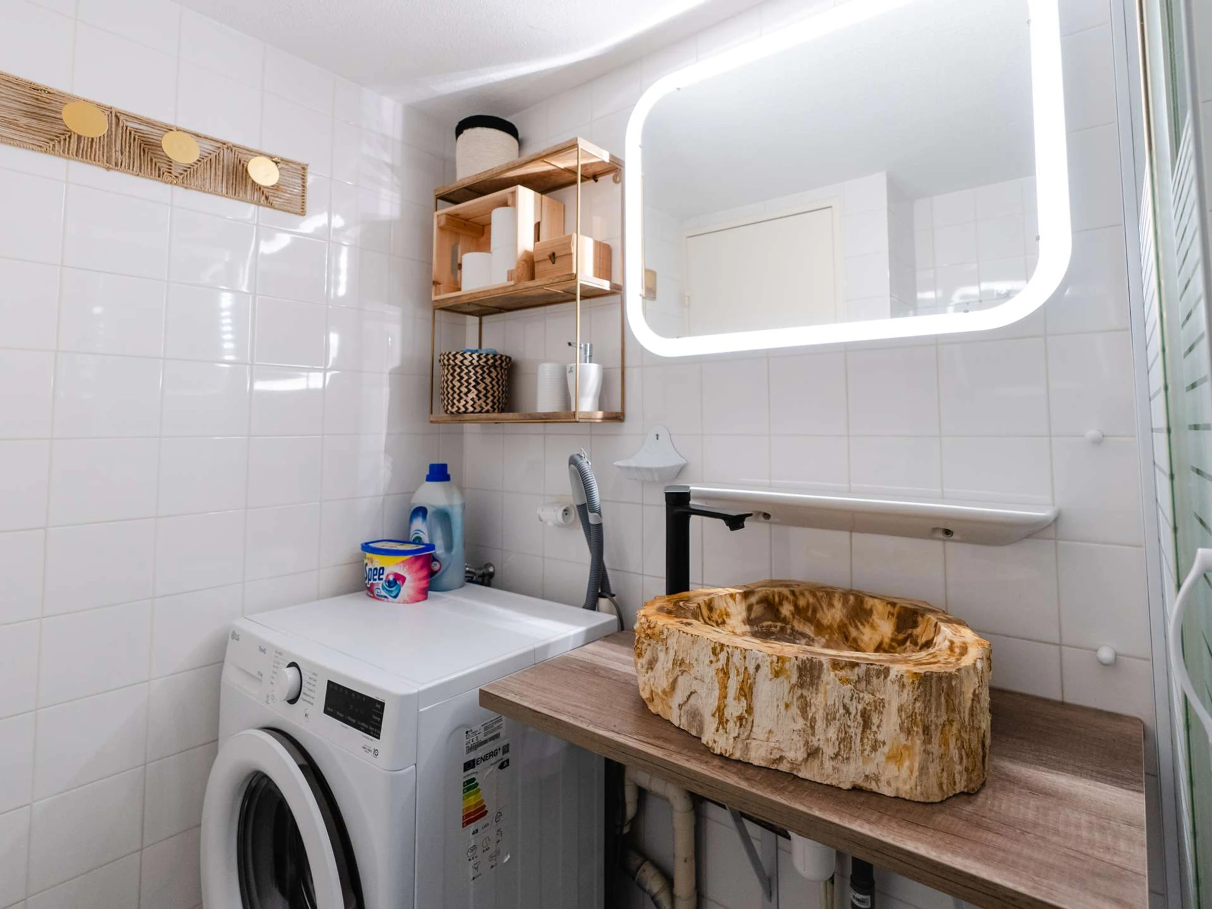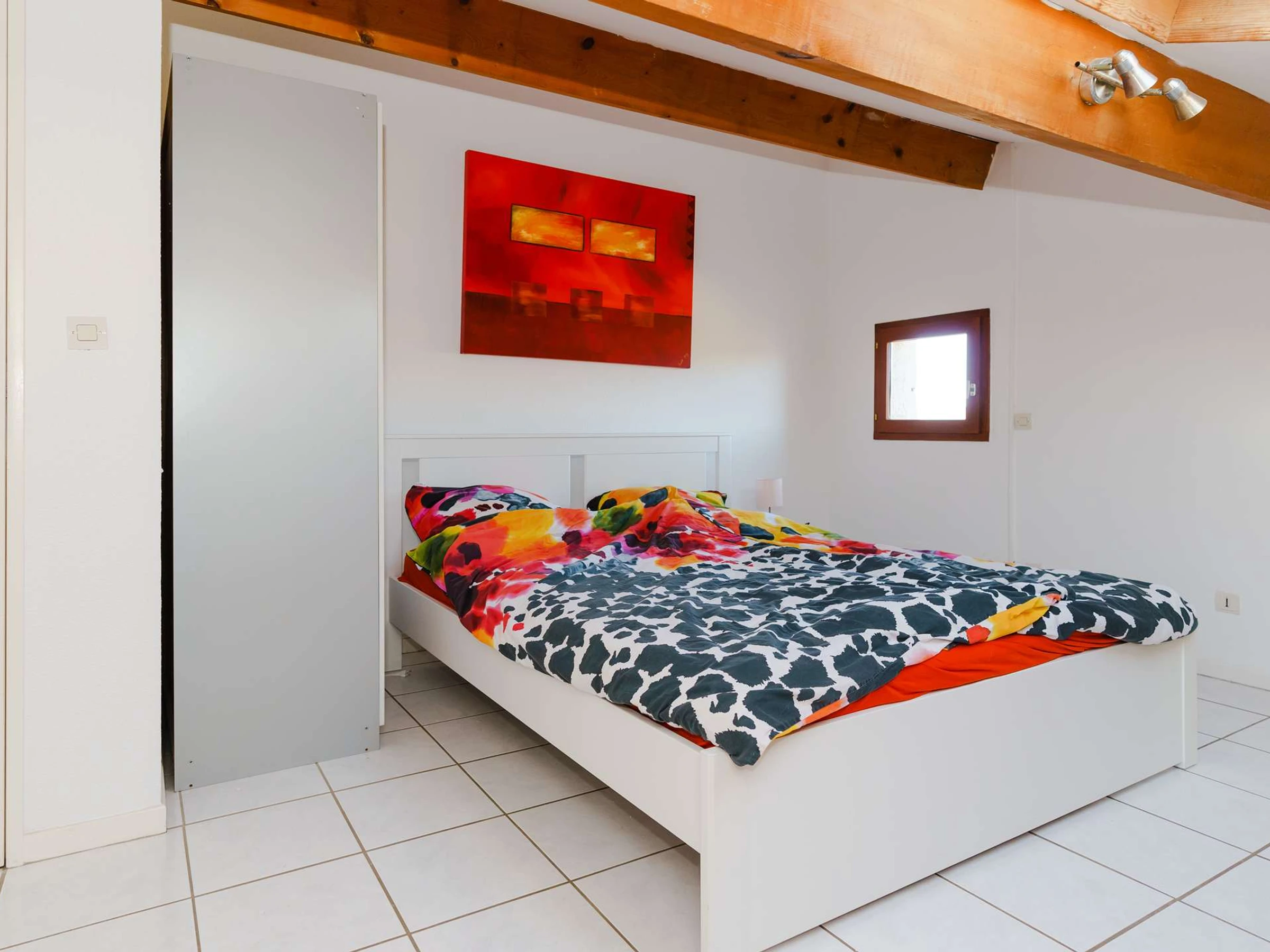Rez-de-chaussée: séjour dans la véranda, cuisine équipée (lave vaisselle, 4 plaques vitrocéramiques, réfrigérateur avec compartiment congélateur, four, micro-ondes), salle d'eau (douche), WC, lave linge. 1 chambre avec 1 lit double (140x200), deux petites couettes et un grand placard.