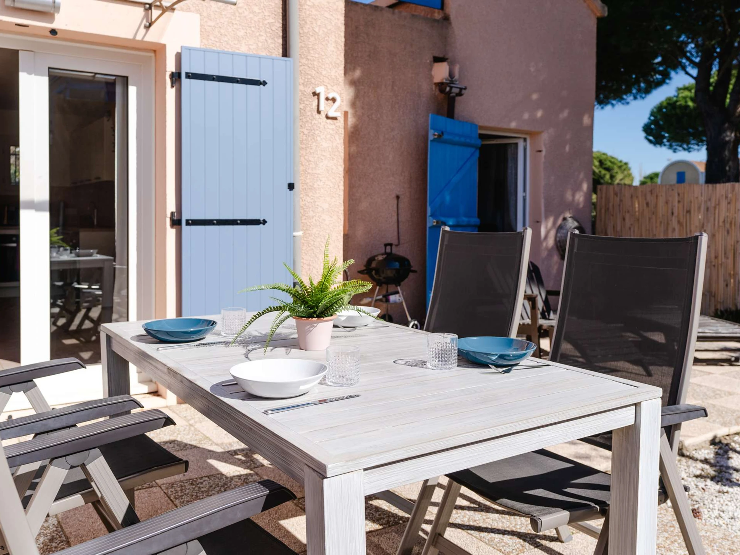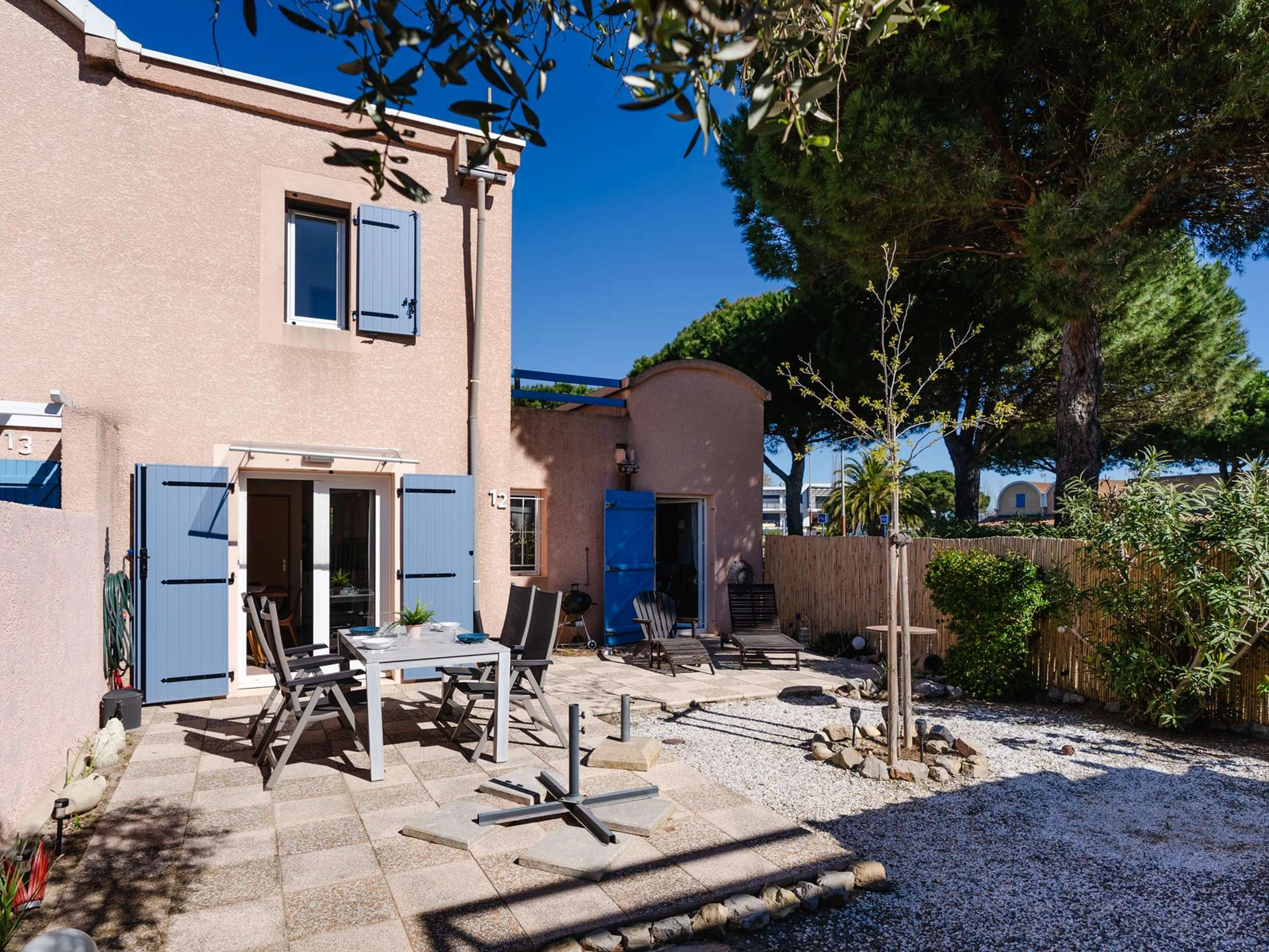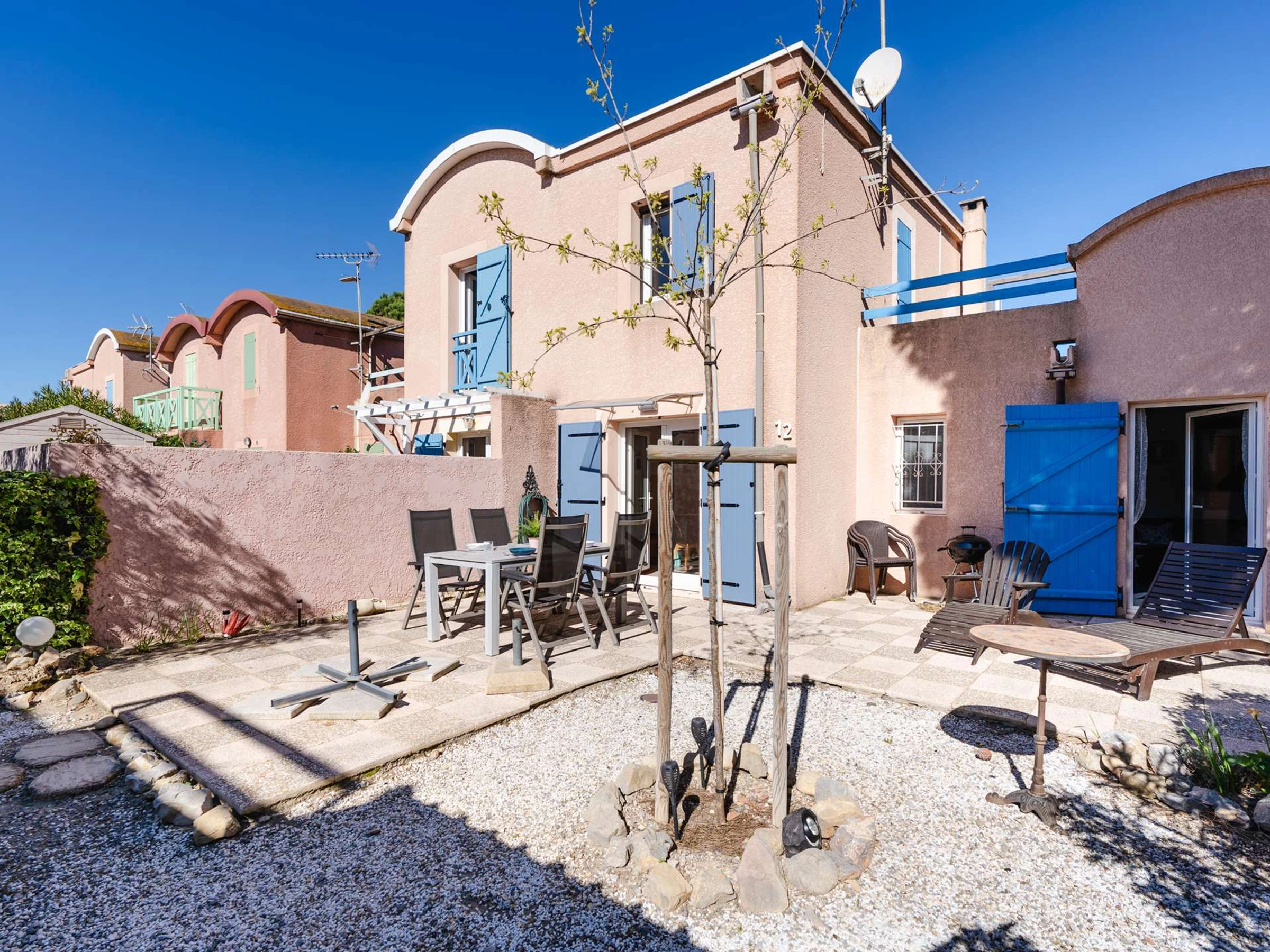 À Gruissan, village classé parmi les plus beaux de France, dans charmante résidence, à 150m de la Plage du Grazel, maison 3 pièces (2 chambres) avec grande terrasse. Parking privé clos (portail électrique) dans résidence. Capacité: 6 personnes. Les animaux ne sont pas autorisés.