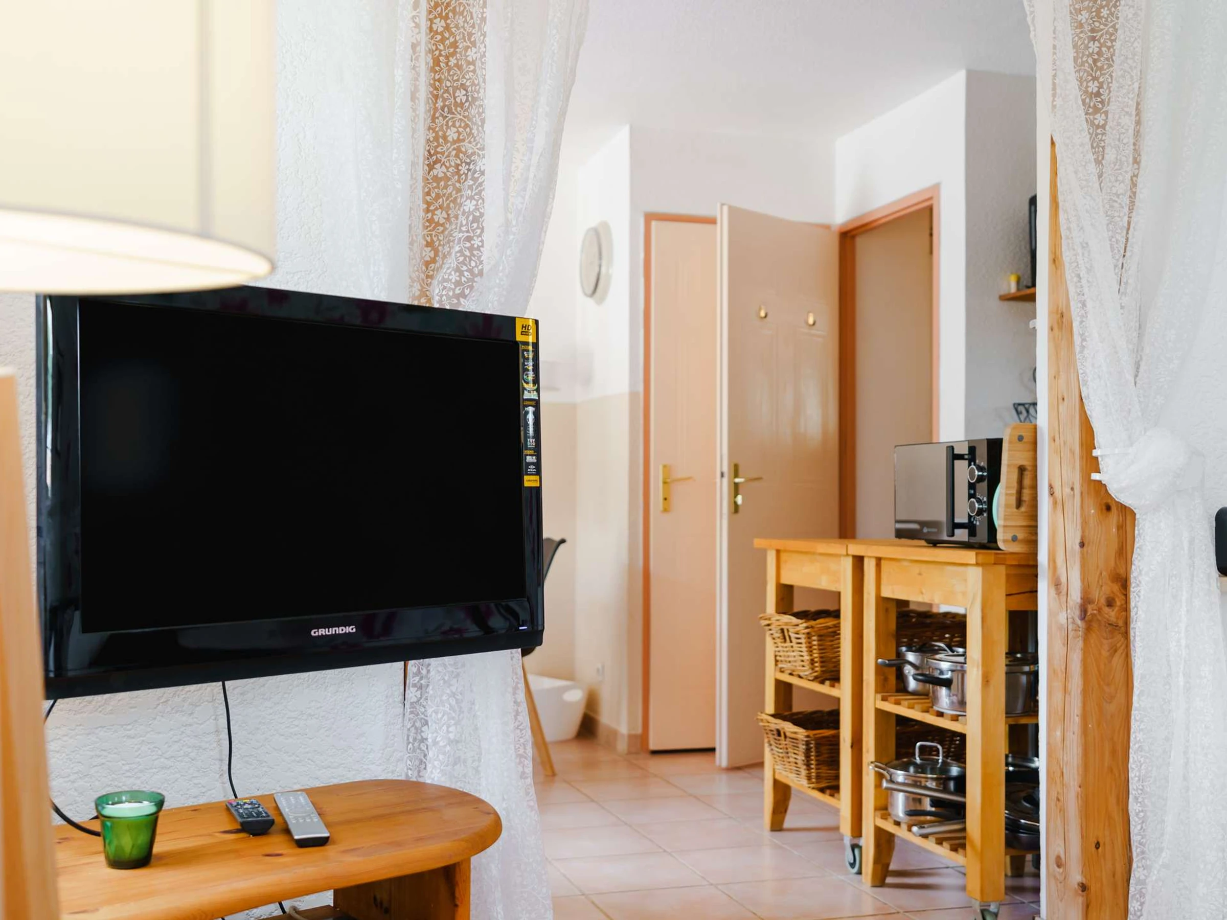 Rez-de chaussée: espace repas avec cuisine (2 plaques de cuisson induction, réfrigérateur et petit congélateur, four, micro-ondes, lave-linge, lave-vaisselle, cafetière à dosettes), salon avec canapé convertible et TV (chaines françaises et allemandes), une salle d'eau et un W.-C. séparés.