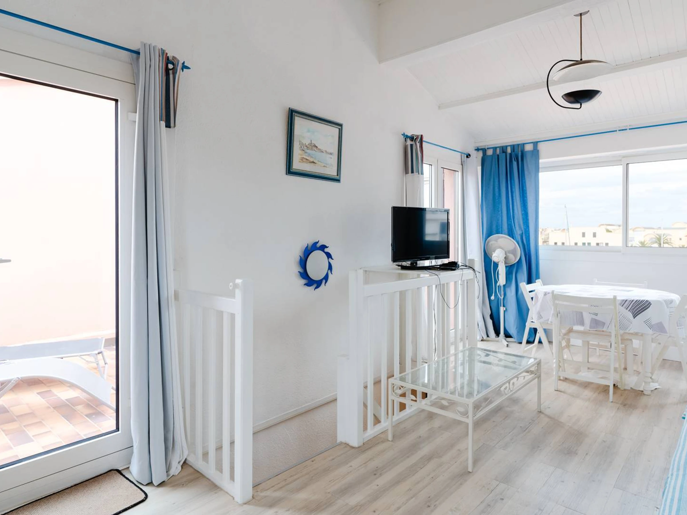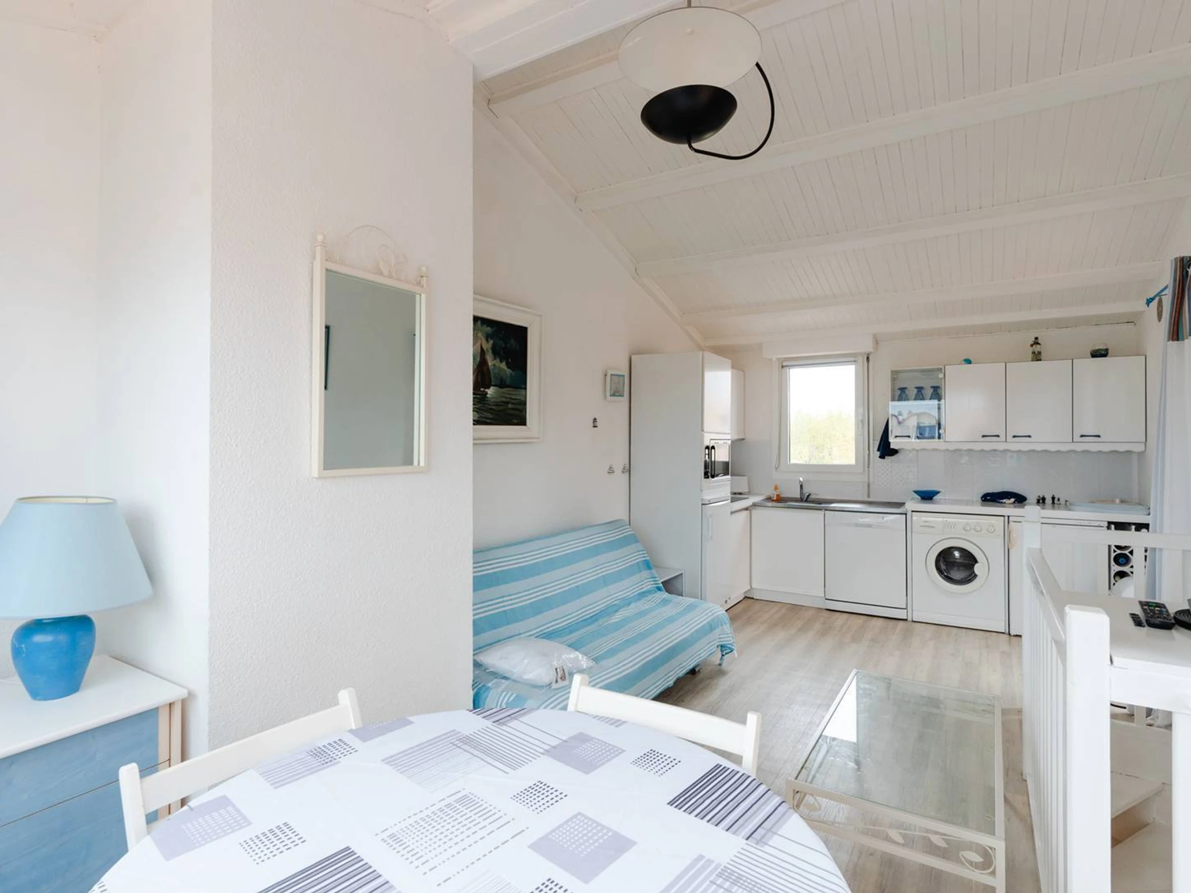 A l'étage, une grande pièce à vivre lumineuse avec un canapé-lit (140x190cm), TV (chaînes françaises), un coin-cuisine équipé (réfrigérateur, congélateur, plaque de cuisson, micro-ondes, lave vaisselle, cafetière, lave-linge) et une belle terrasse avec vue sur le port.