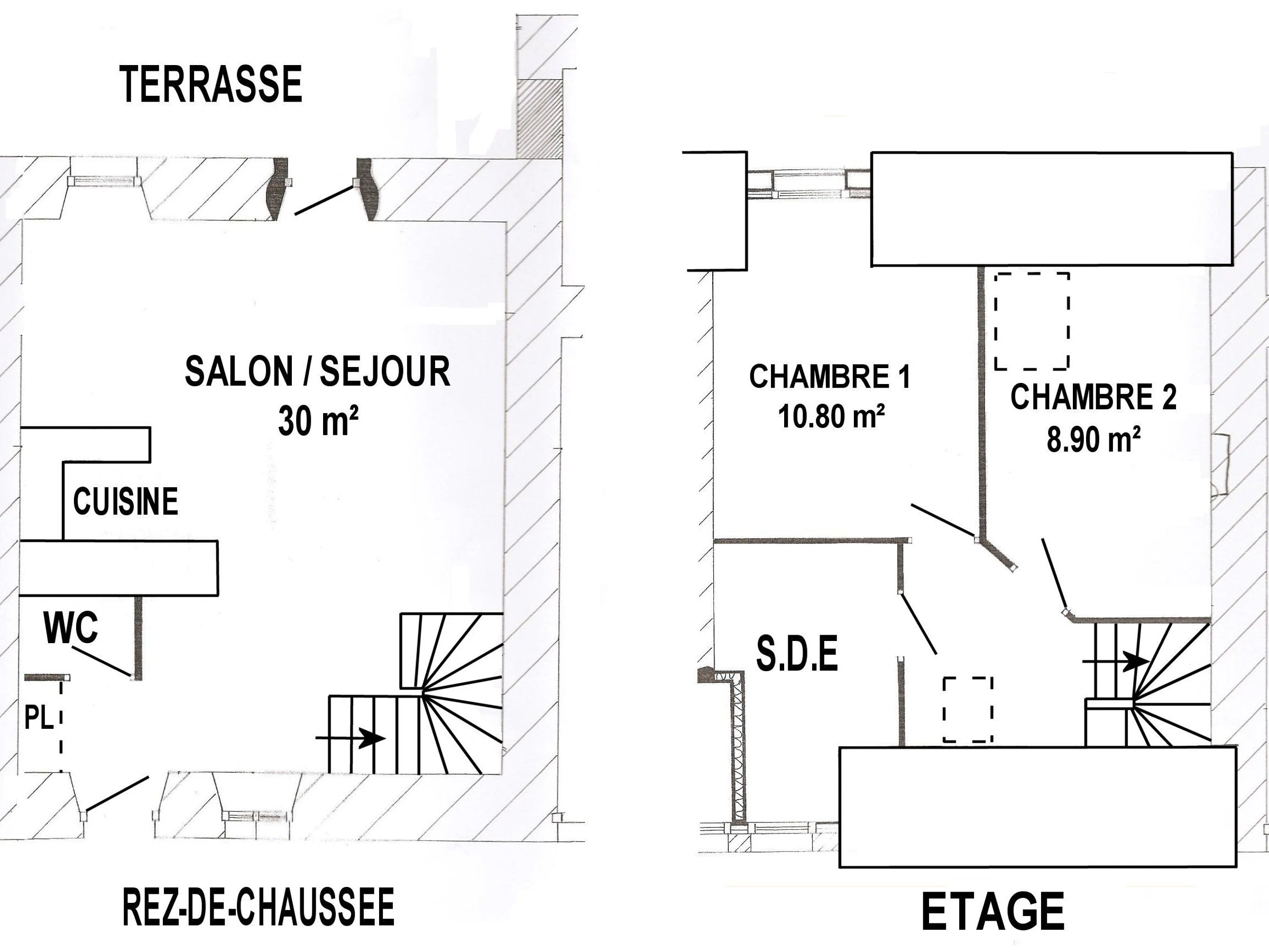 RDC: salon/séjour avec cuisine aménagée ouverte, WC indépendant.
