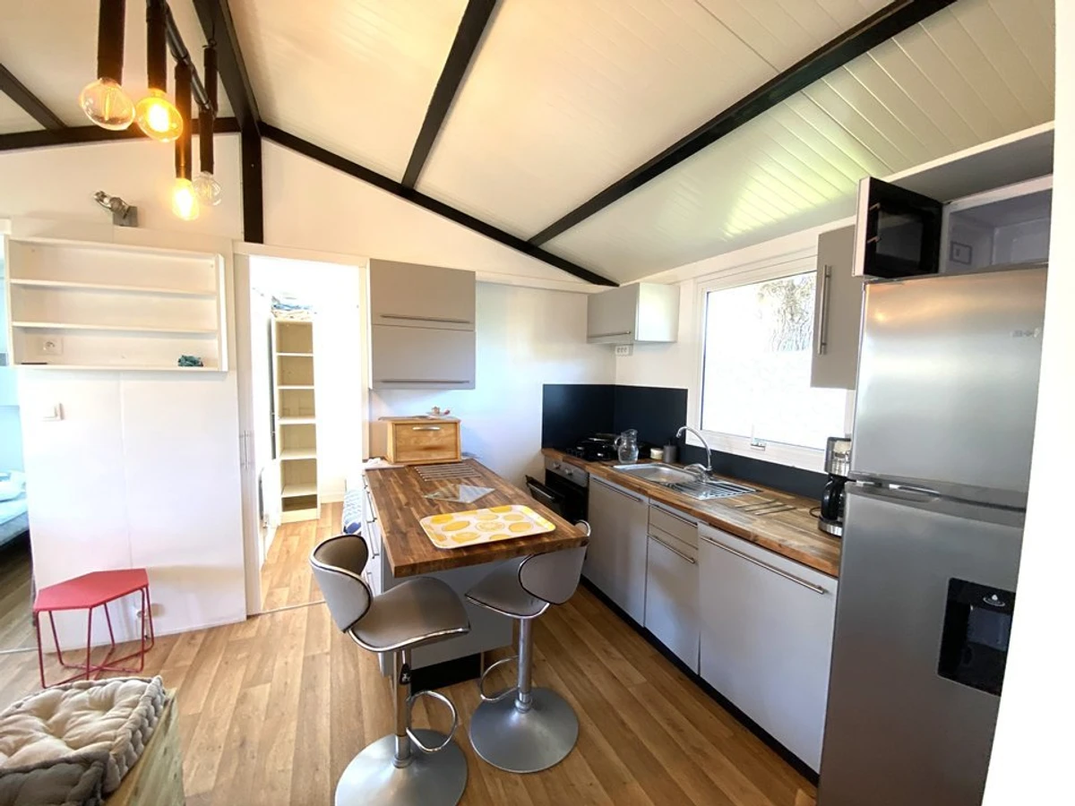 Equipement : Micro-ondes, mini-four électrique, réfrigérateur avec partie congélateur, bouilloire électrique, cafetière électrique, plaques de cuisson au gaz, lave vaisselle, télévision, barbecue.