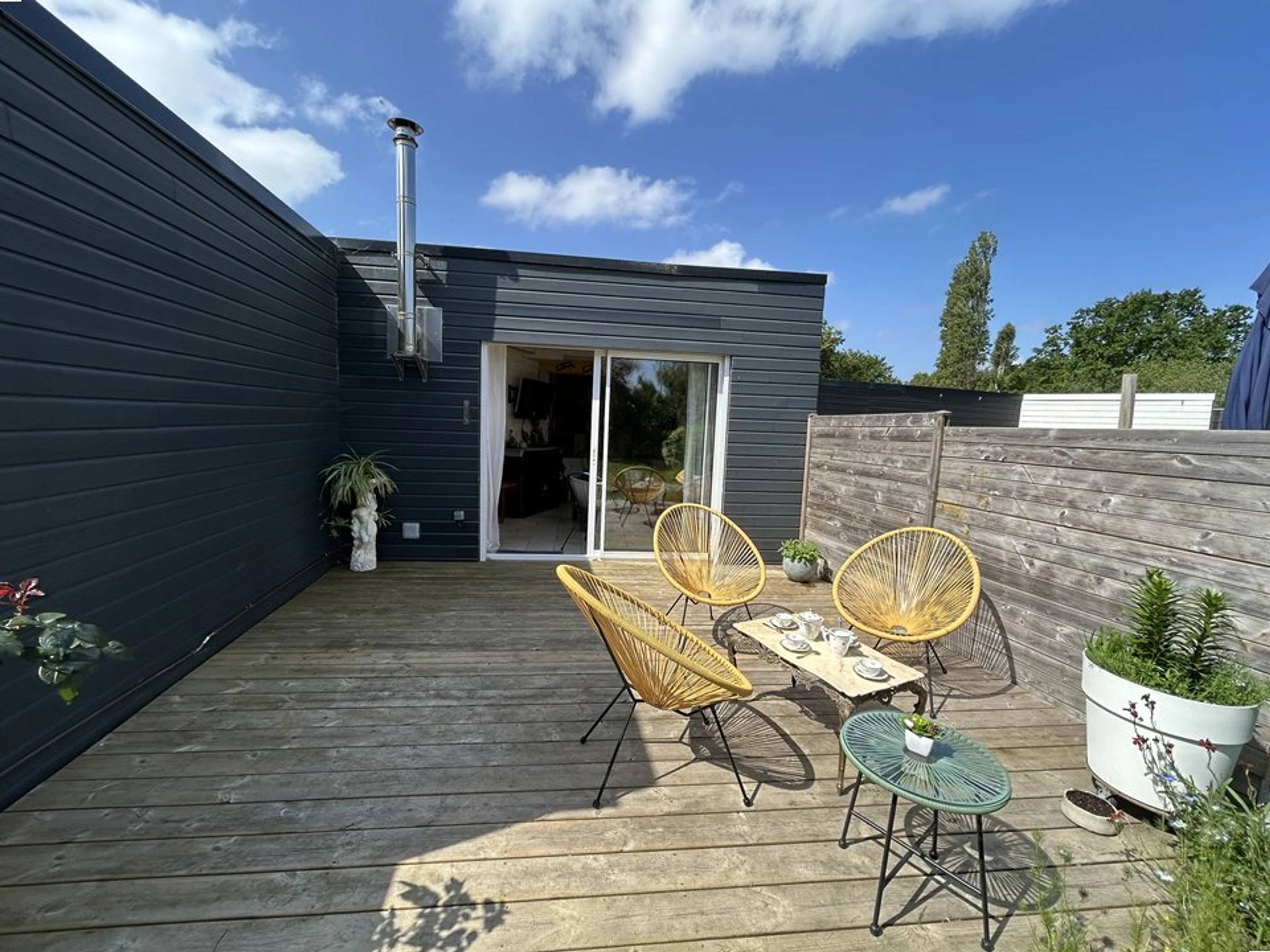 - Séjour avec baie vitrée donnant sur une terrasse bois de 20 m2, équipée de salon de jardin