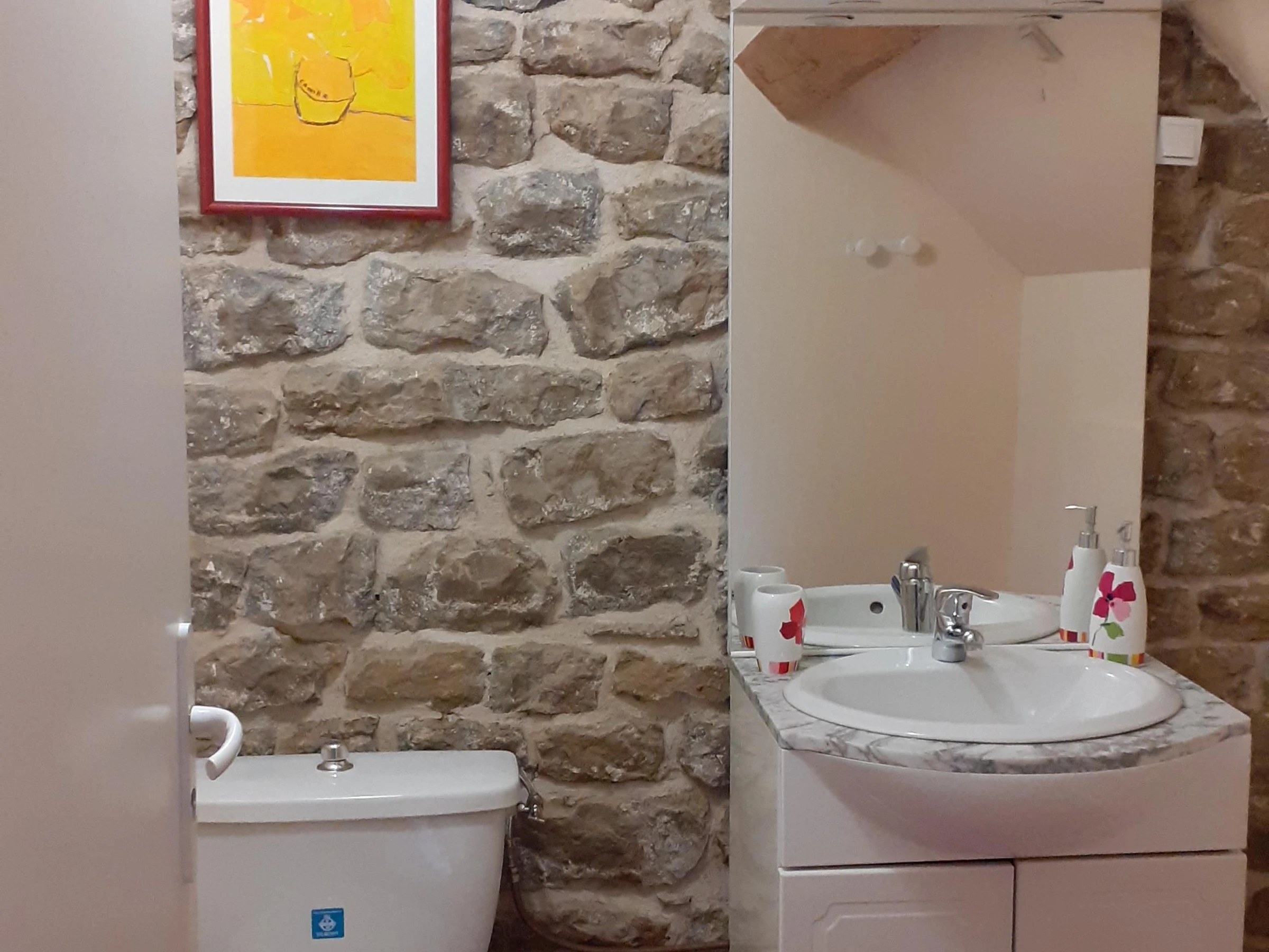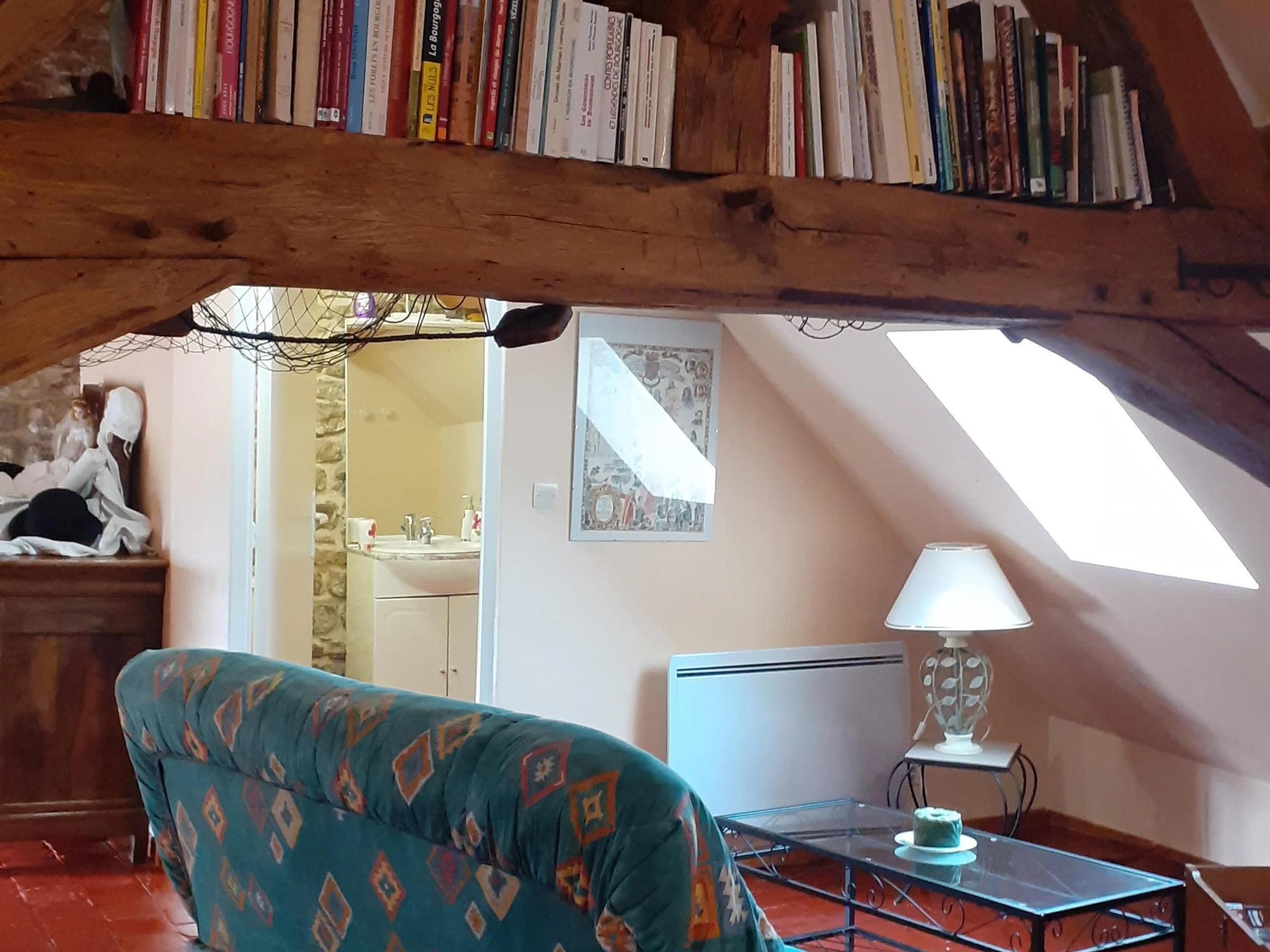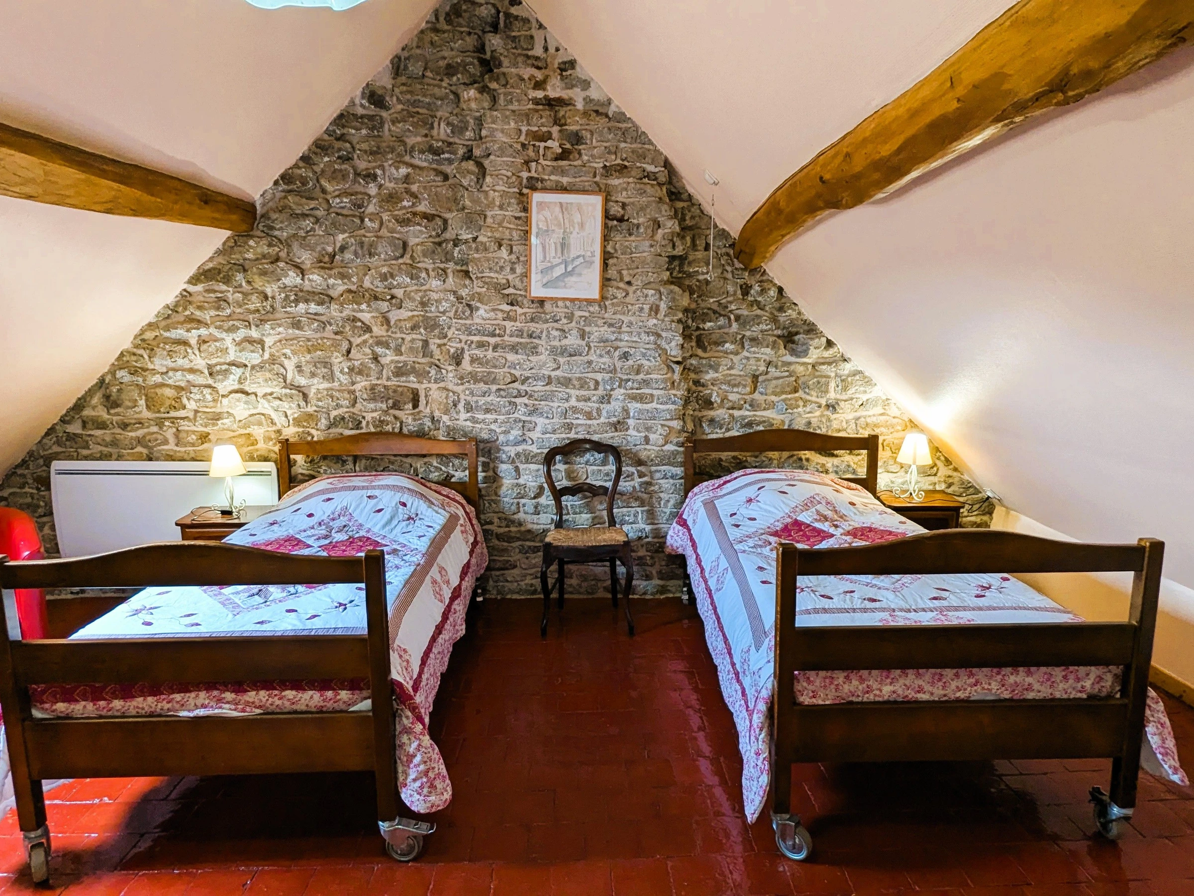 Par l'extérieur, vous accédez à l'ancien grenier à grains aménagé en chambre (2 lits 90 et 1 lit bébé), salle d'eau avec WC et salon de lecture.