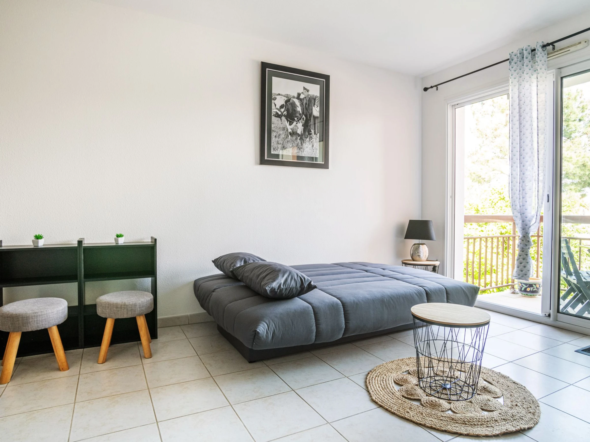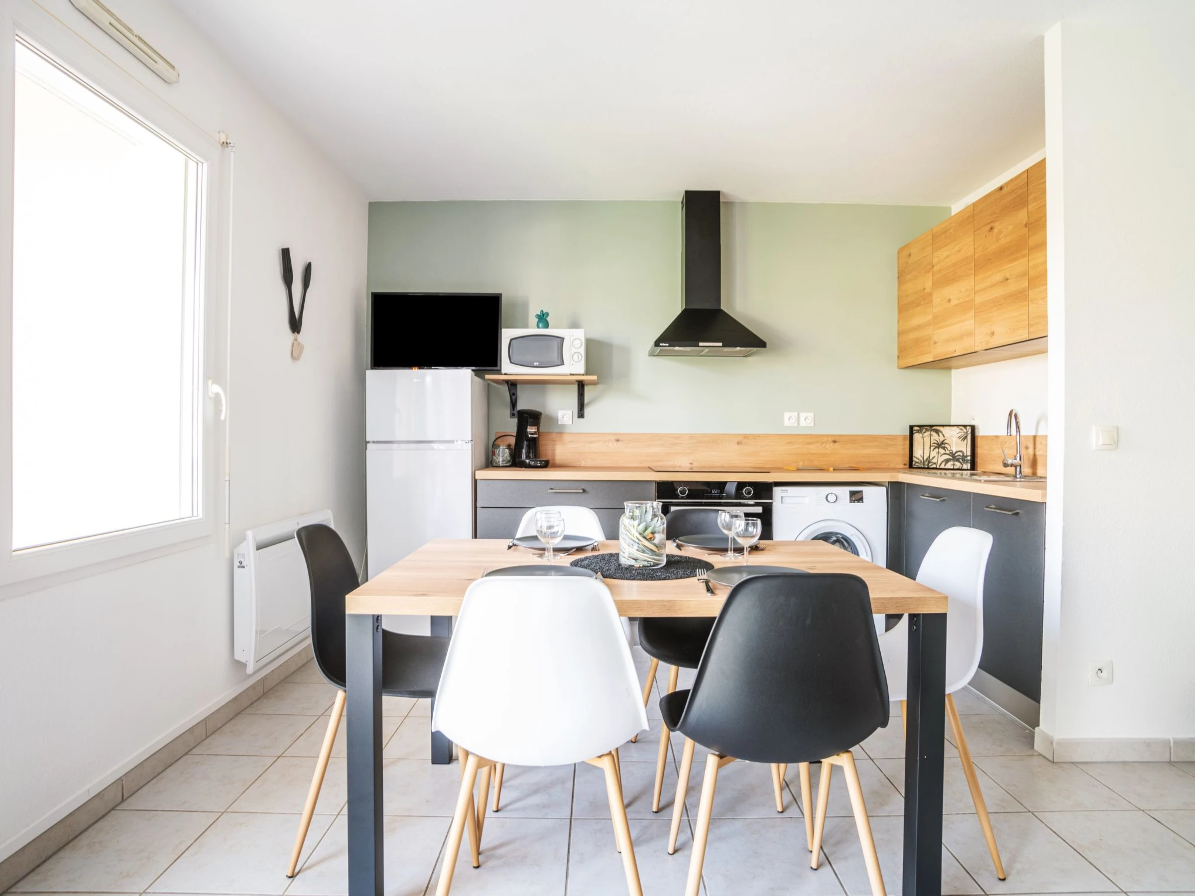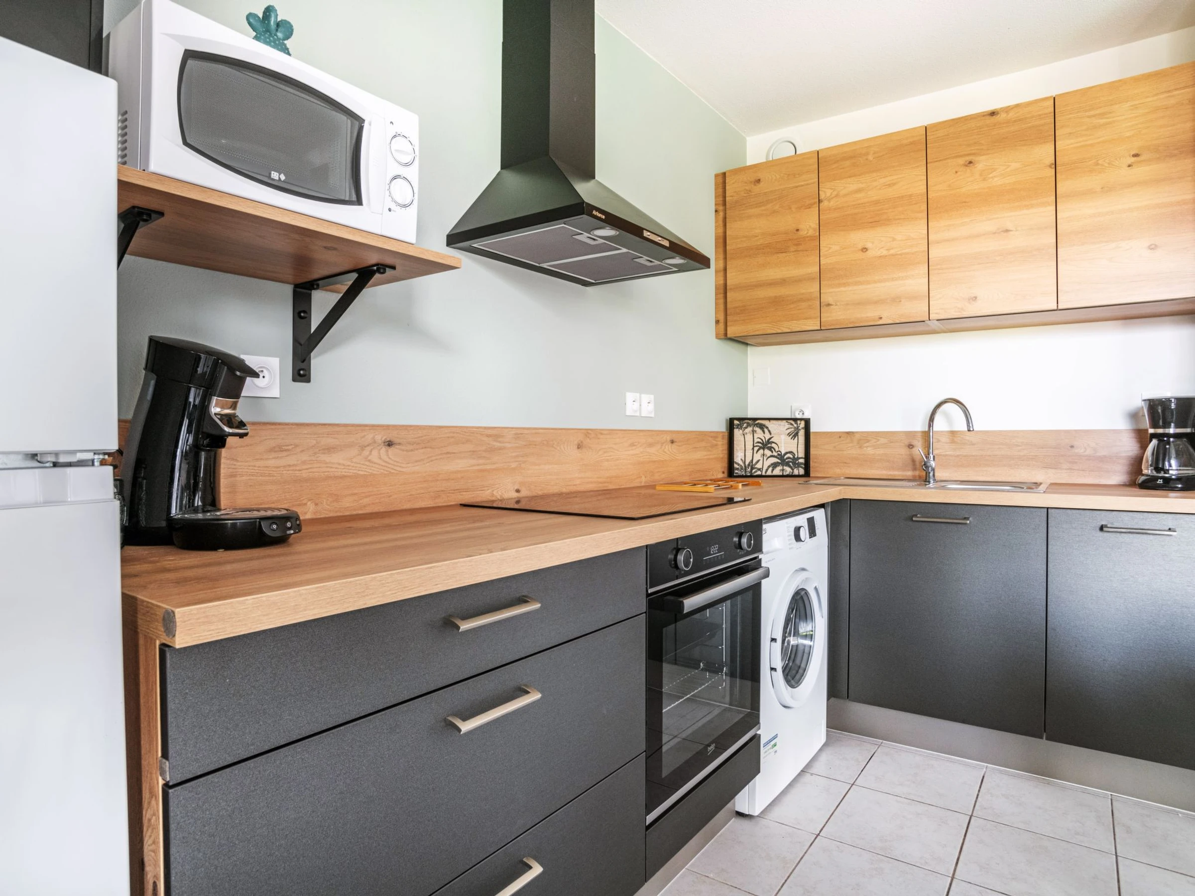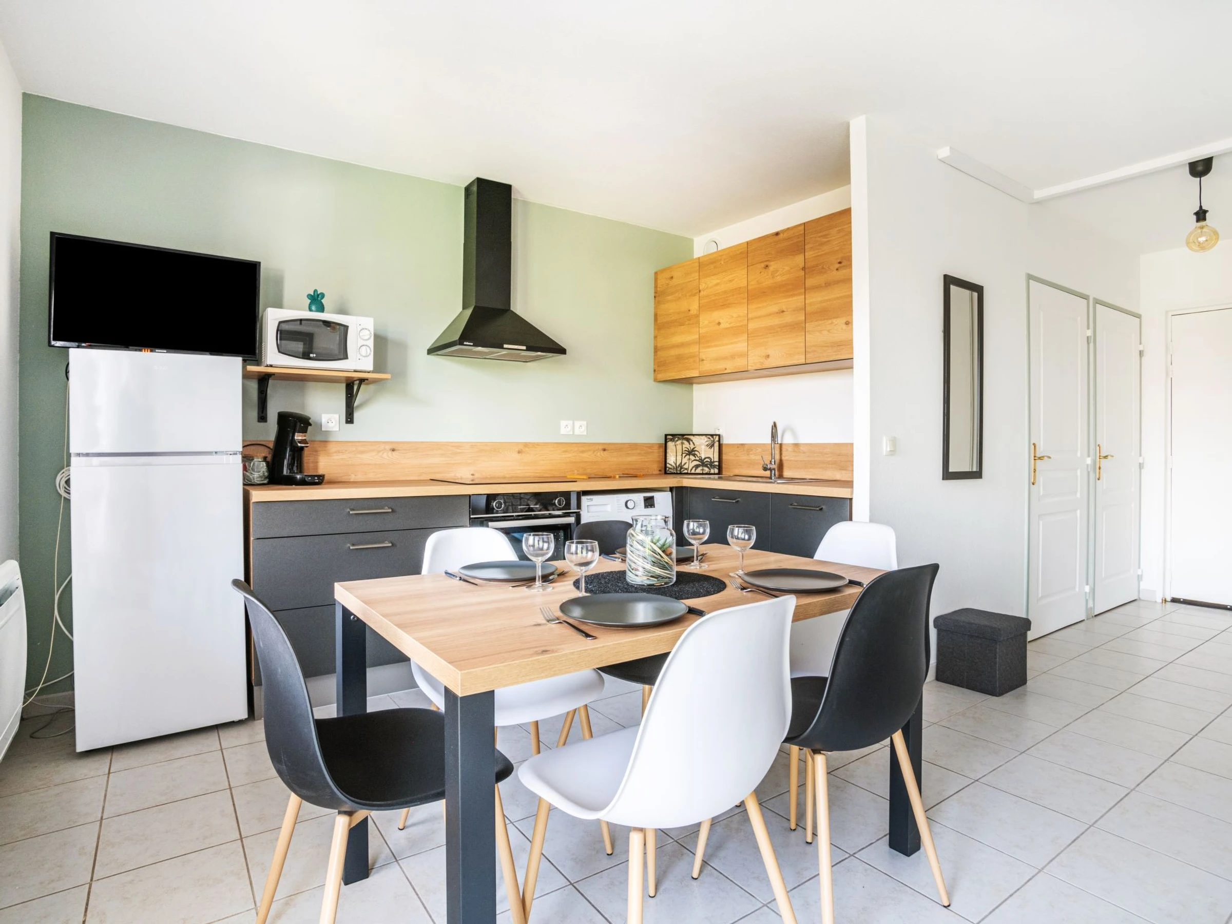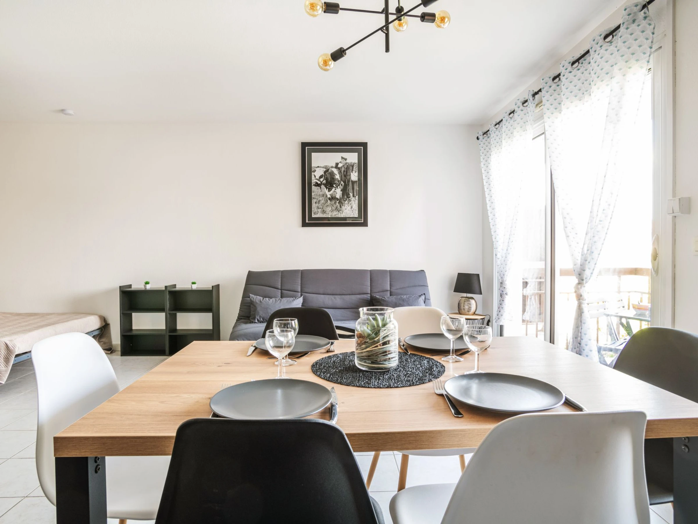 Studio 33 m2 au 1er étage. Aménagement confortable et agréable: séjour/salle à manger avec 1 divan-lit double (1 x 140 cm, longueur 190 cm), TV (écran plat). Sortie sur la terrasse. Cabine avec 1 grand-lit (1 x 140 cm, longueur 190 cm). Cuisine ouverte (four, lave-vaisselle, 2 plaques vitrocéramiques, grille-pain, bouilloire électrique, four micro-ondes, congélateur, cafetière électrique, Capsules pour machine à café (Senseo) (NON INCLUSES)). Douche, WC séparé. Chauffage électrique. Terrasse 5 m2. Meubles de terrasse. A disposition: lave-linge, sèche-cheveux. Internet (Connexion WIFI, gratuit). Place de parking No 37. Veuillez noter: détecteur de fumée.