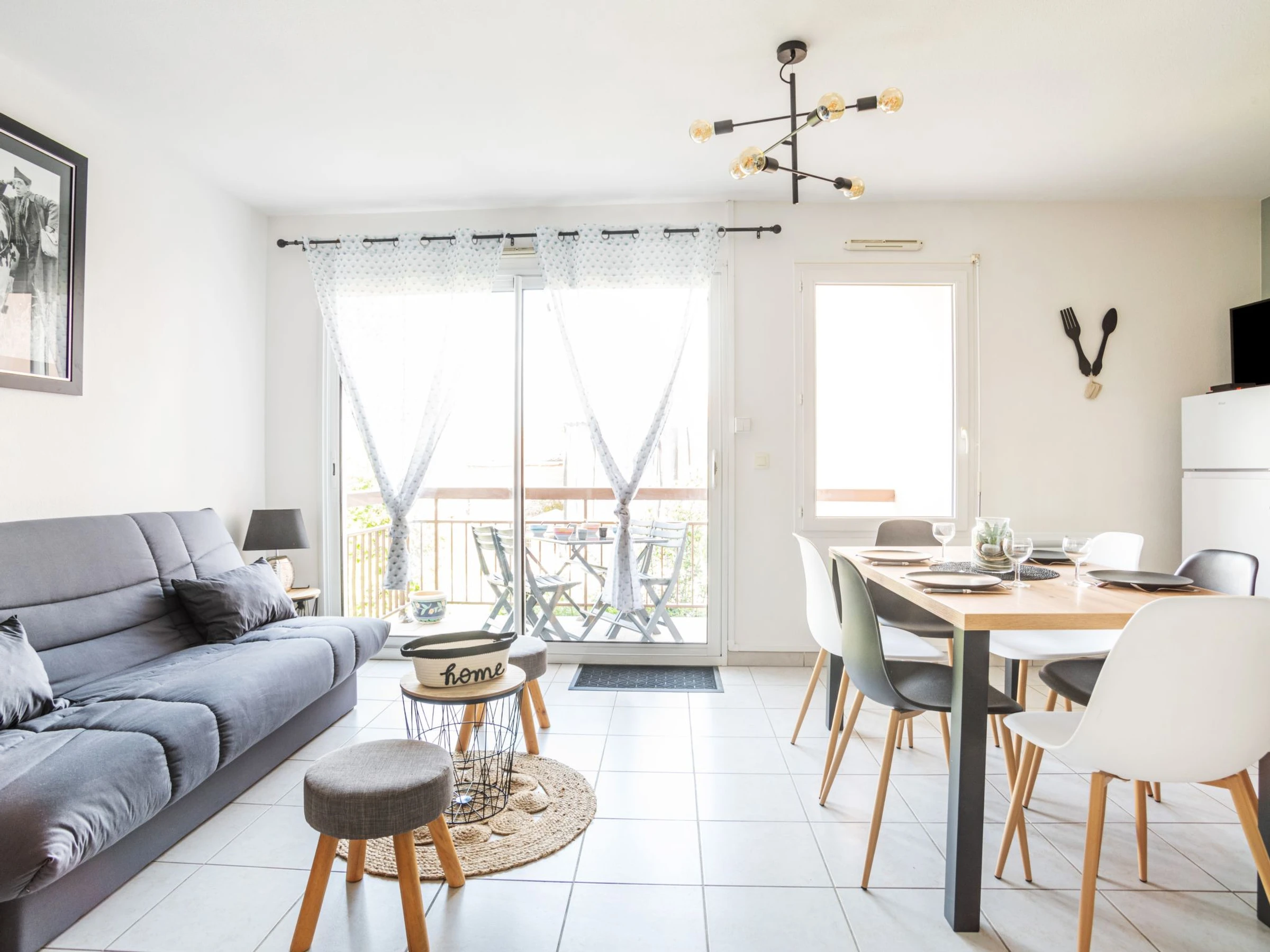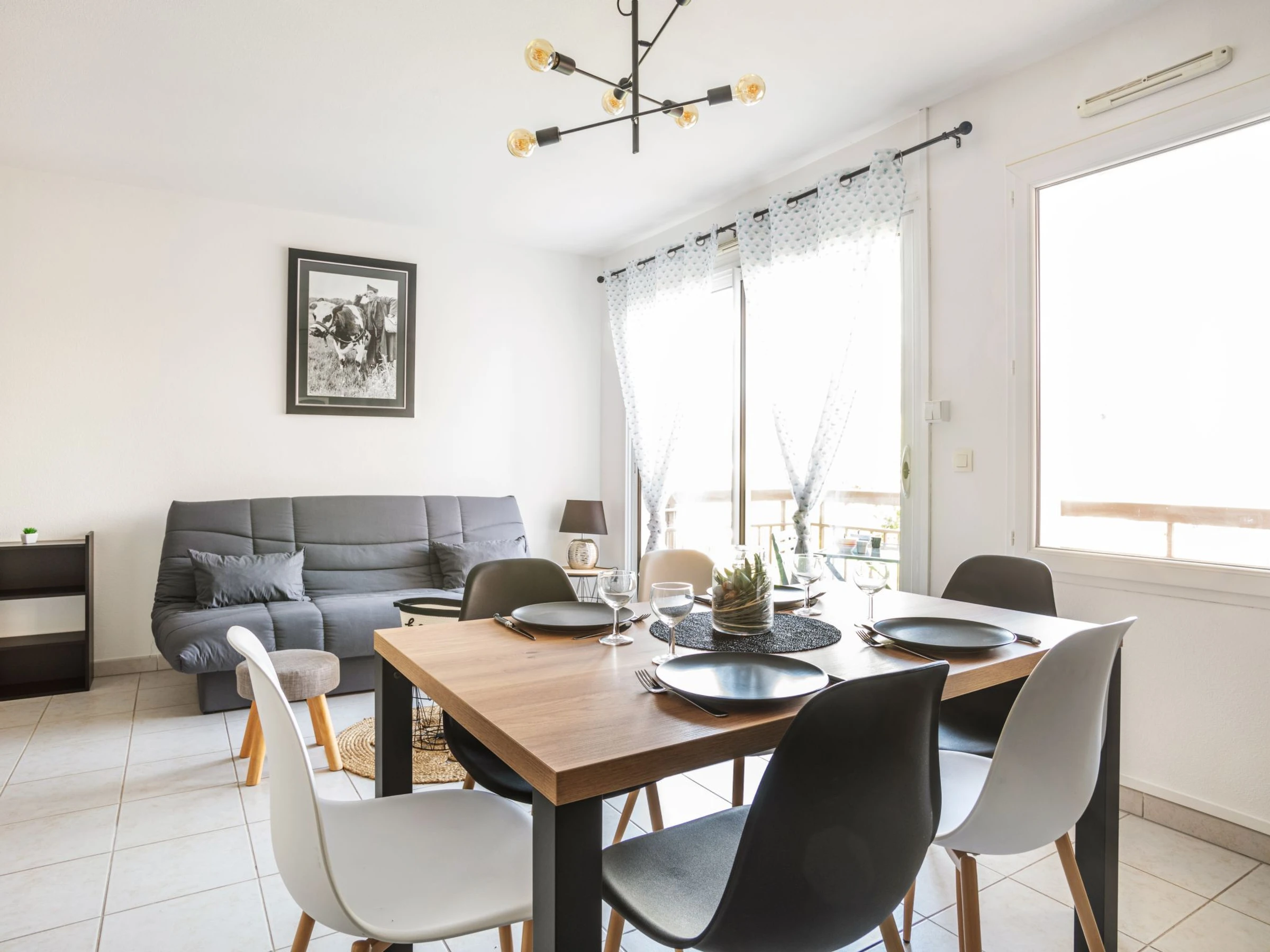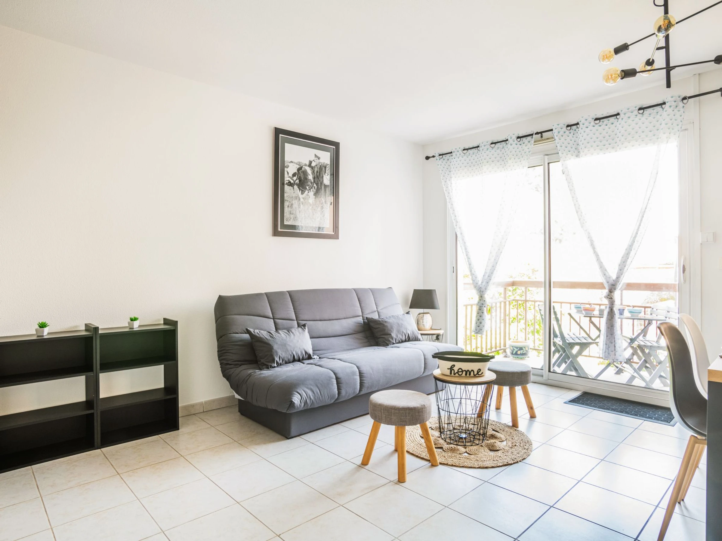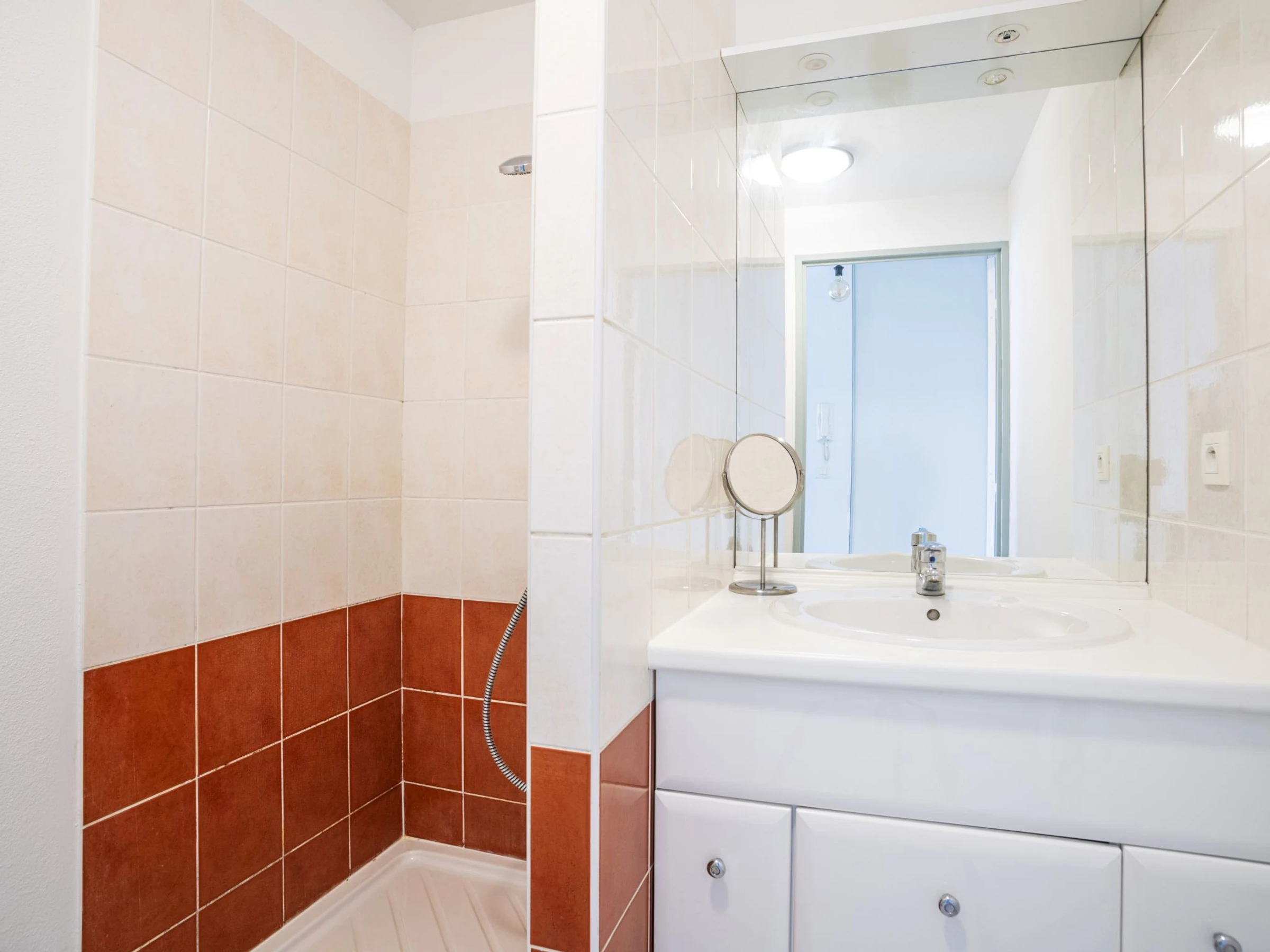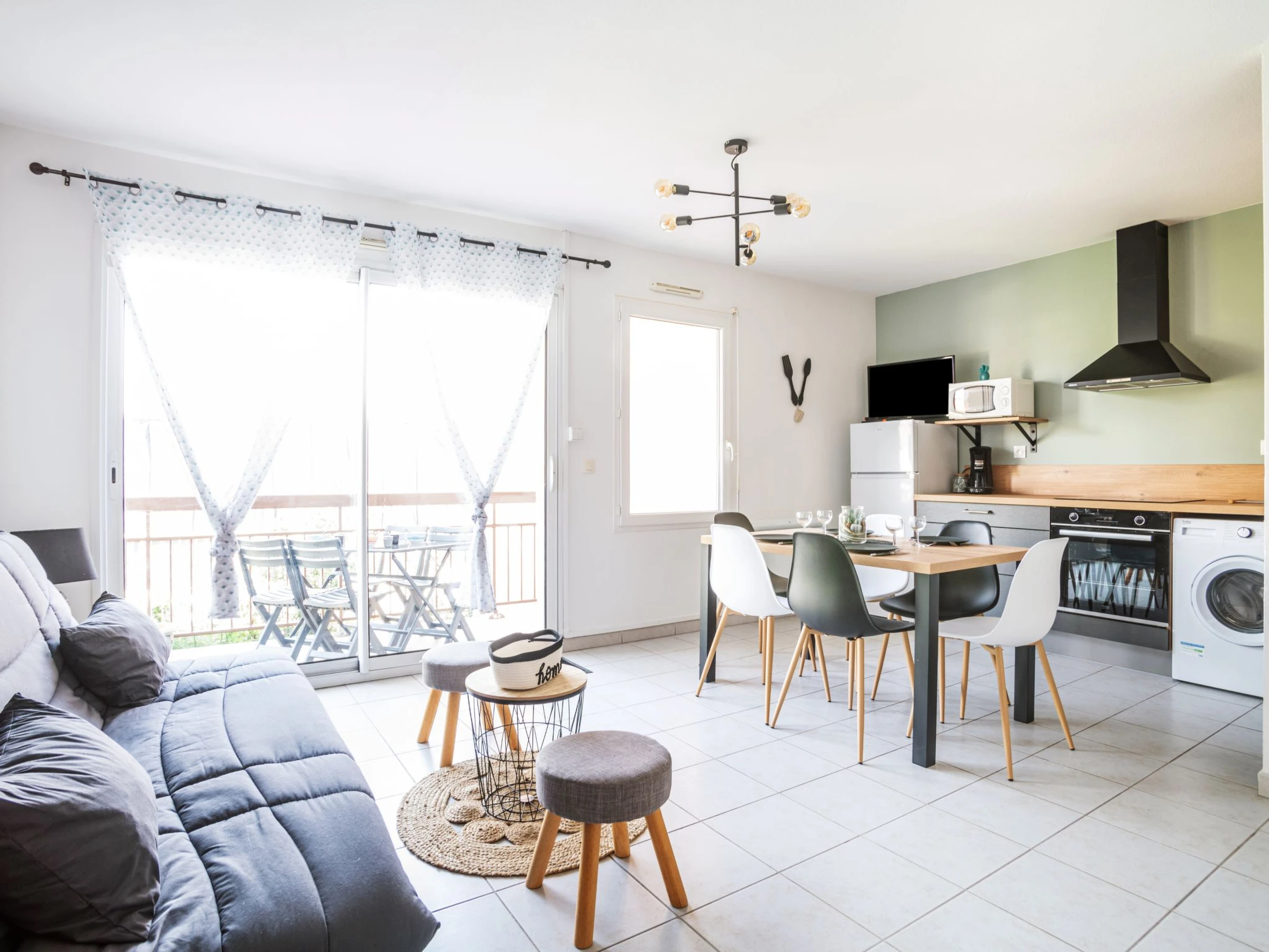 Studio 33 m2 au 1er étage. Aménagement confortable et agréable: séjour/salle à manger avec 1 divan-lit double (1 x 140 cm, longueur 190 cm), TV (écran plat). Sortie sur la terrasse. Cabine avec 1 grand-lit (1 x 140 cm, longueur 190 cm). Cuisine ouverte (four, lave-vaisselle, 2 plaques vitrocéramiques, grille-pain, bouilloire électrique, four micro-ondes, congélateur, cafetière électrique, Capsules pour machine à café (Senseo) (NON INCLUSES)). Douche, WC séparé. Chauffage électrique. Terrasse 5 m2. Meubles de terrasse. A disposition: lave-linge, sèche-cheveux. Internet (Connexion WIFI, gratuit). Place de parking No 37. Veuillez noter: détecteur de fumée.