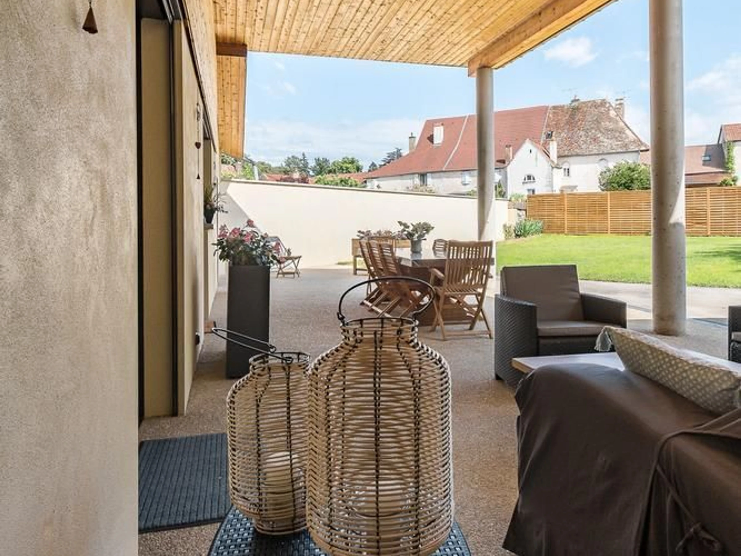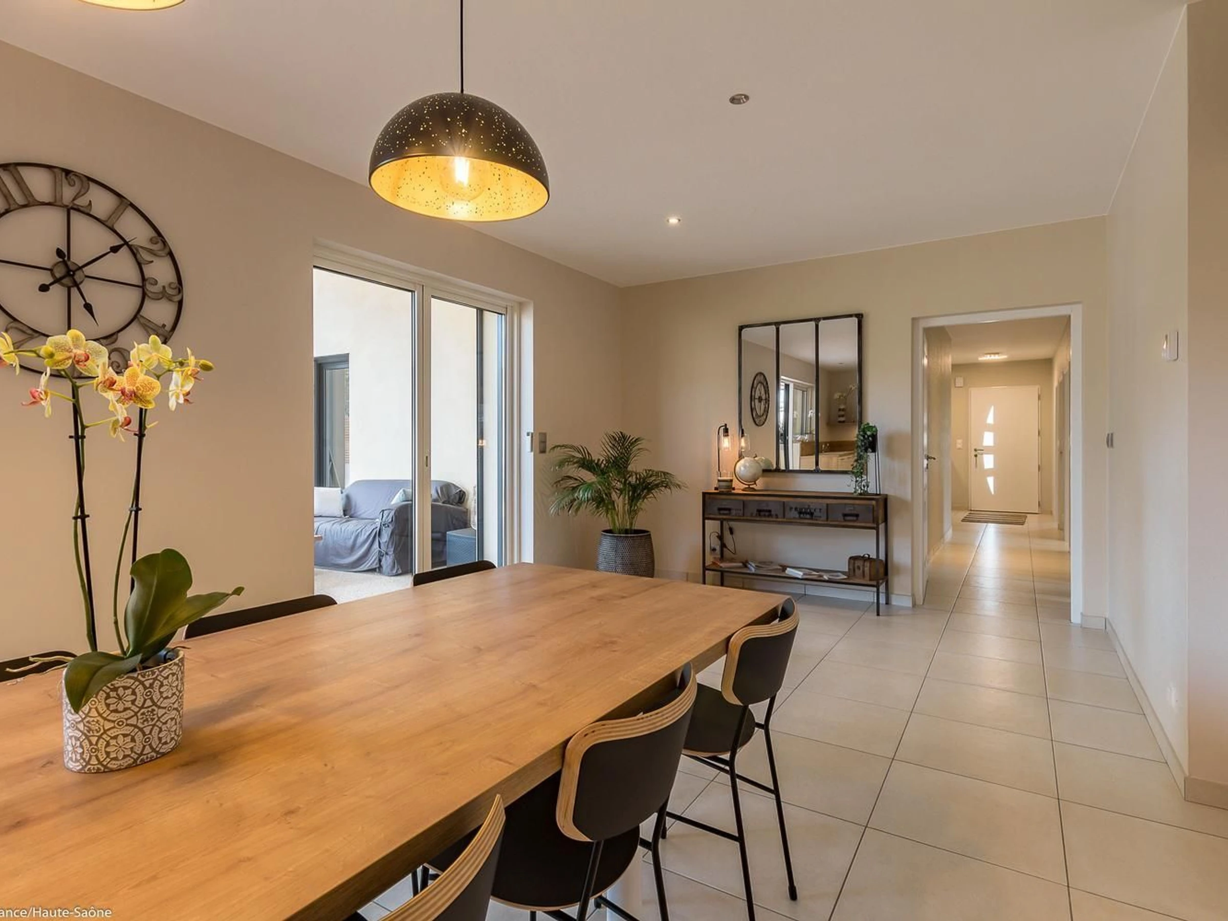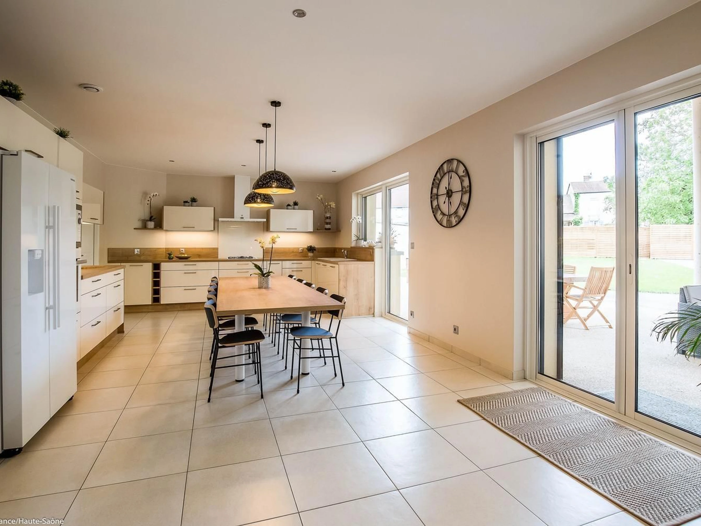 Cuisine équipée et séjour avec baies vitrées donnant sur la terrasse et le jardin