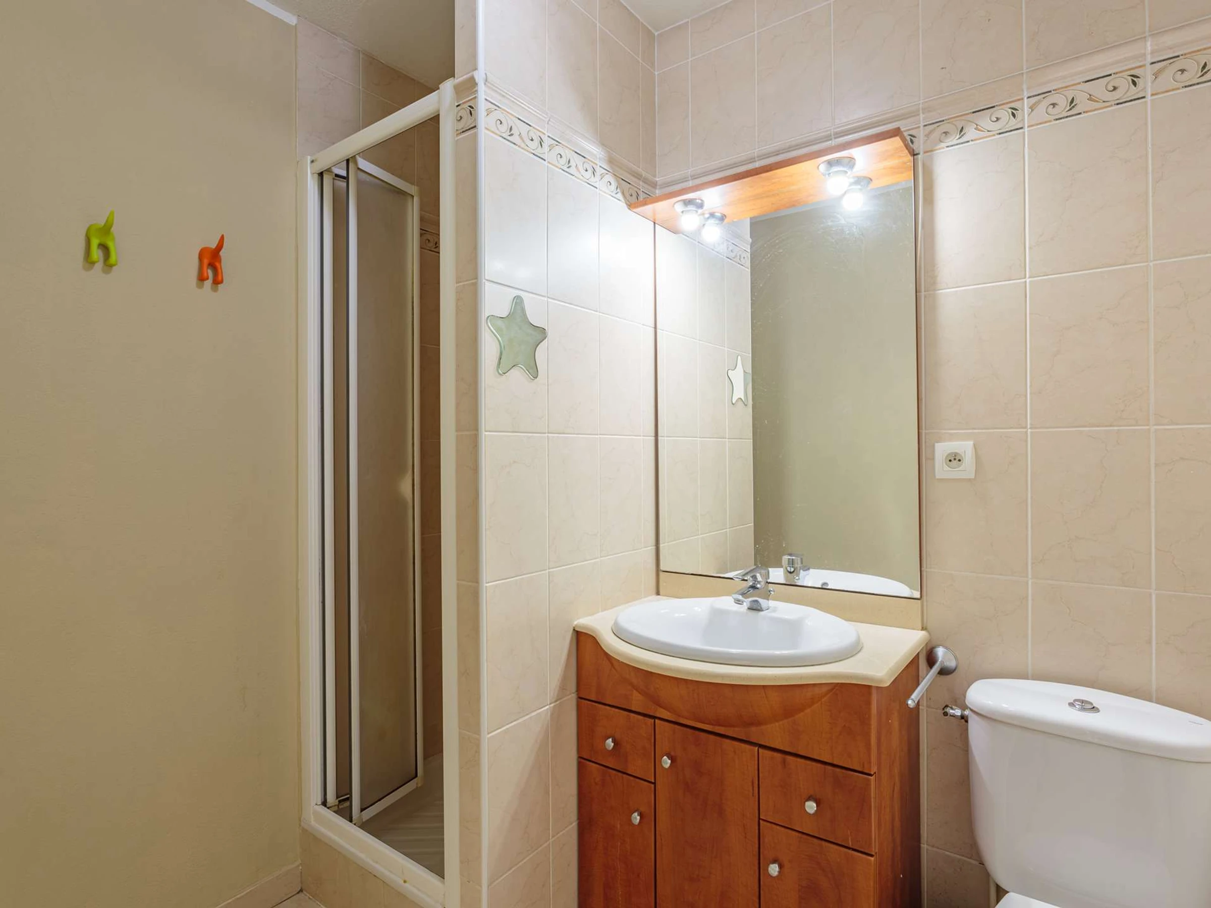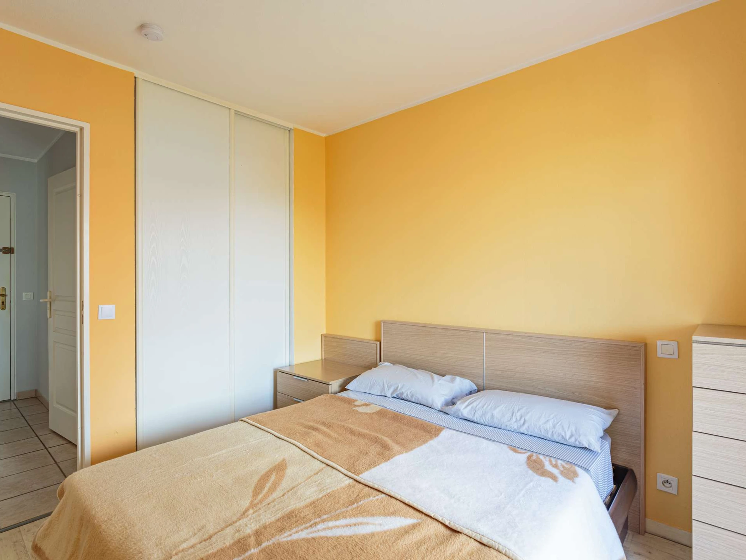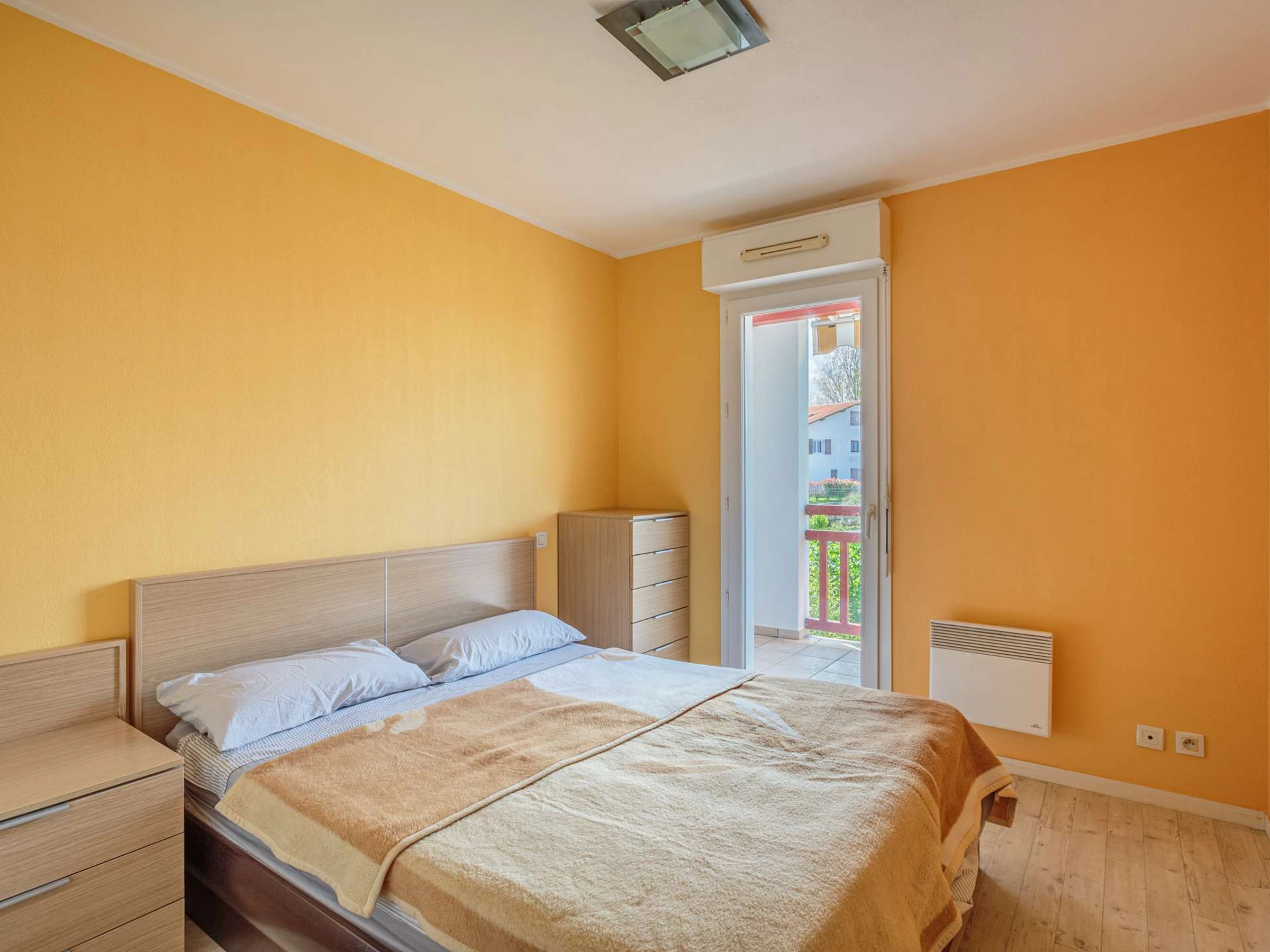 La partie nuit comprend une chambre avec un lit double donnant sur le balcon et une salle de bain.