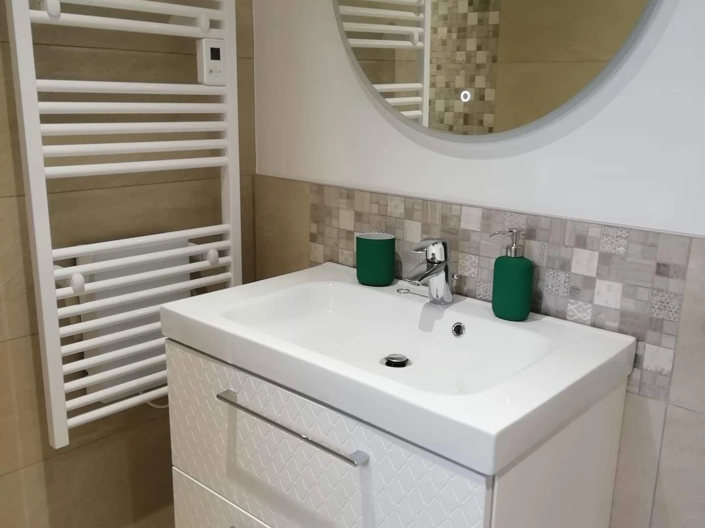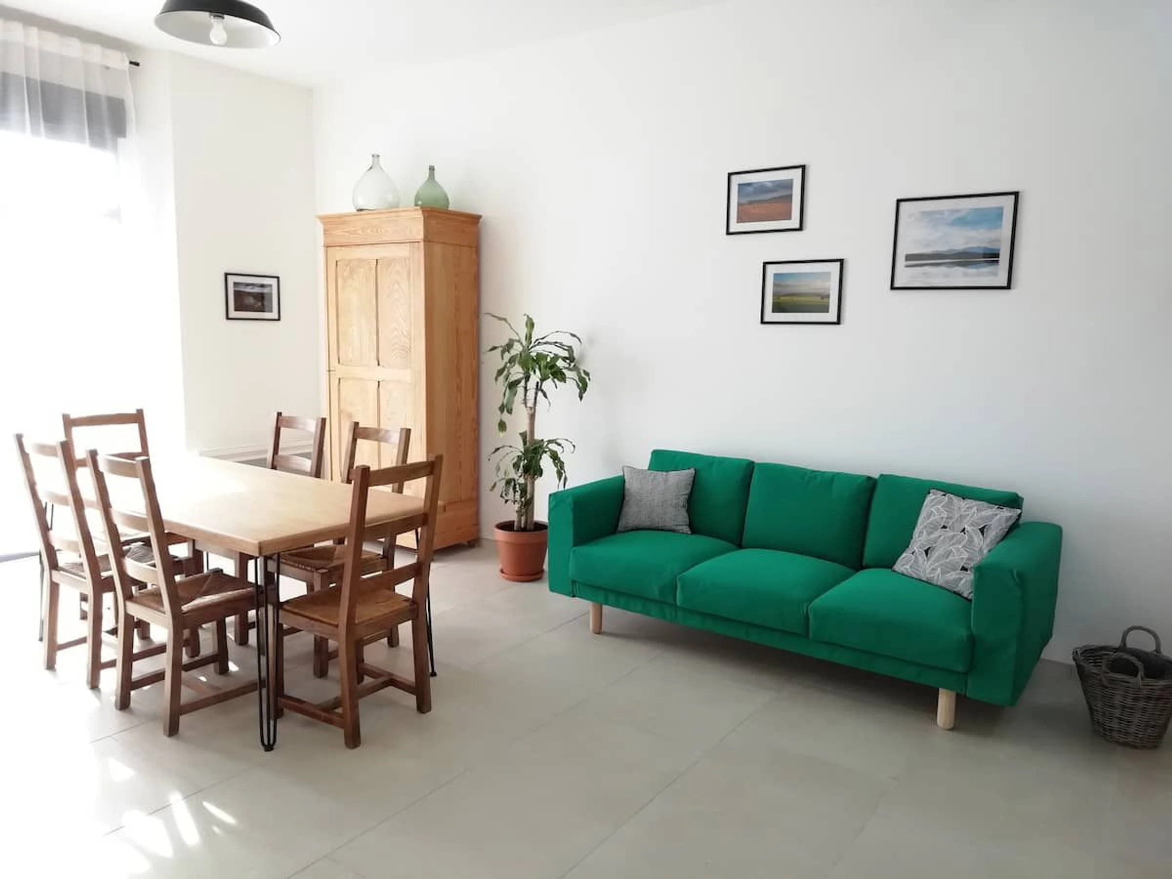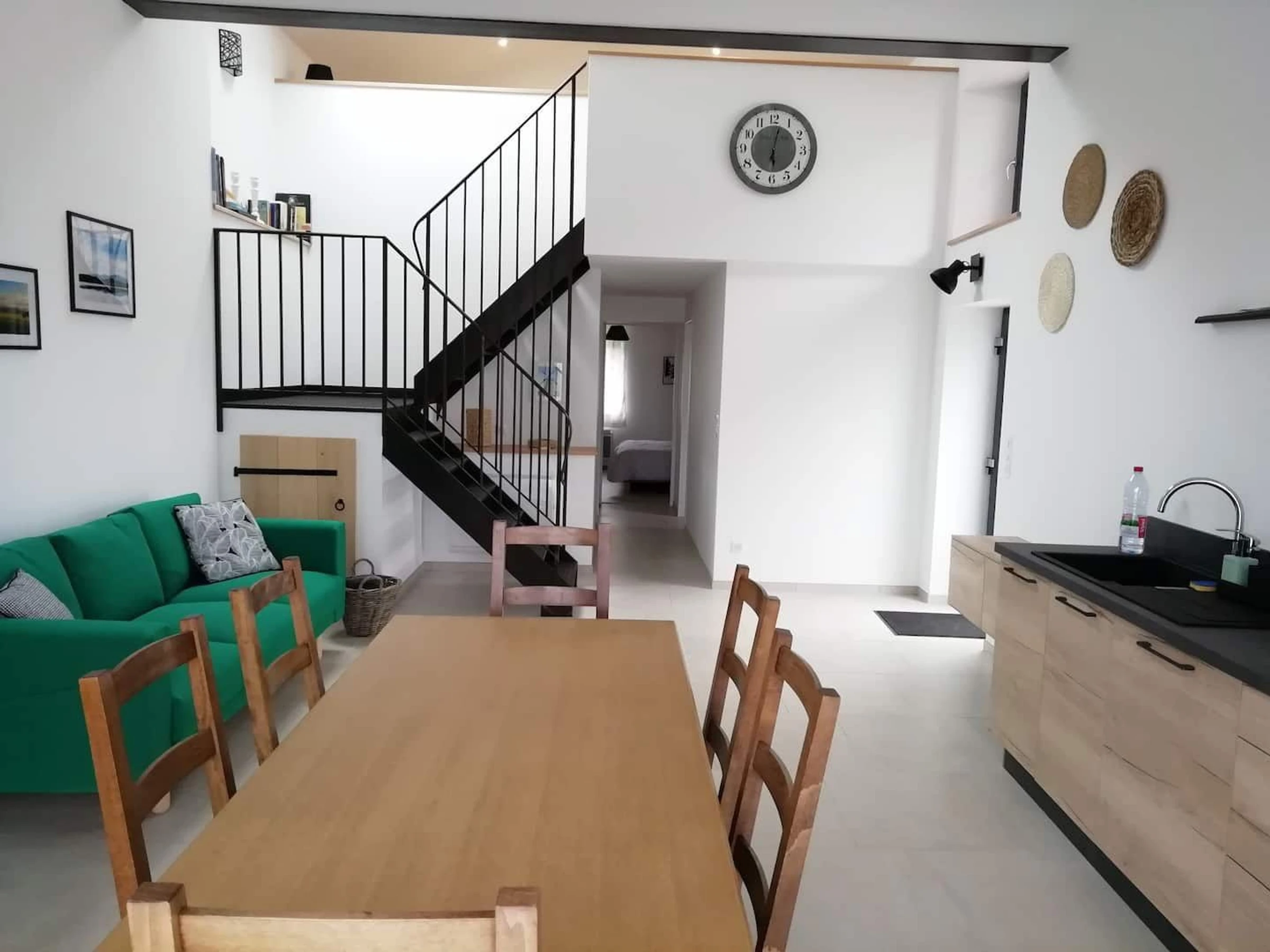 Cuisine intégrée ouverte sur séjour, espace détente avec canapé, TV écran plat 60 cm.