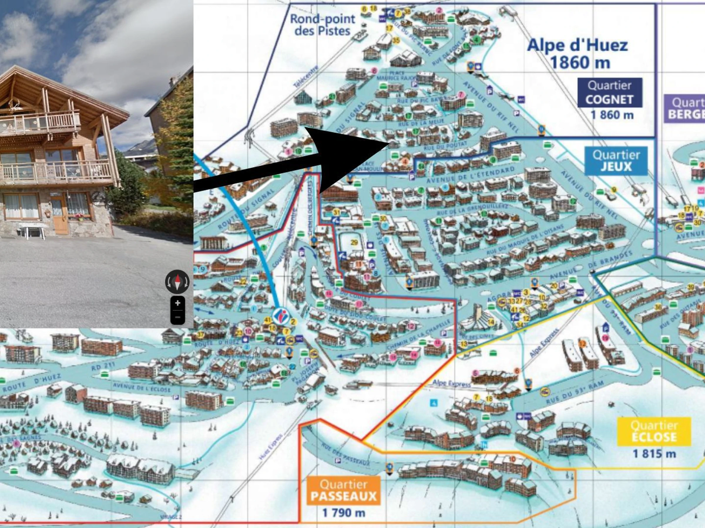 Le chalet IMAYA se situe dans le quartier prisé des Jeux, en pleins centre de la station de l'Alpe d'Huez. L'Avenue des Jeux se trouve à seulement 50m avec tous ses commerces, restaurants et loisirs que proposent la station.