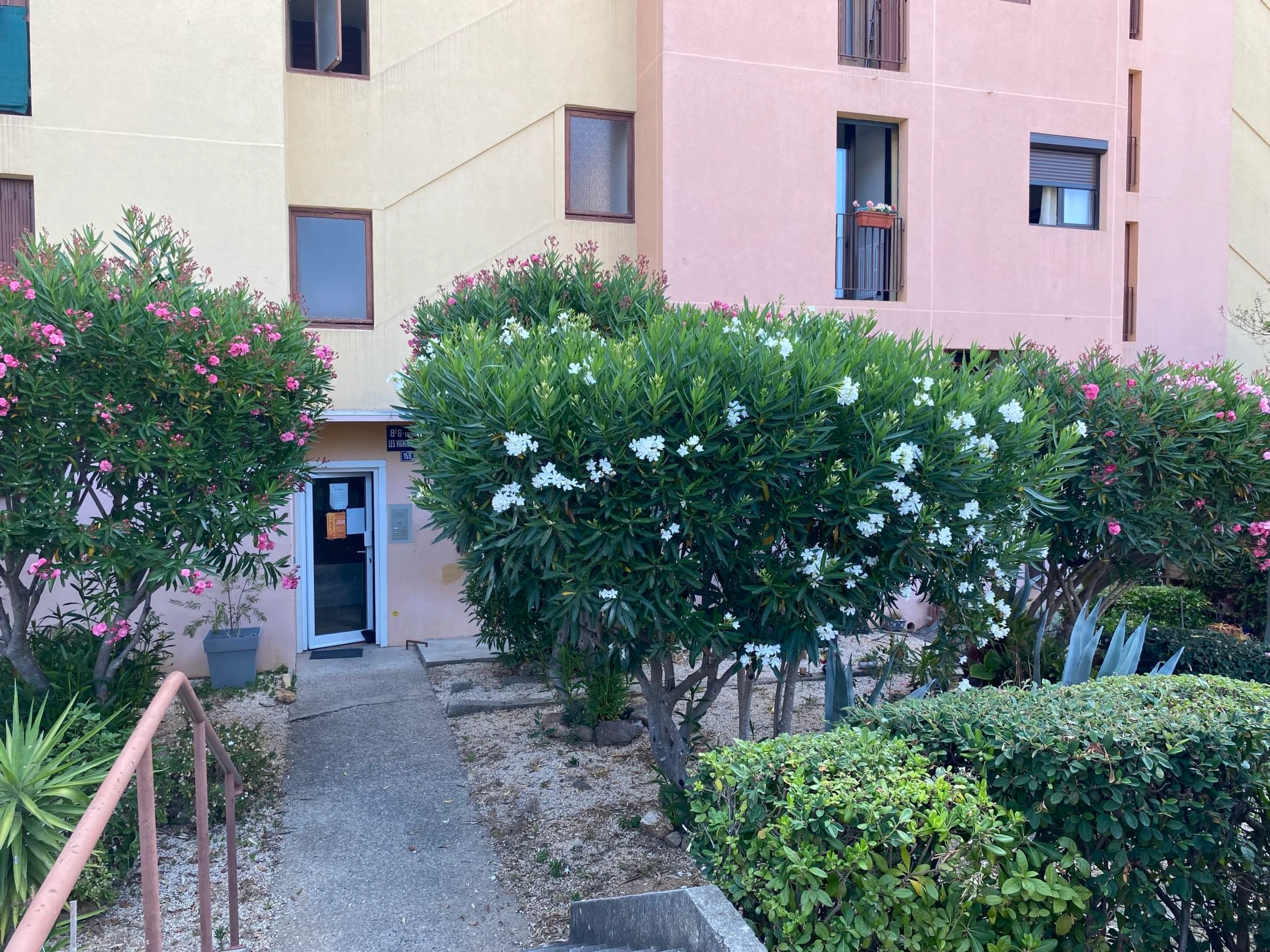 Hyères: Résidence "Résidence Les Vignes Vierges", de 5 étages. À 6 km de la mer, à 6 km de la plage. En commun: terrain de pétanque, parking public. Magasins, magasin d'alimentation, supermarché, boulangerie 400 m, arrêt du bus 100 m, plage de sable 6 km, piscine 2.6 km. Port plaisance 7 km. Attractions à proximité: Magic World 74 km, Kiddy Parck 73 km.