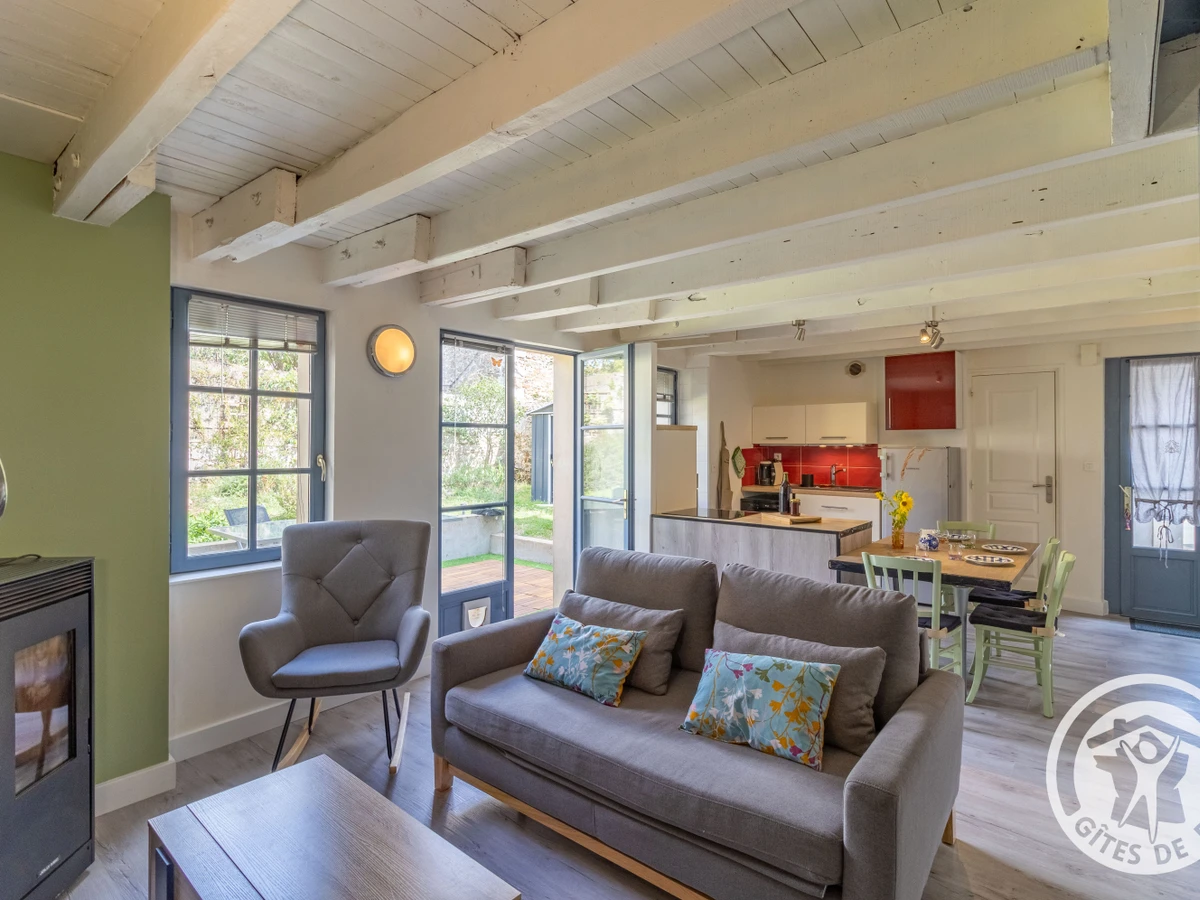 Cette petite maison de 50m² est parfaite pour un couple ou une petite famille avec deux jeunes enfants. Pièce de vie de 30m² avec cuisine équipée ouverte, espace repas, petit salon avec canapé et fauteuil à bascule, télévision (poêle non fonctionnel). Rejoignez la terrasse depuis la pièce de vie. L'espace extérieur d'environ 80m² est entièrement clos de murs. Vous pouvez donc y entreposer vos vélos en sécurité. A disposition sur la terrasse : salon de jardin, barbecue, parasol, cabanon, fauteuils, jeux enfant.