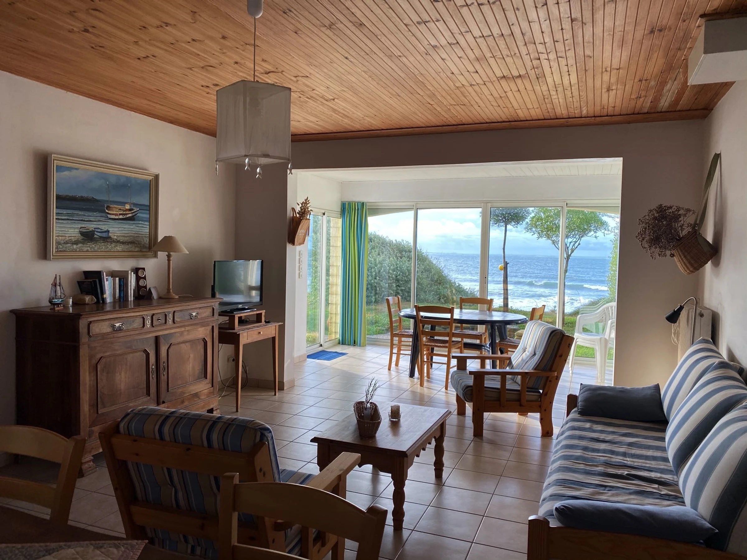 Le côté jour révèle un séjour-salon chaleureux, agrémenté d'une télévision et d'un confortable canapé, ouvrant sur une extension lumineuse offrant une vue directe sur la mer. Vous pourrez profiter de cette vue depuis l'intérieur confortablement installé ou depuis la terrasse en front de mer, accessible depuis le jardin. Une cuisine entièrement équipée, nichée dans une alcôve, vous invite à préparer de délicieux repas avec des équipements tels qu'un lave-vaisselle, une gazinière avec four électrique, un réfrigérateur avec haut congélateur, et bien plus encore.
