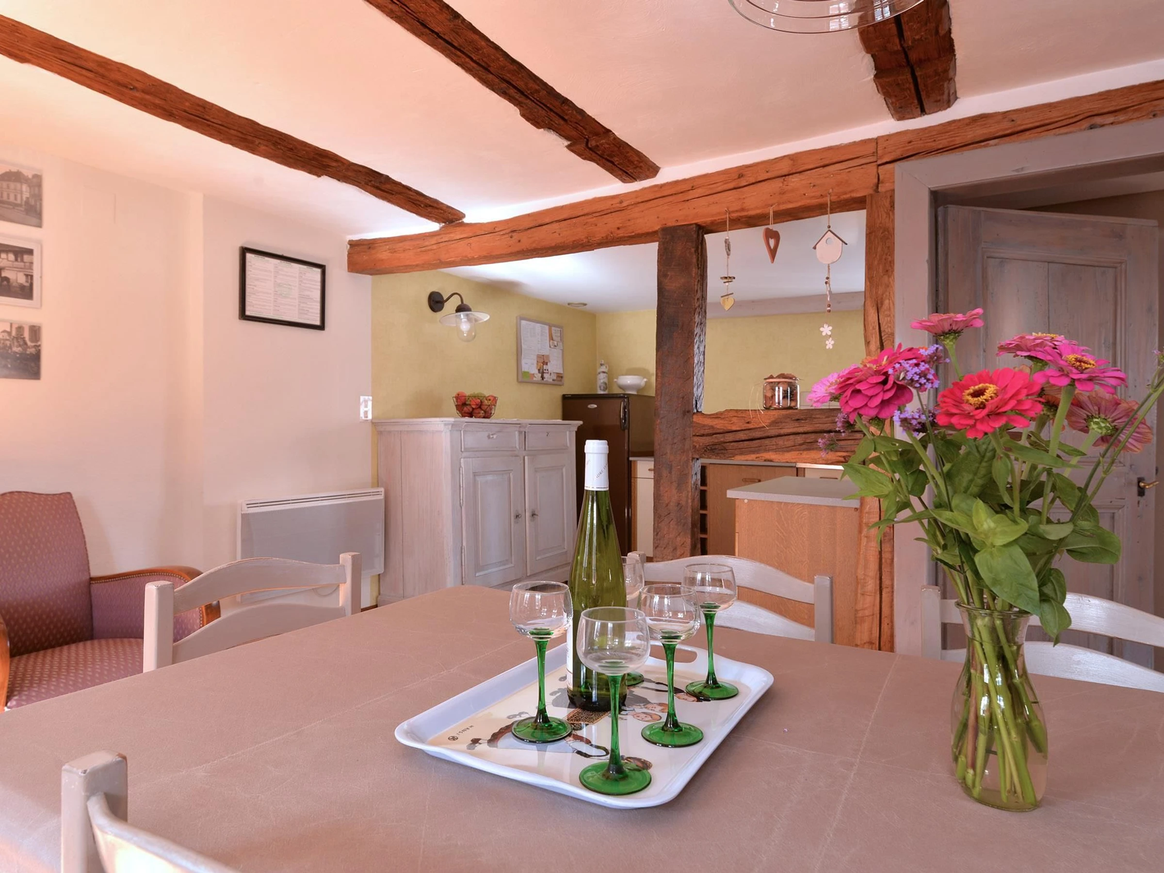 Gîte de caractère dans une maison indépendante proche de Colmar. Notre gîte lumineux pouvant accueillir jusqu'à 7 personnes situé à l'étage vous séduira par son charme, son confort et son authenticité. 4 chambres décorées avec goût : 2 chambres à 1 lit double, 1 chambre à 1 lit simple, 1 chambre à 2 lits simples de 105 cm, cuisine équipée (lave-vaisselle) ouverte sur le salon/séjour confortable avec 1 canapé et 3 fauteuils, 1 salle d'eau avec 2 vasques (lave-linge), WC indépendant. Lits faits à l'arrivée.