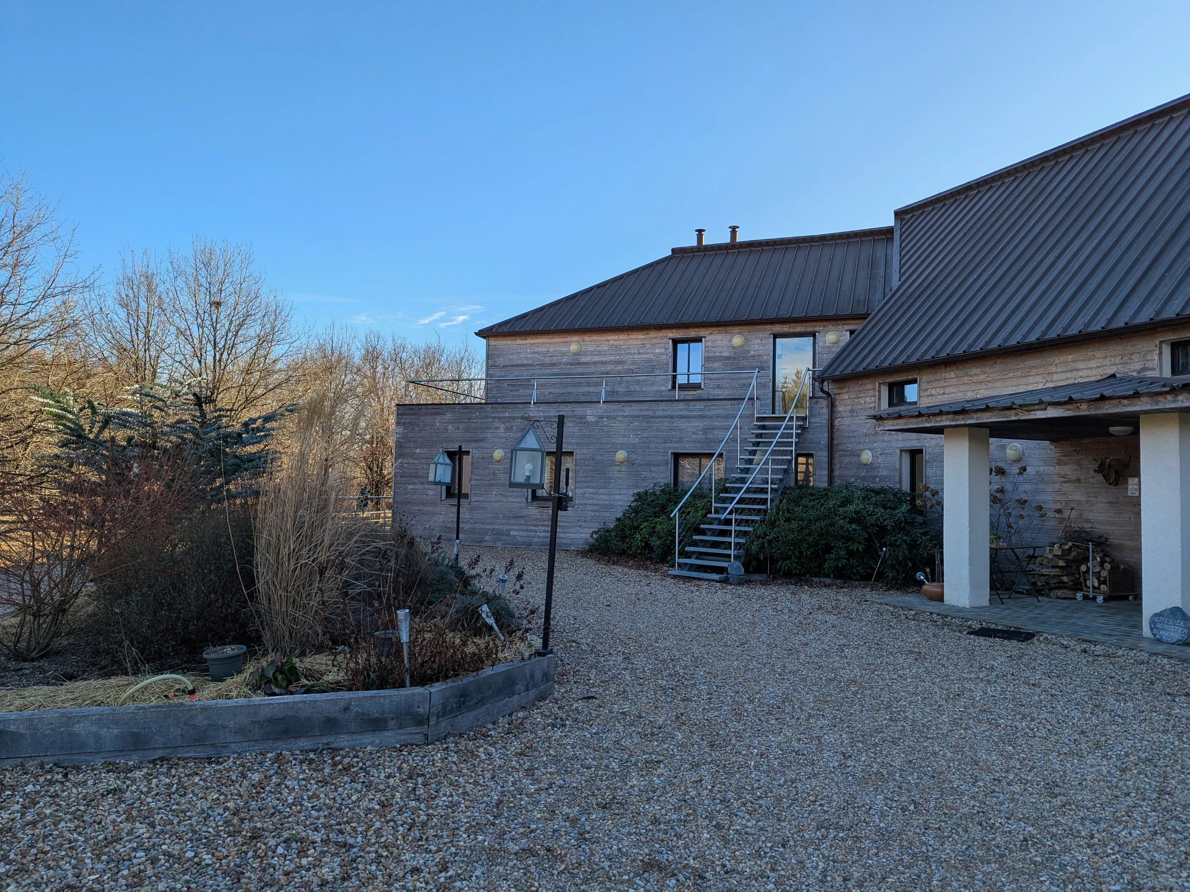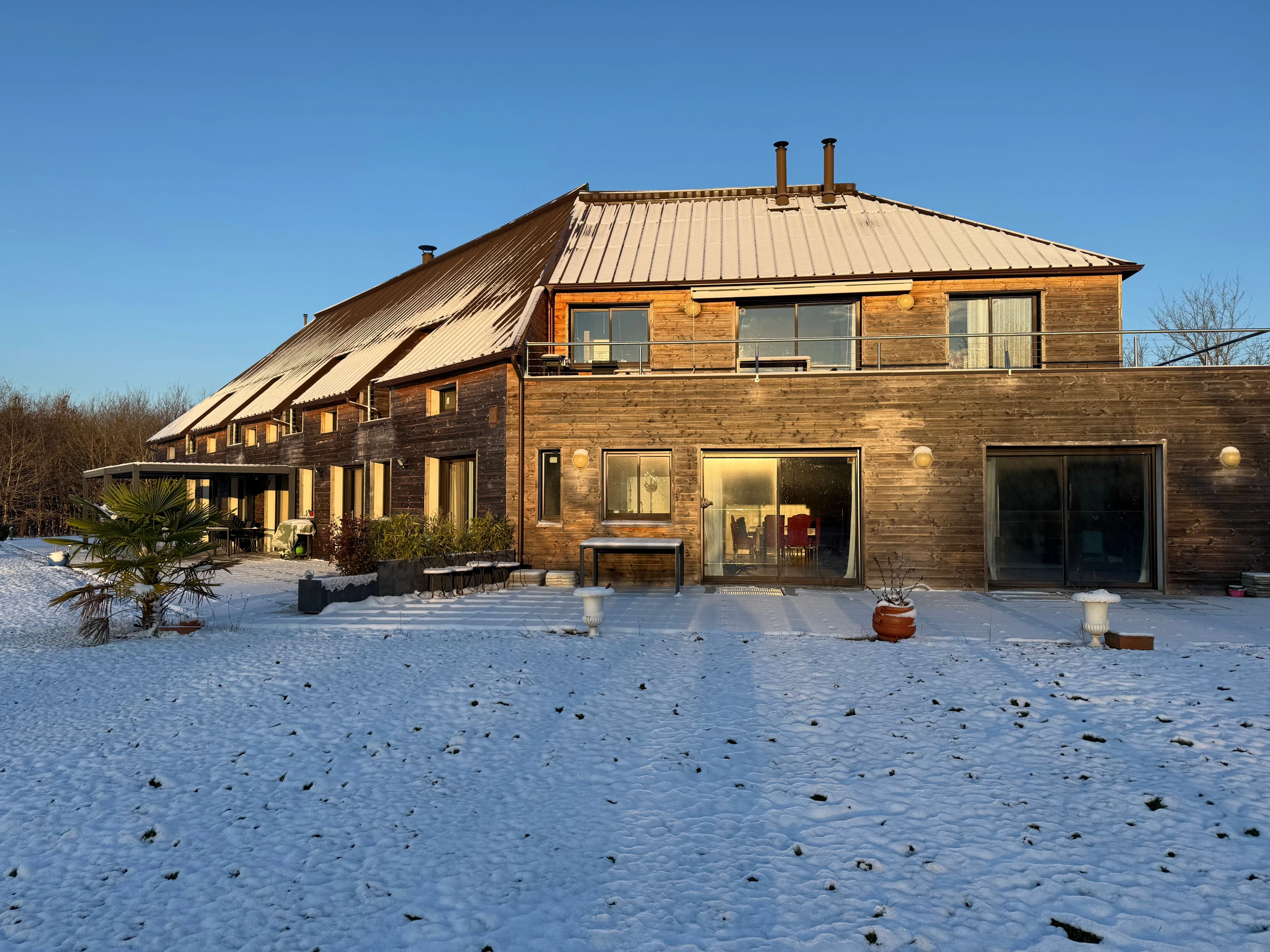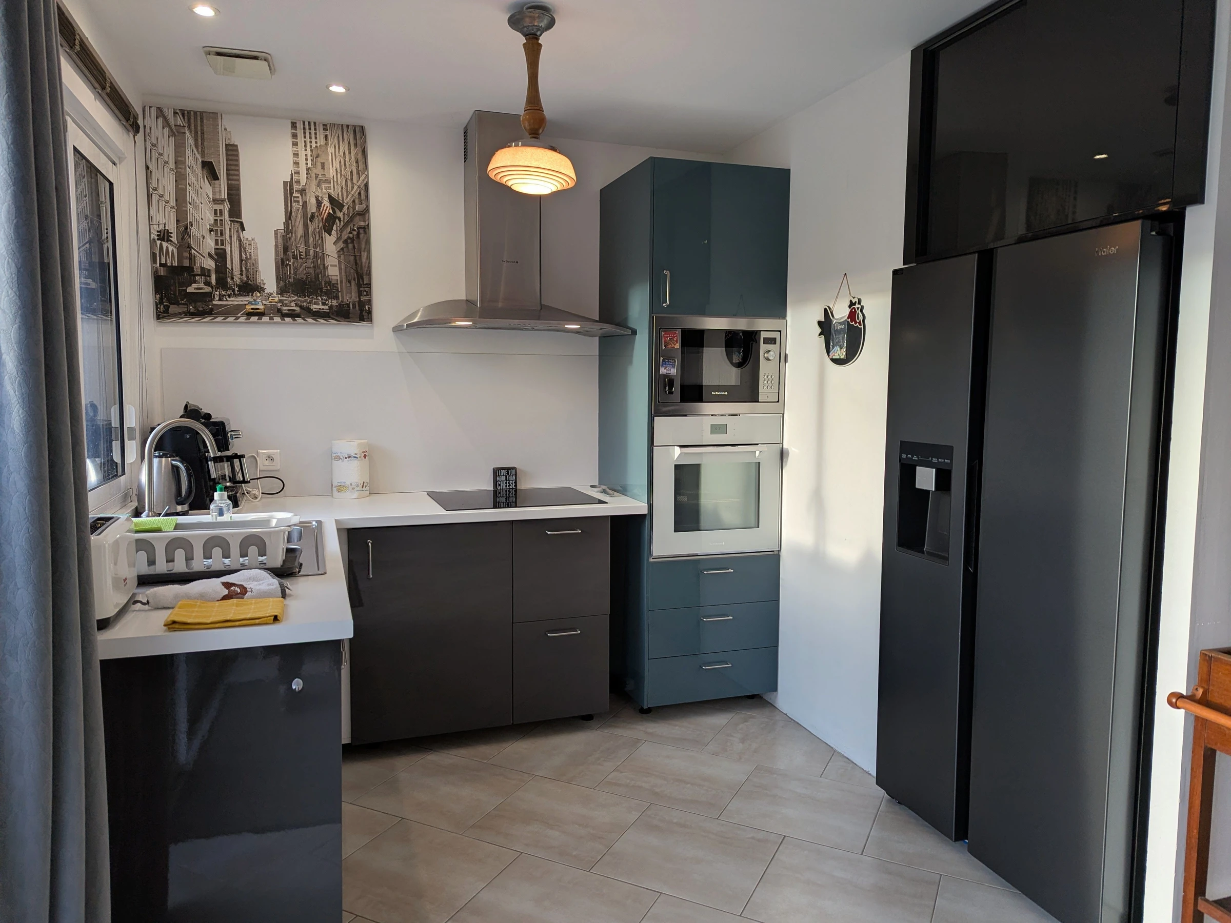 - Une pièce à vivre : salon (canapé, fauteuil, table basse, TV, table de jeux), espace salle à manger (grande table et chaises), cuisine ouverte toute équipée (réfrigérateur américain avec partie congélateur, évier, plaque induction 4 zones, hotte, four, micro-ondes, lave-vaisselle 14 couverts, machine à café expresso combiné De'Longhi, bouilloire, grille-pain, mixeur, batteur électrique, robot). Poêle à bois (bois fournis).