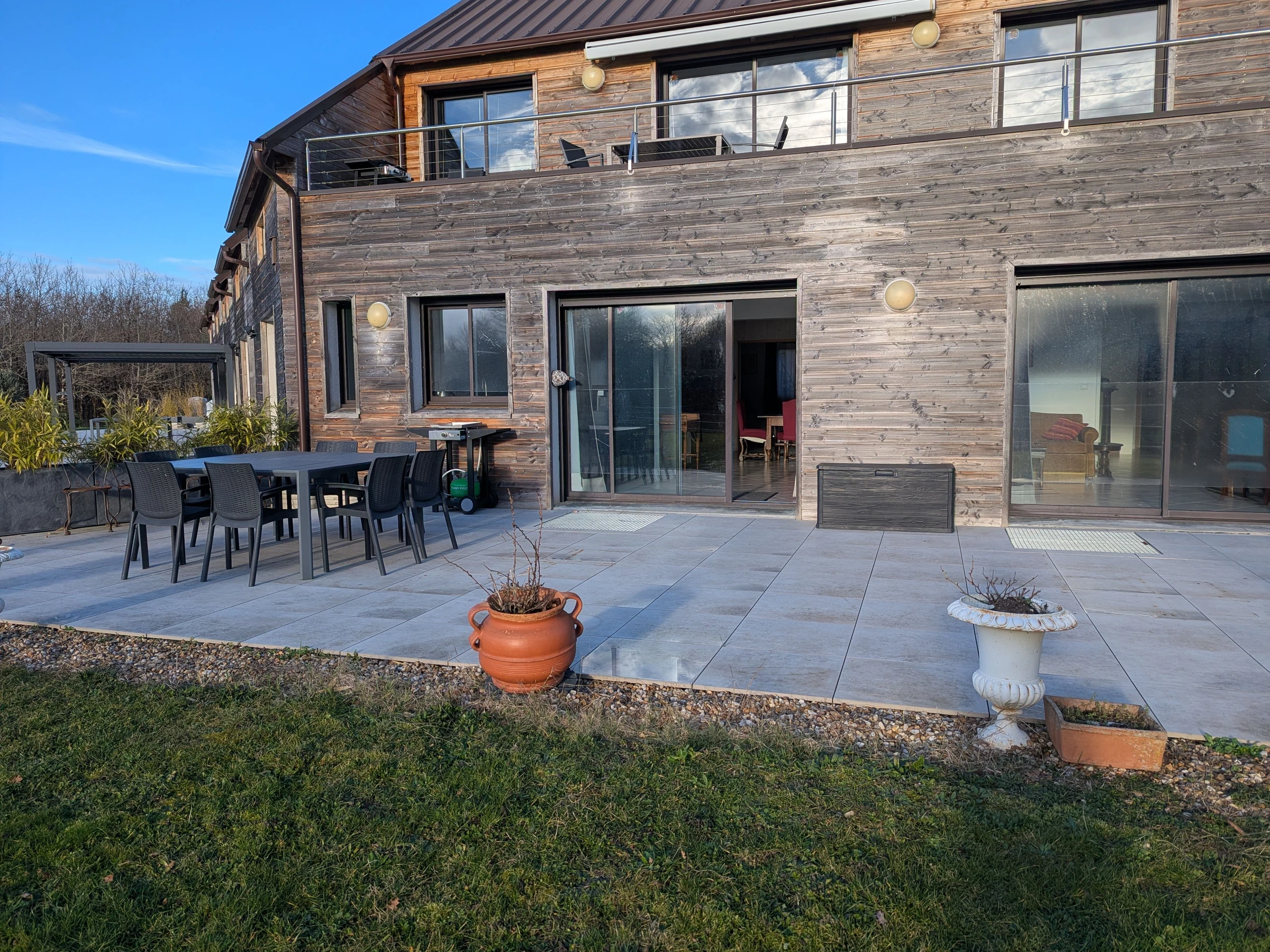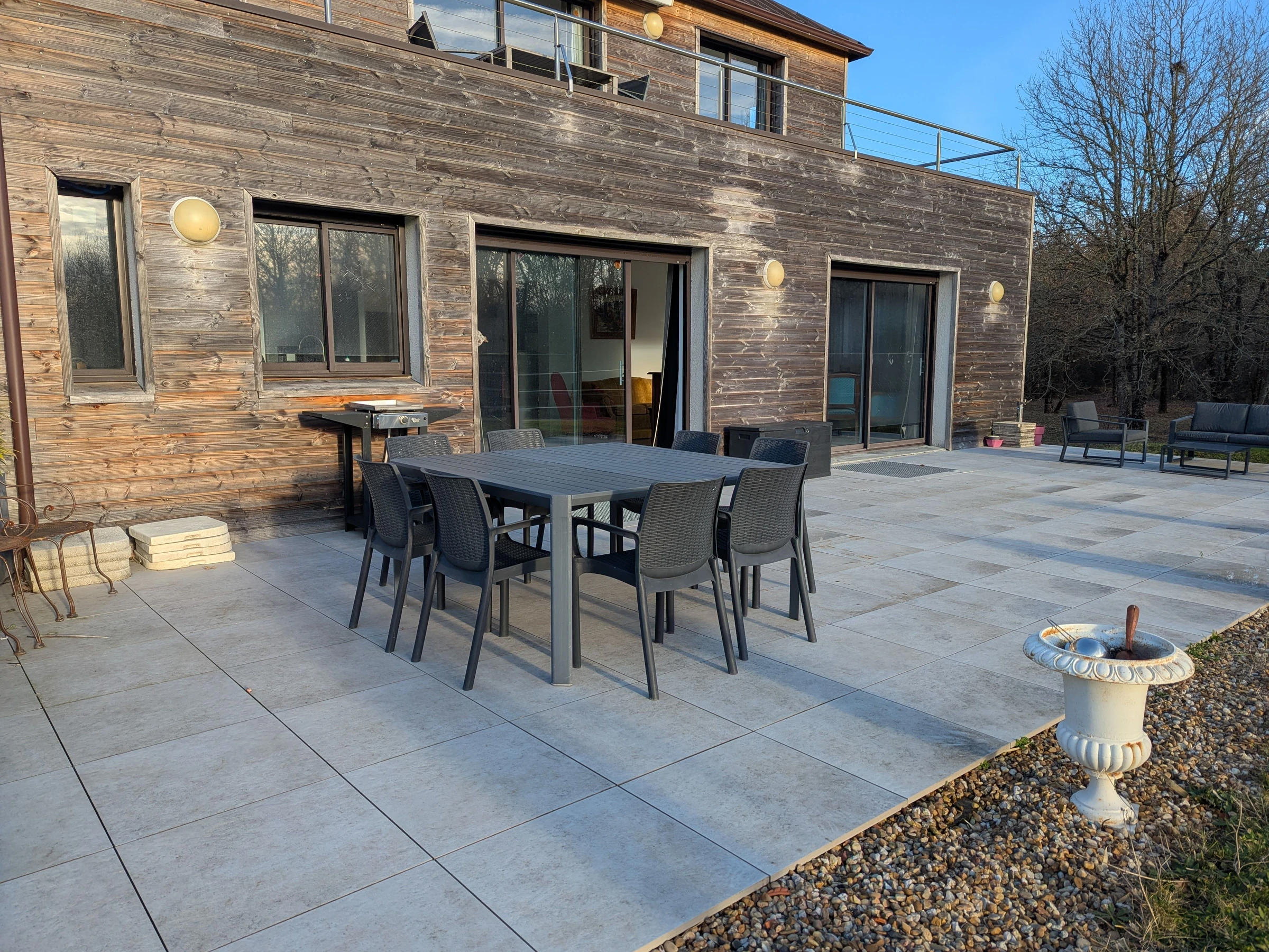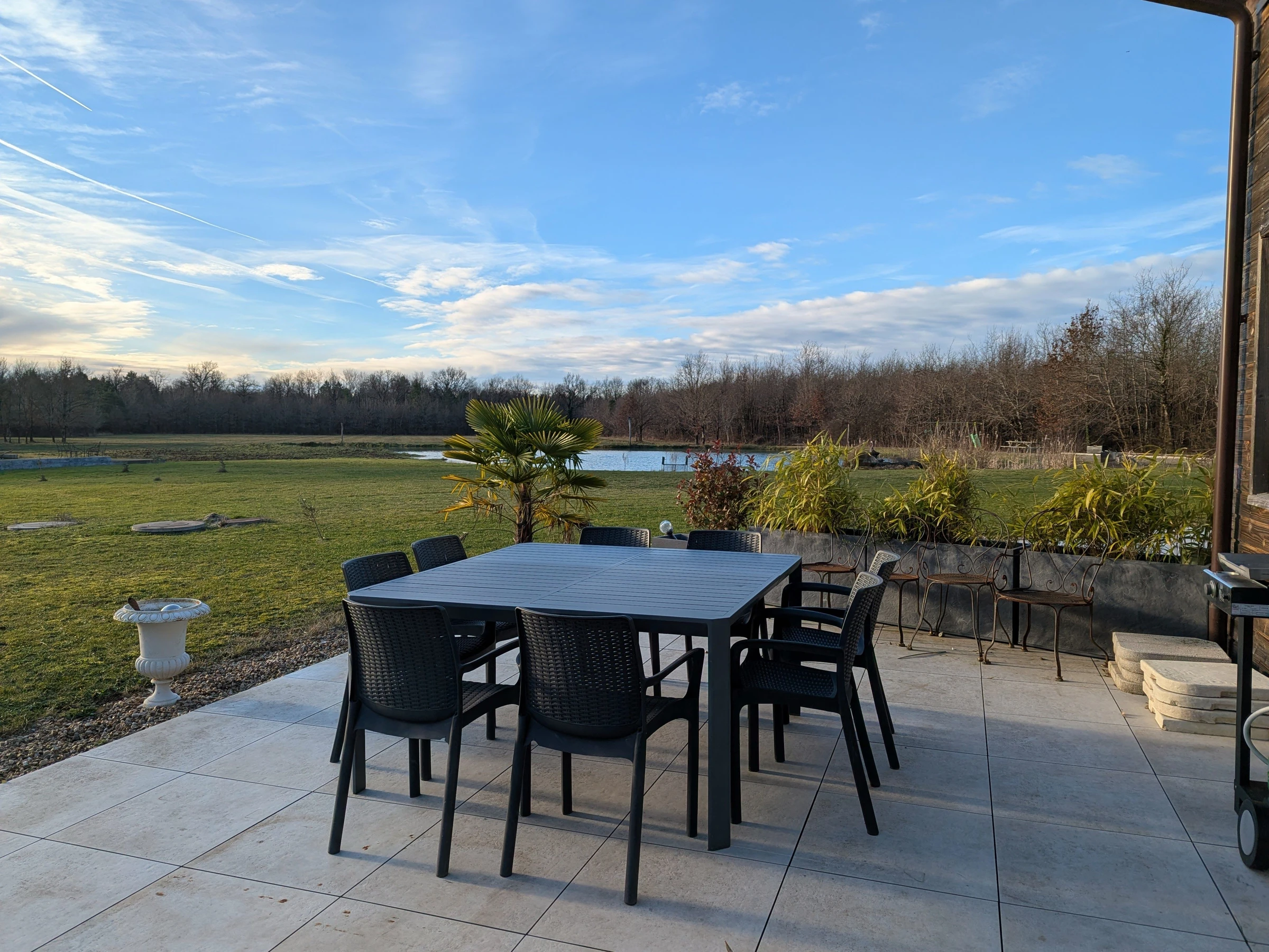 Grande terrasse privative ouverte sur le parc. Vous disposerez d'un salon de jardin, salon de détente, transats, plancha gaz et parasols pour profiter des beaux jours. Le reste du parc est partagé. Vous pourrez vous balader, vous divertir avec le terrain de pétanque ou encore faire une petite partie de pêche de loisir dans l'étang privé de la propriété (sous la responsabilité des parents). Balançoire enfant.