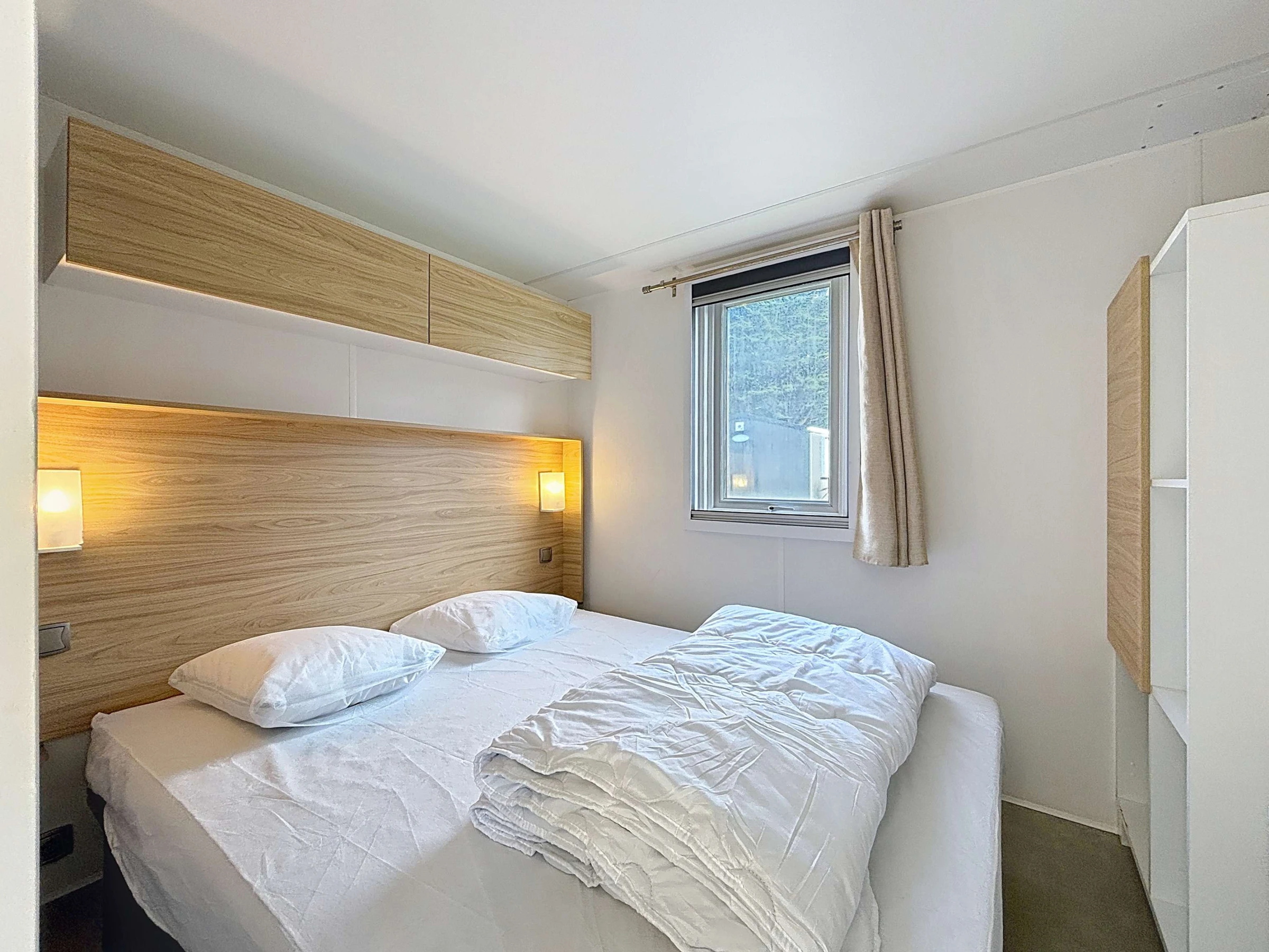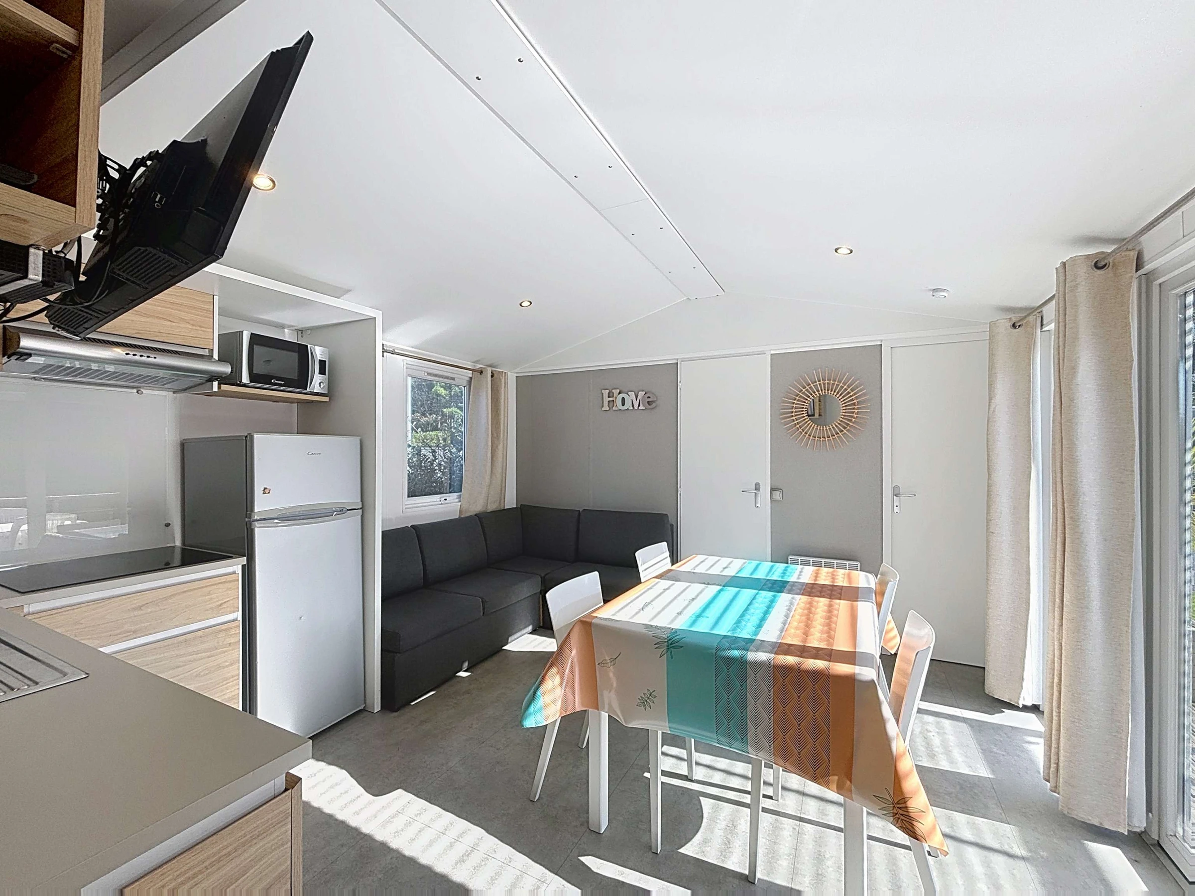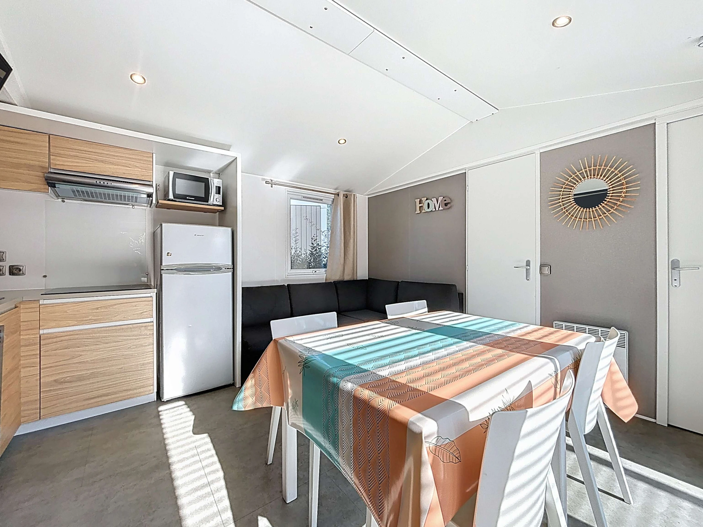 Laissez-vous séduire par ce Mobil-home de 35m² composé d’une pièce de vie avec un coin cuisine aménagée et équipée, d’un coin salon avec canapé et TV, d’une chambre parentale avec lit double (160x200), d'une deuxième chambre avec deux lits superposés et d'une troisième chambres avec deux lits simples (90), d’une salle d’eau et wc séparé. Celui-ci est équipé d’une grande terrasse en bois équipée, ou vous pourrez manger dehors ou prendre un bain de soleil sur les transats. Un emplacement de parking est disponible sur la parcelle, uniquement pour un seul véhicule.