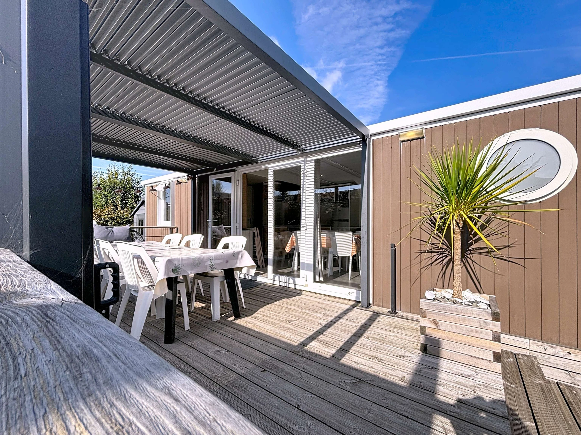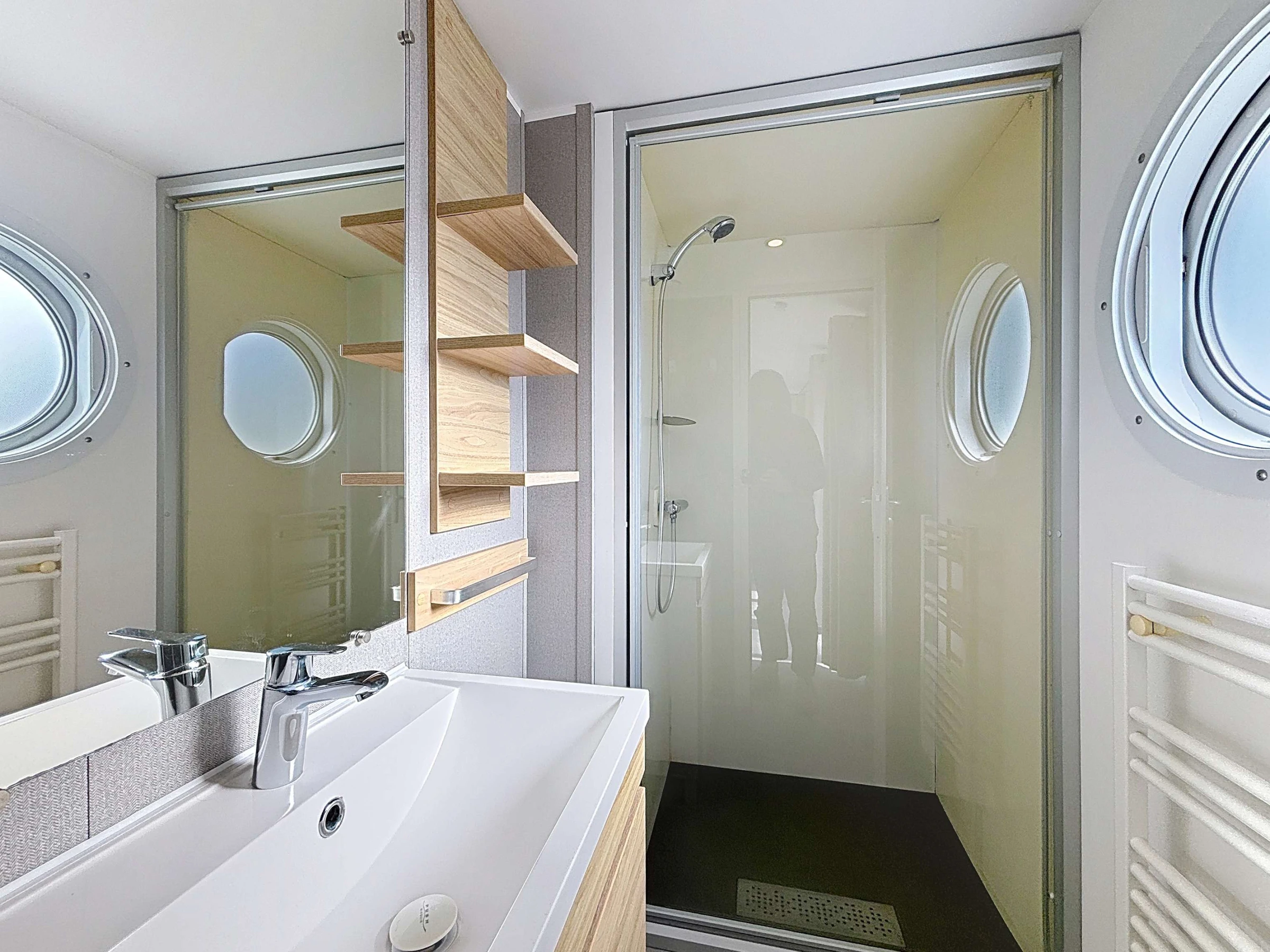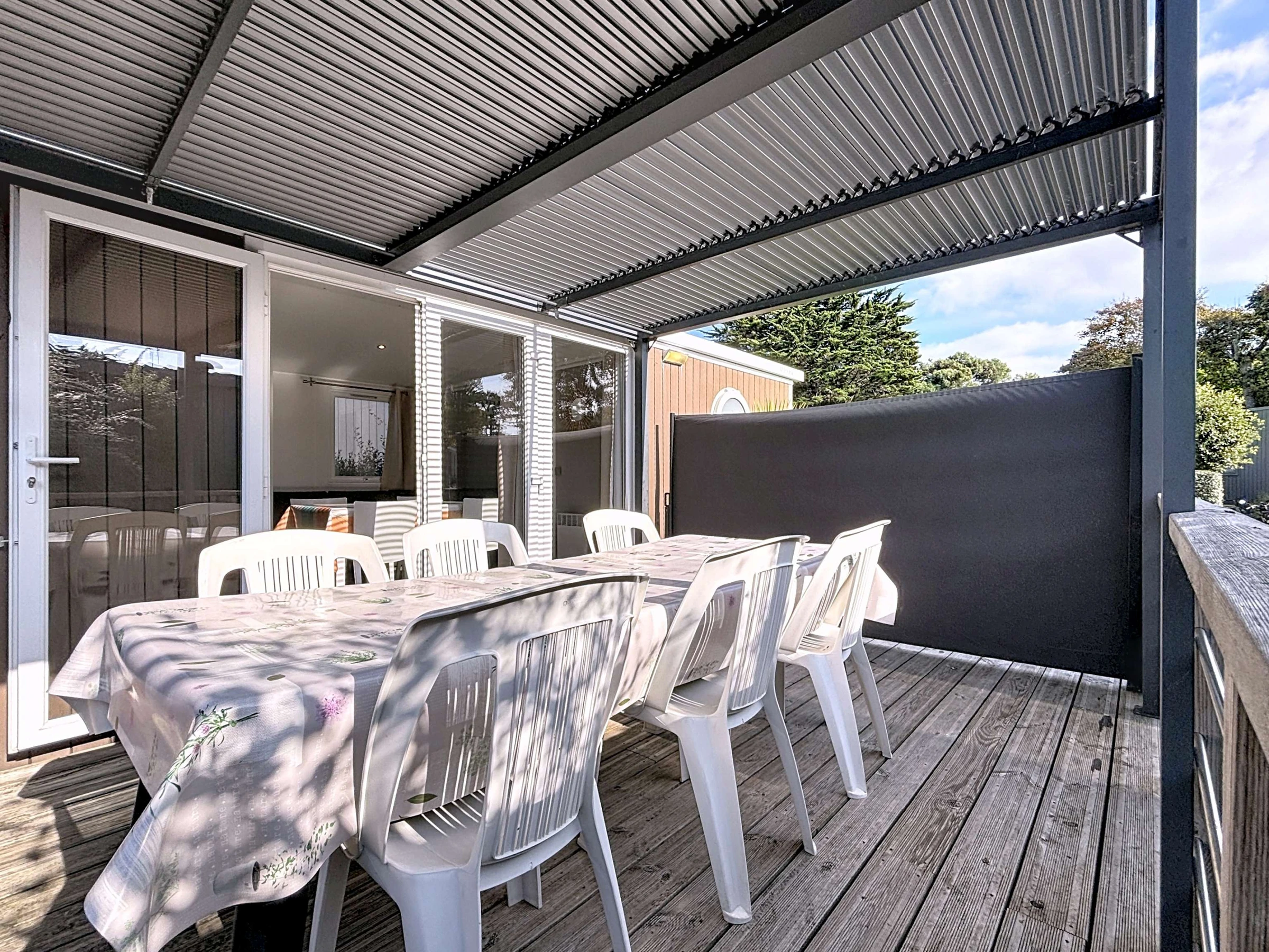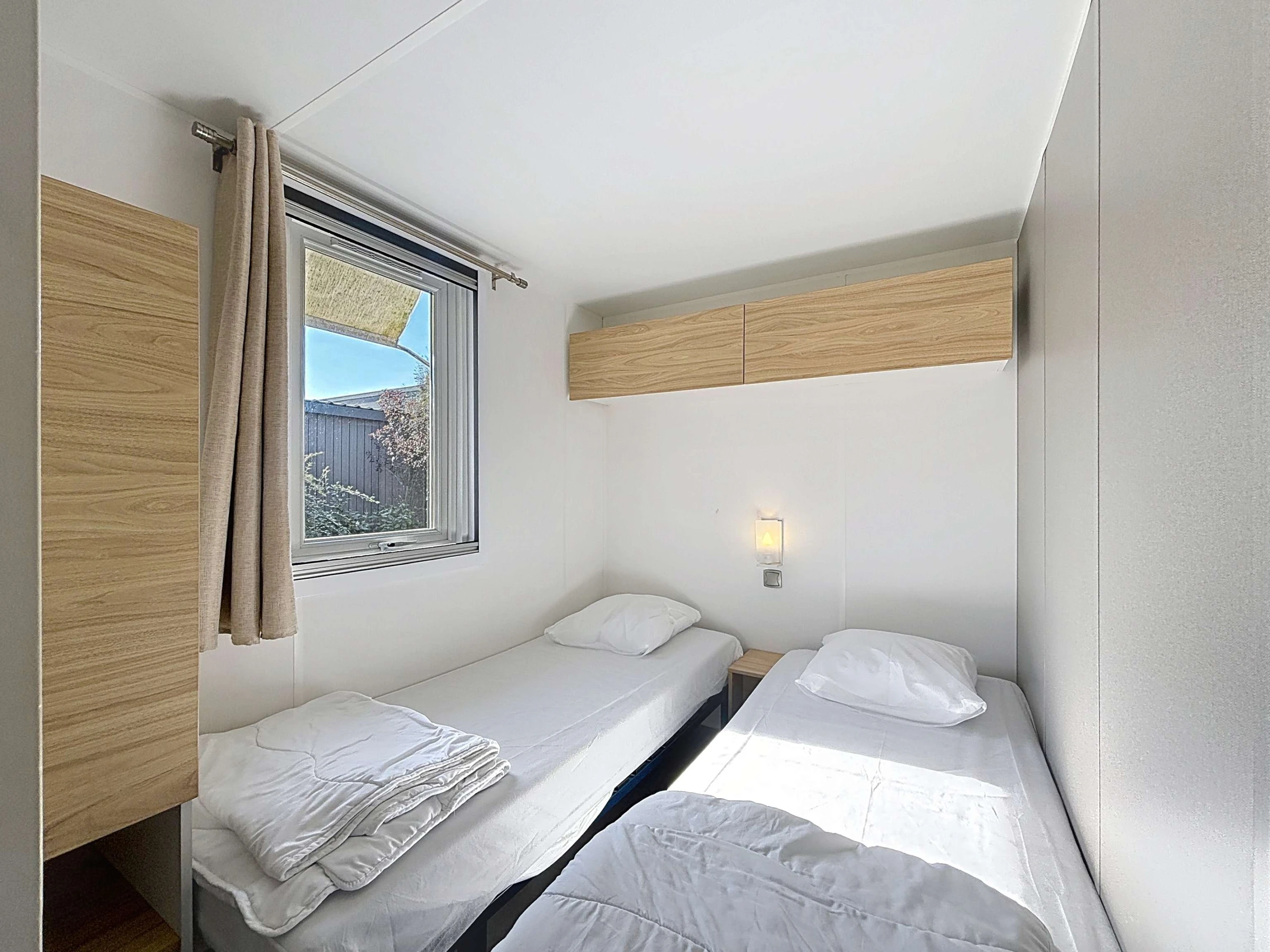 Laissez-vous séduire par ce Mobil-home de 35m² composé d’une pièce de vie avec un coin cuisine aménagée et équipée, d’un coin salon avec canapé et TV, d’une chambre parentale avec lit double (160x200), d'une deuxième chambre avec deux lits superposés et d'une troisième chambres avec deux lits simples (90), d’une salle d’eau et wc séparé. Celui-ci est équipé d’une grande terrasse en bois équipée, ou vous pourrez manger dehors ou prendre un bain de soleil sur les transats. Un emplacement de parking est disponible sur la parcelle, uniquement pour un seul véhicule.