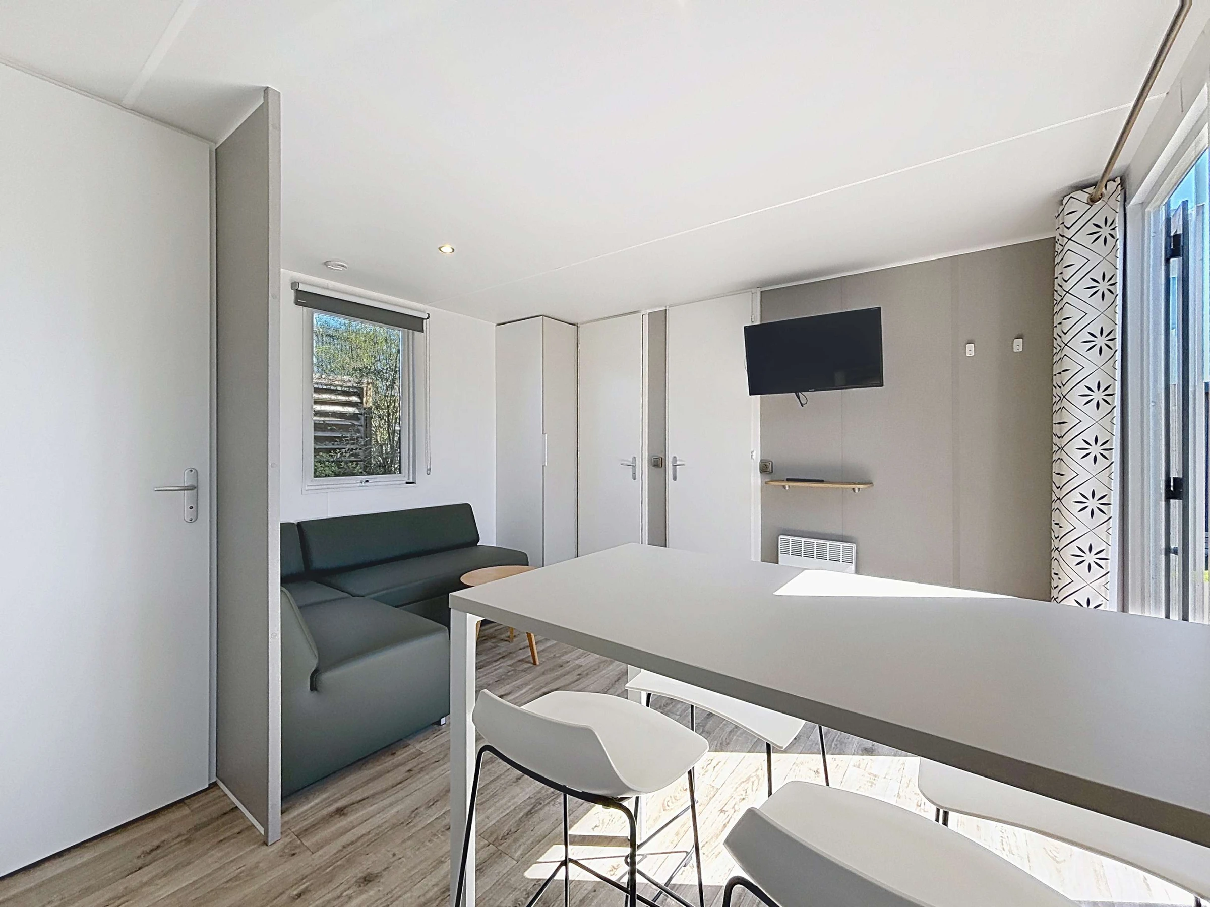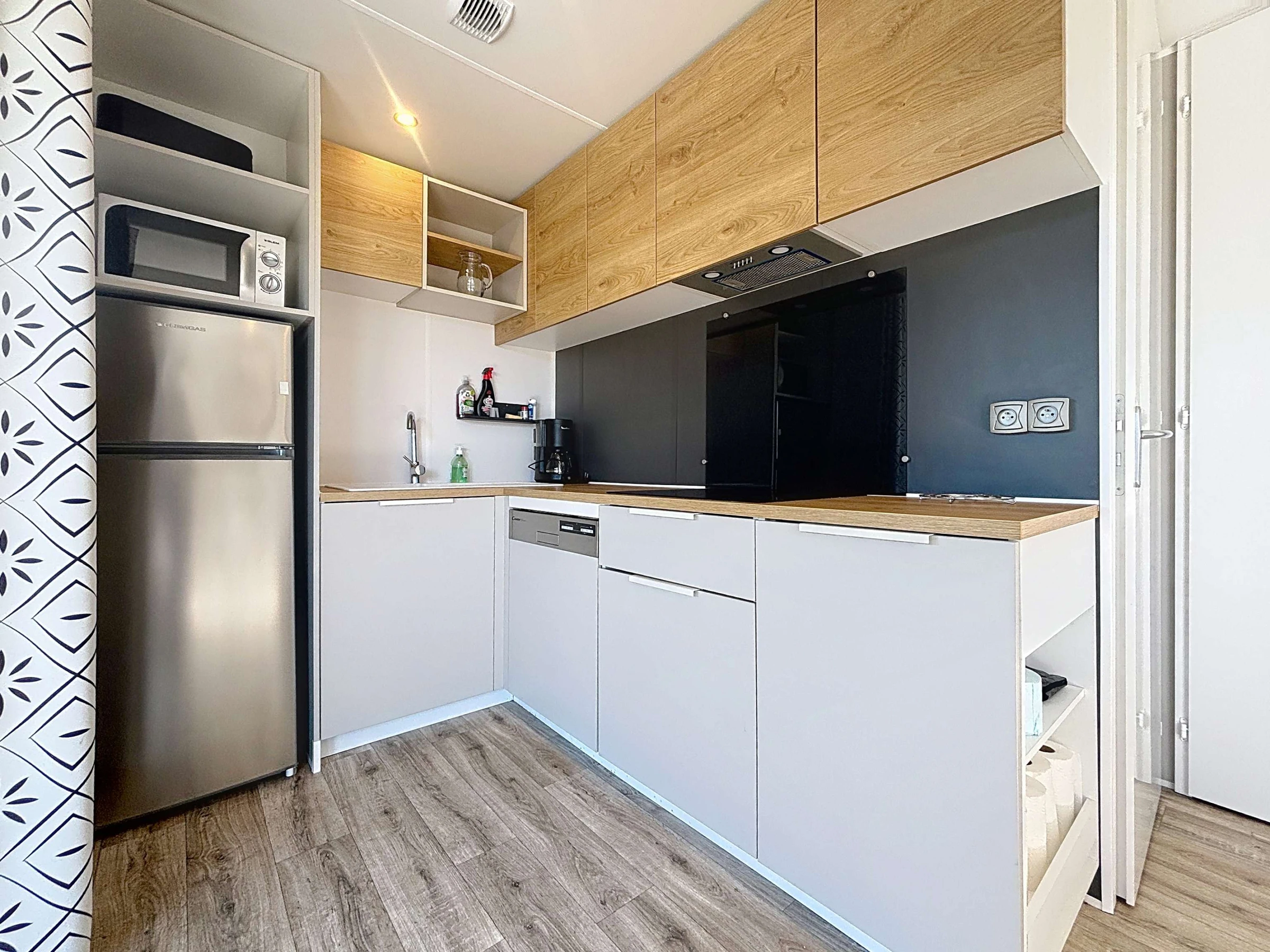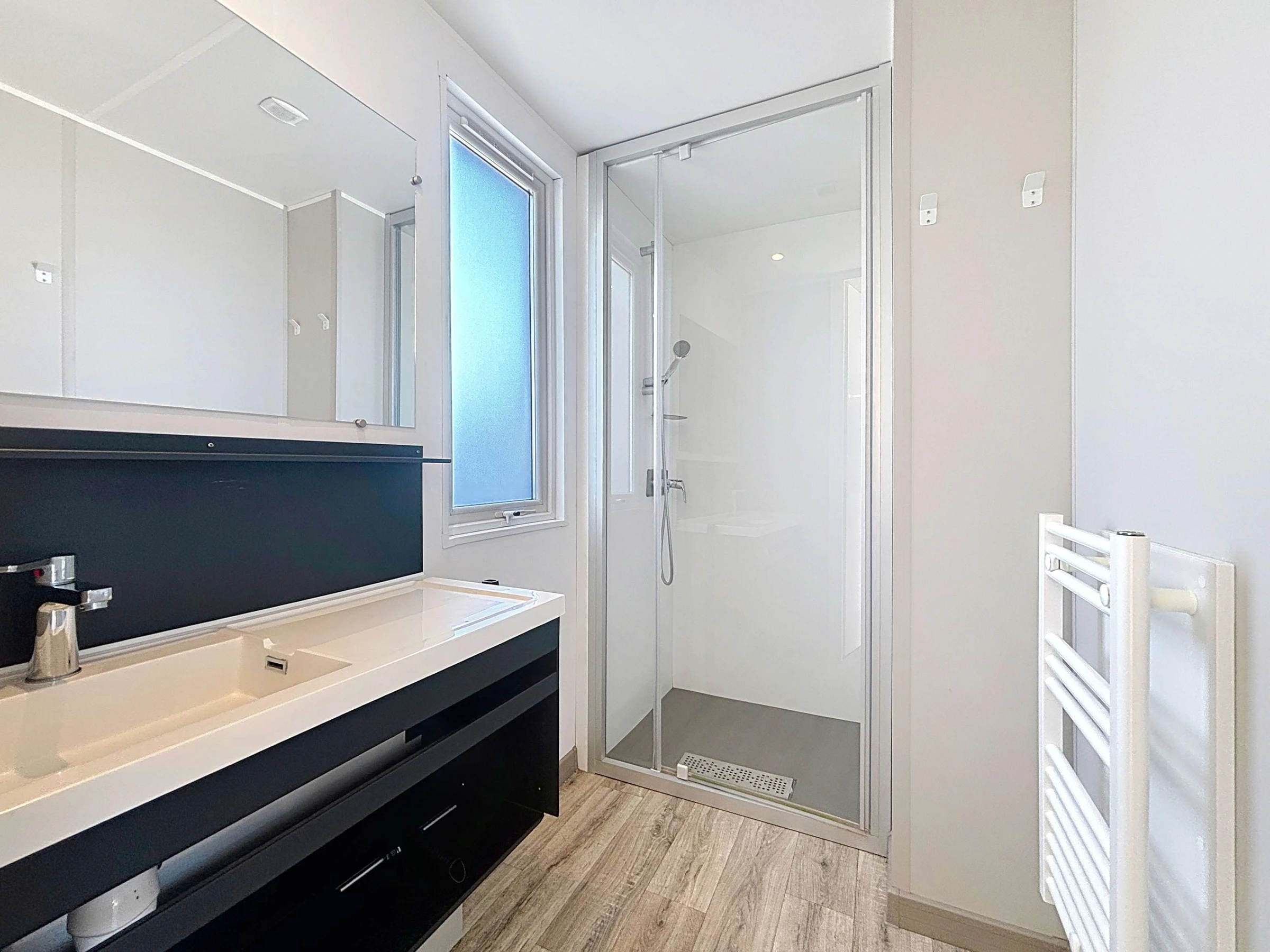 Laissez-vous séduire par ce Mobile-home 2 chambres, Grand confort, 4 personnes d'une surface de 31m² composé d’une pièce de vie avec un coin cuisine aménagée et équipée, d’un coin salon avec Tv et canapé, d’une chambre équipée d’un lit double (160x200), d’une deuxième chambre avec deux lits simples (90), une salle d’eau et wc séparé. Vous pourrez profiter de la terrasse en bois couverte et équipée . Un emplacement de parking est disponible sur la parcelle, uniquement pour un seul véhicule.