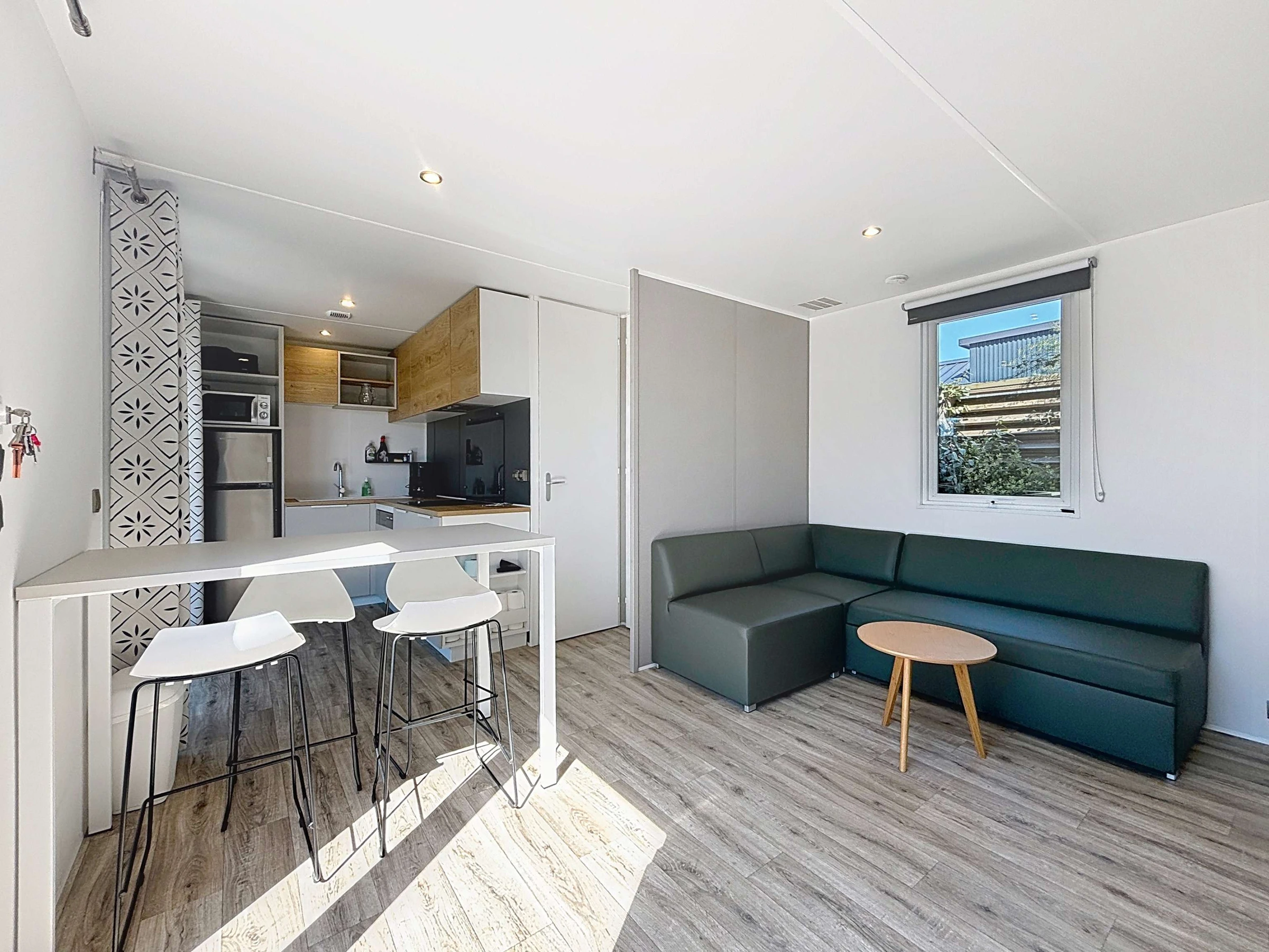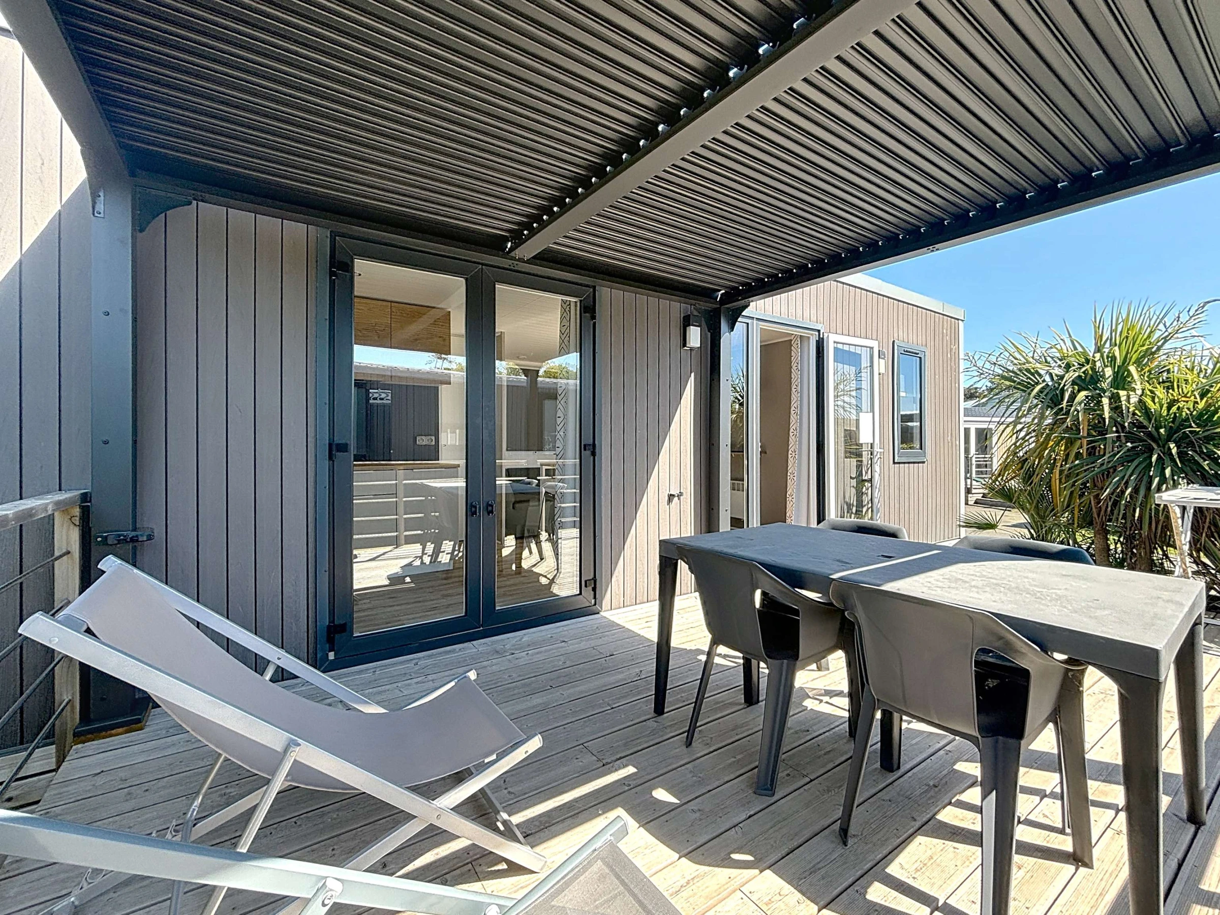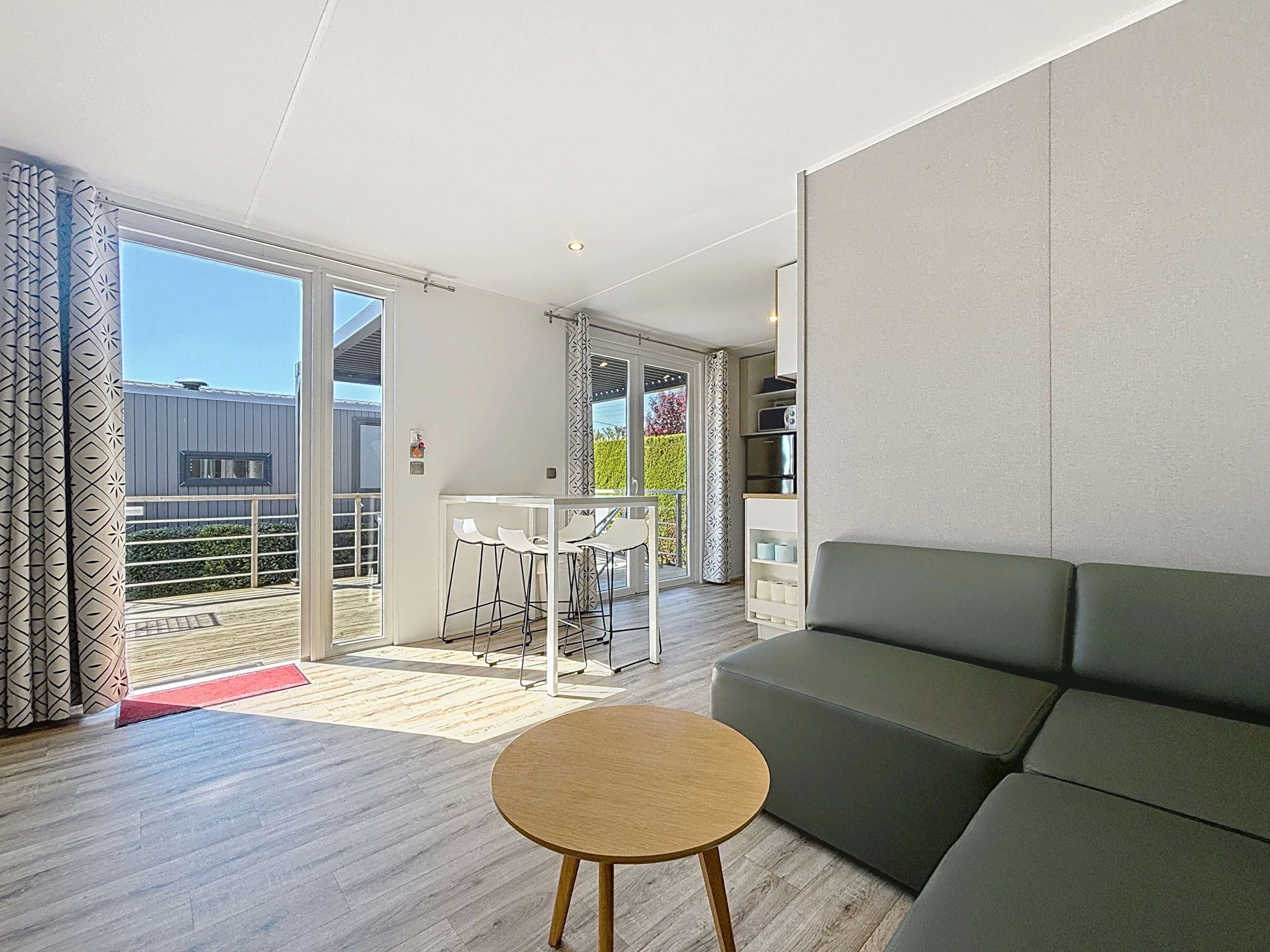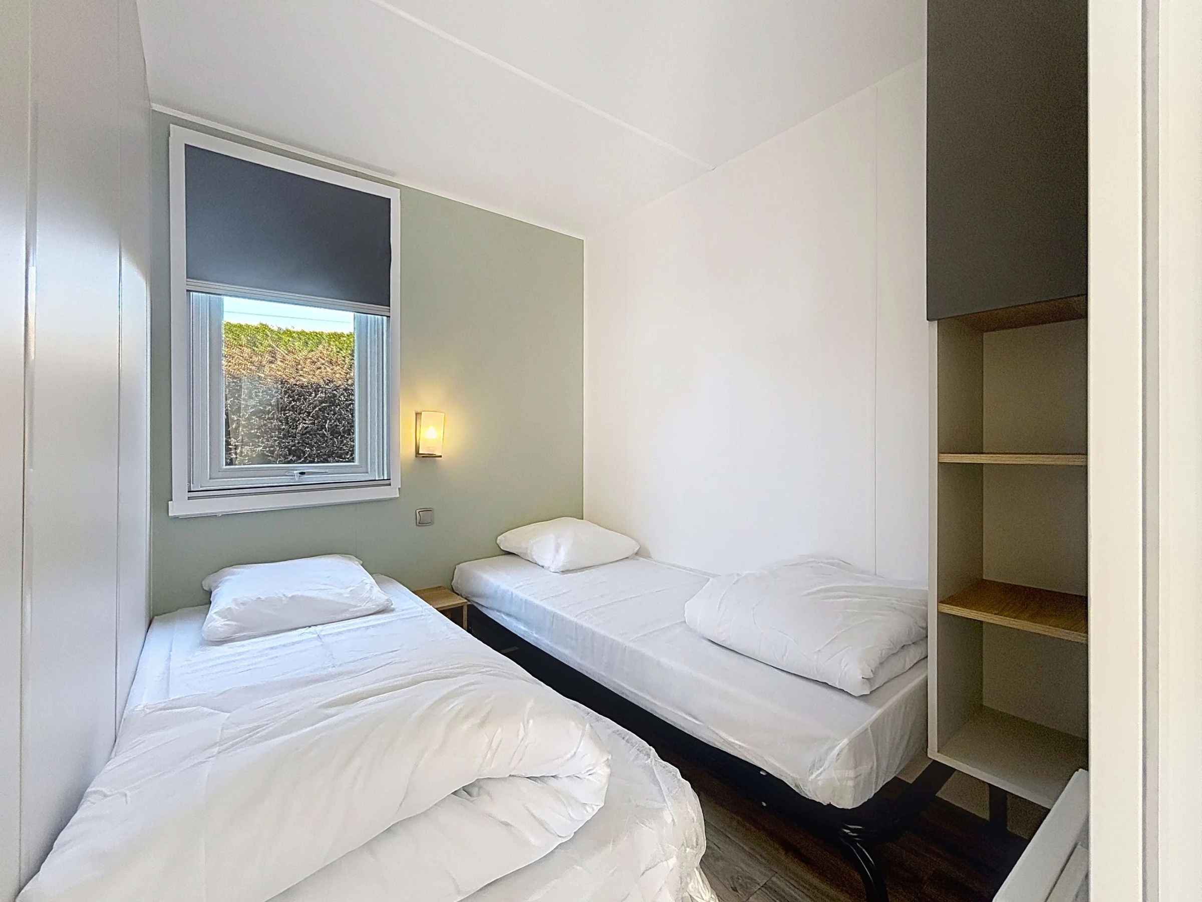 Laissez-vous séduire par ce Mobile-home 2 chambres, Grand confort, 4 personnes d'une surface de 31m² composé d’une pièce de vie avec un coin cuisine aménagée et équipée, d’un coin salon avec Tv et canapé, d’une chambre équipée d’un lit double (160x200), d’une deuxième chambre avec deux lits simples (90), une salle d’eau et wc séparé. Vous pourrez profiter de la terrasse en bois couverte et équipée . Un emplacement de parking est disponible sur la parcelle, uniquement pour un seul véhicule.