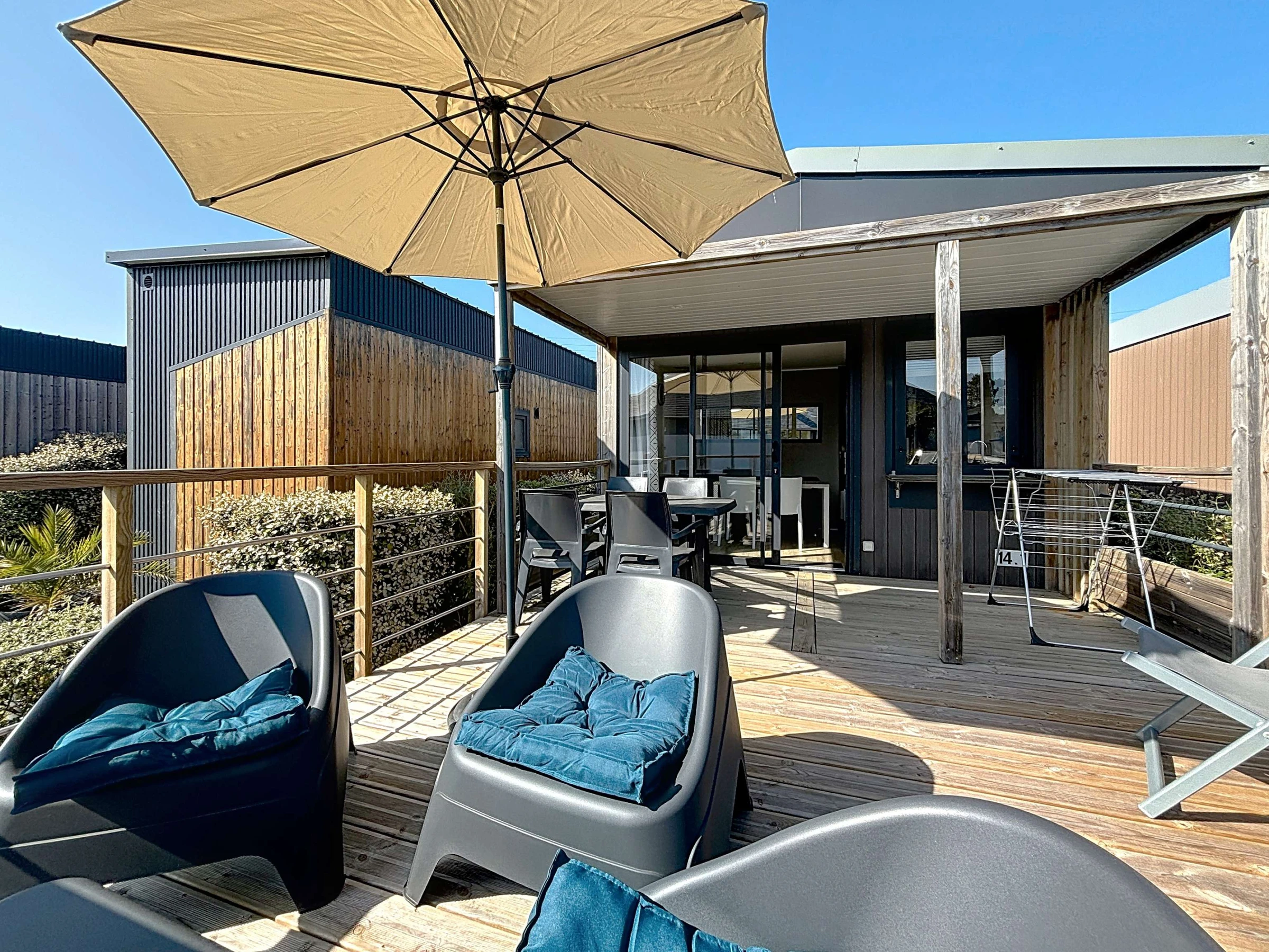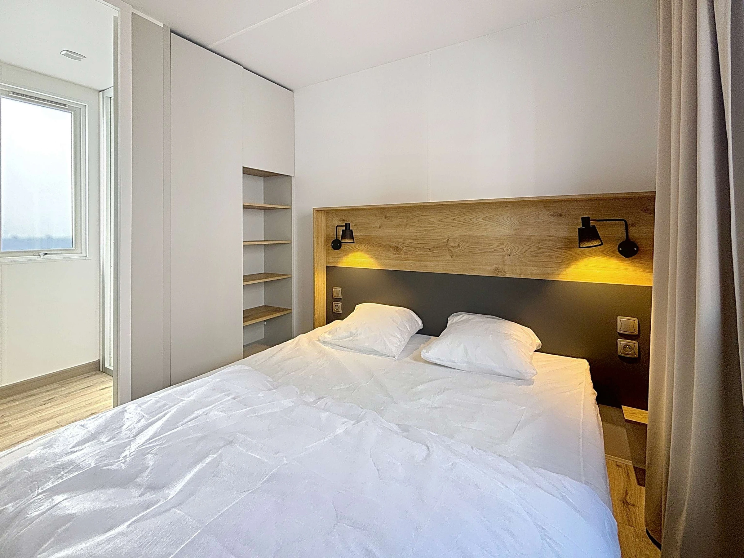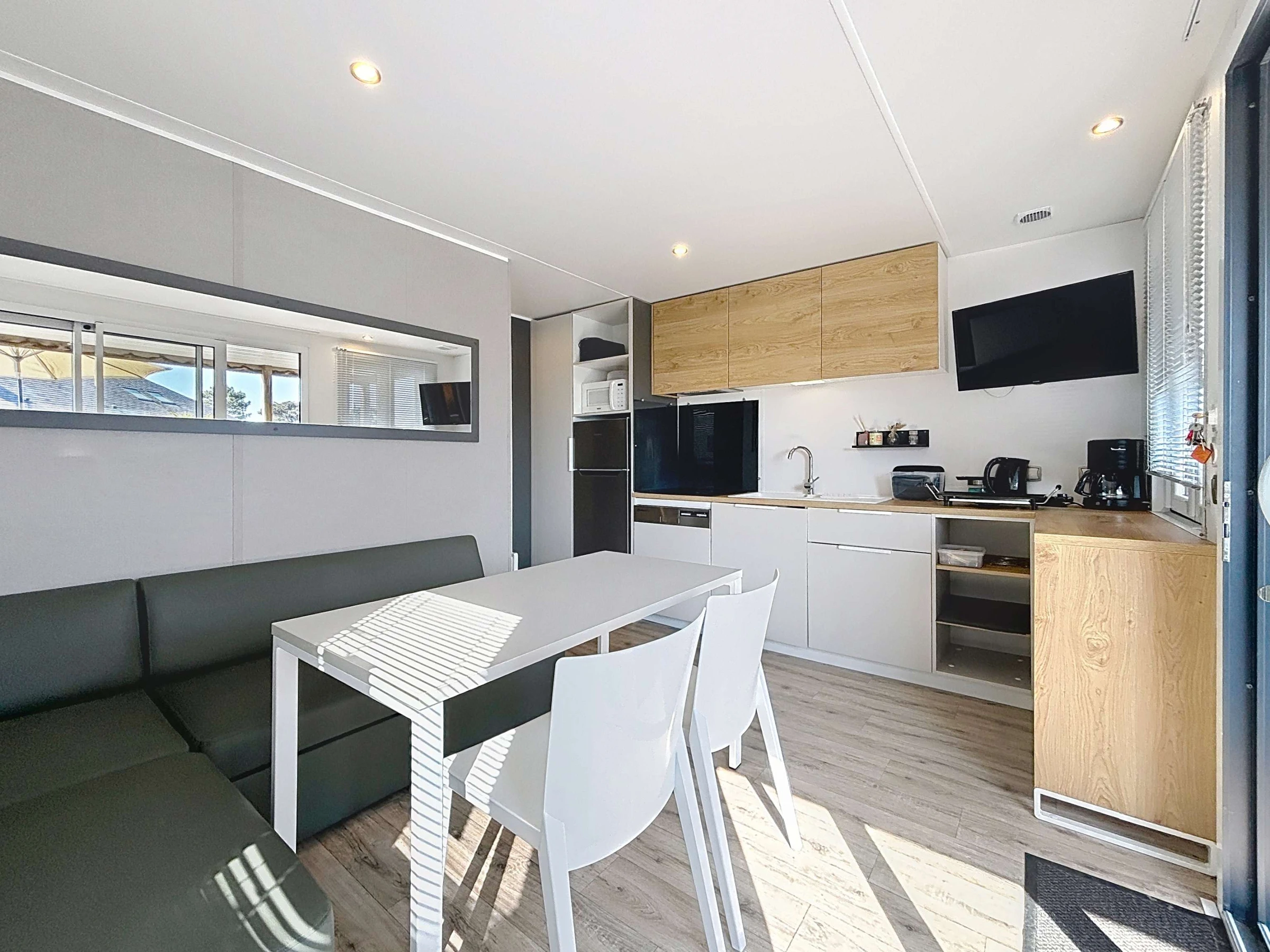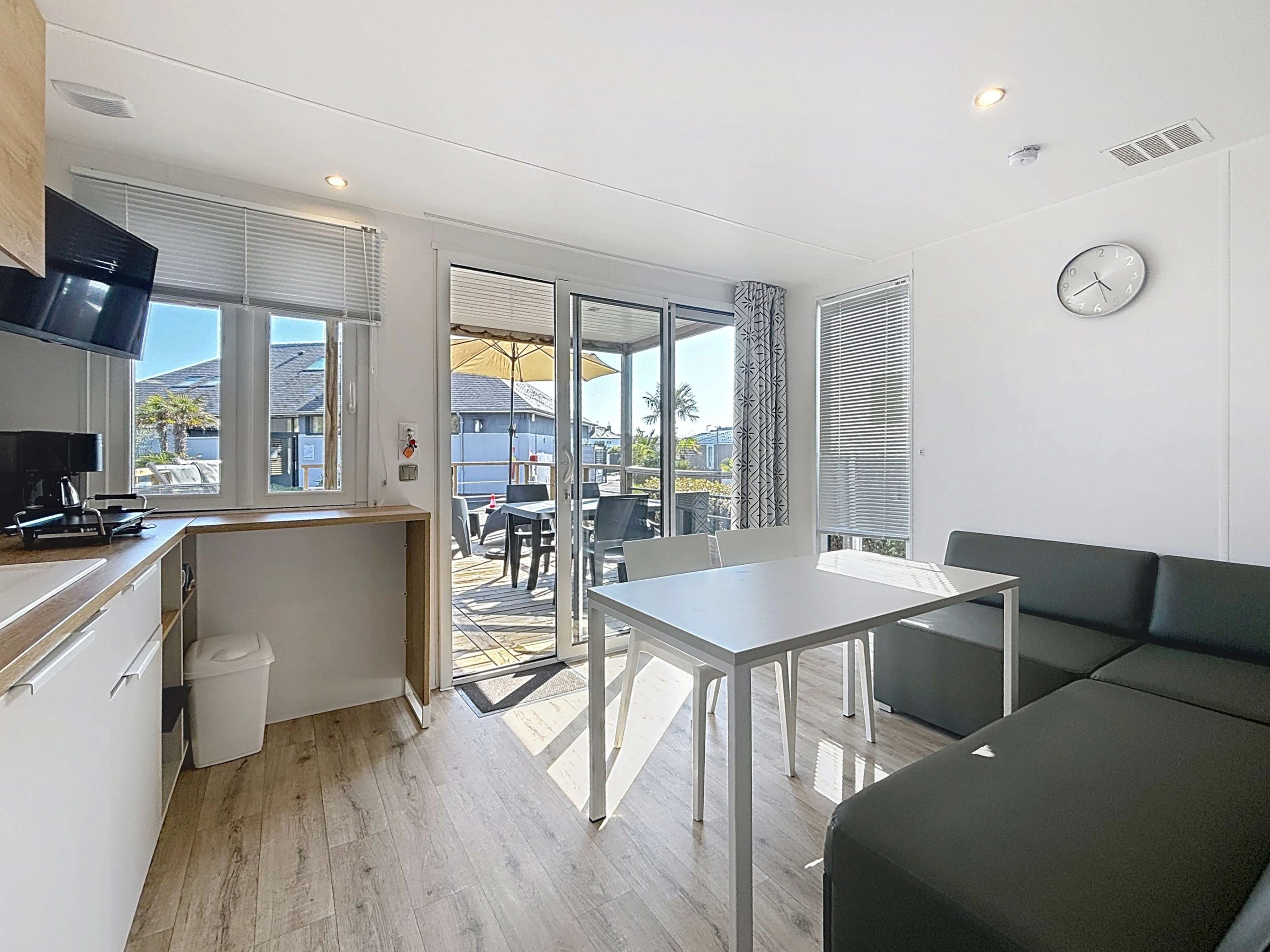 Laissez-vous séduire par ce Mobil-home 2 chambres, Grand confort, 4 personnes d'une surface de 28m² composé d’une pièce de vie avec un coin cuisine aménagée et équipée, d’un coin salon avec Tv et canapé, d’une chambre équipée d’un lit double (160x200), d’une deuxième chambre avec deux lits superposés (90cm), une salle d’eau et wc séparé. Vous pourrez profiter de la terrasse en bois couverte et équipée, exposée plein sud. Un emplacement de parking est disponible sur la parcelle, uniquement pour un seul véhicule.