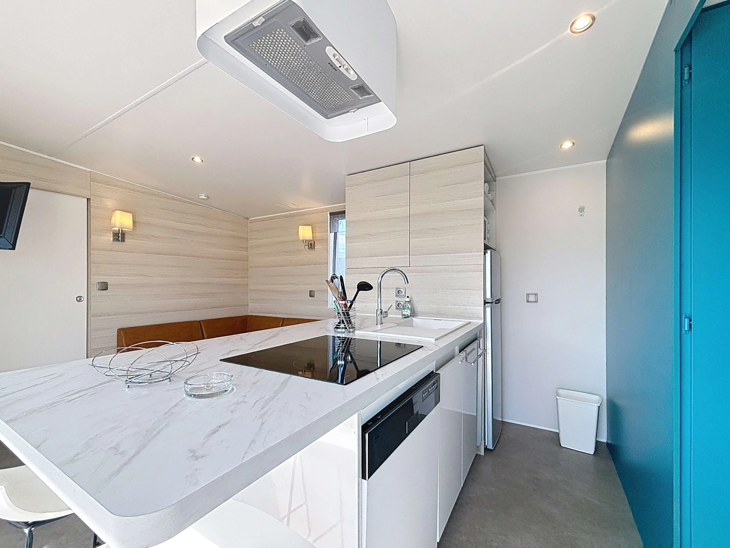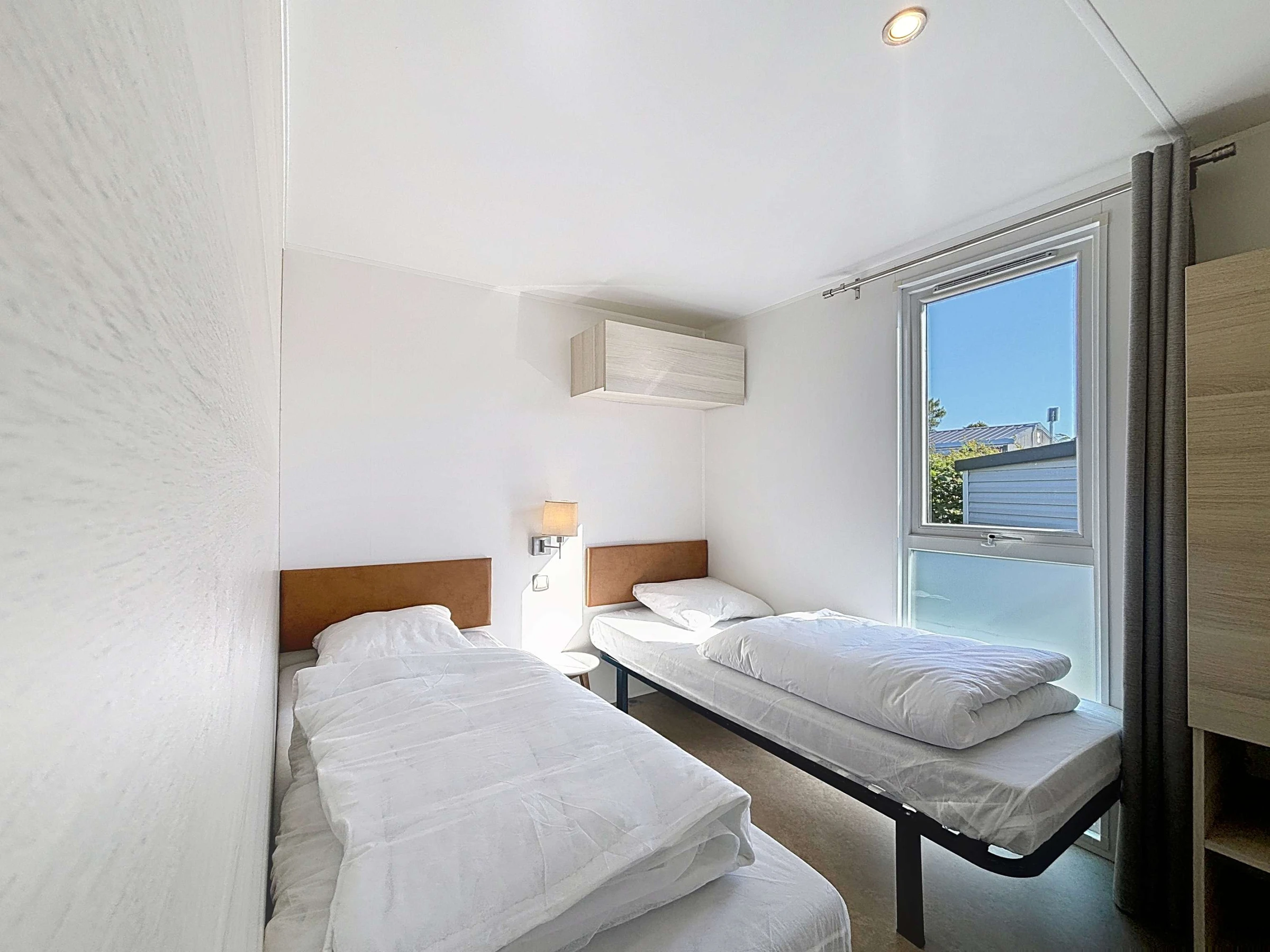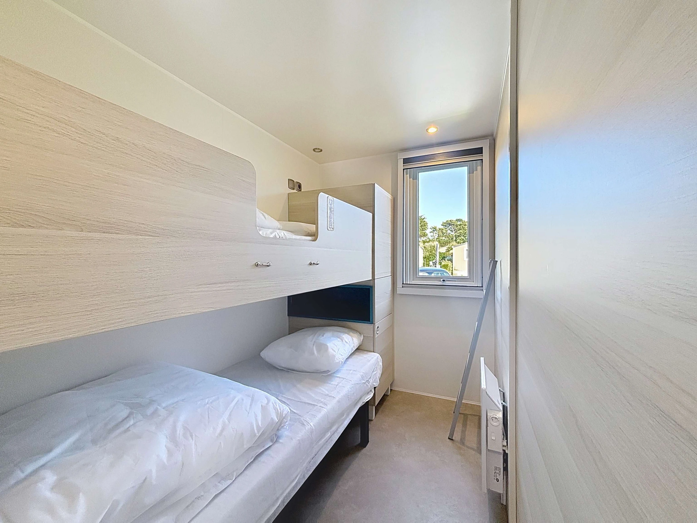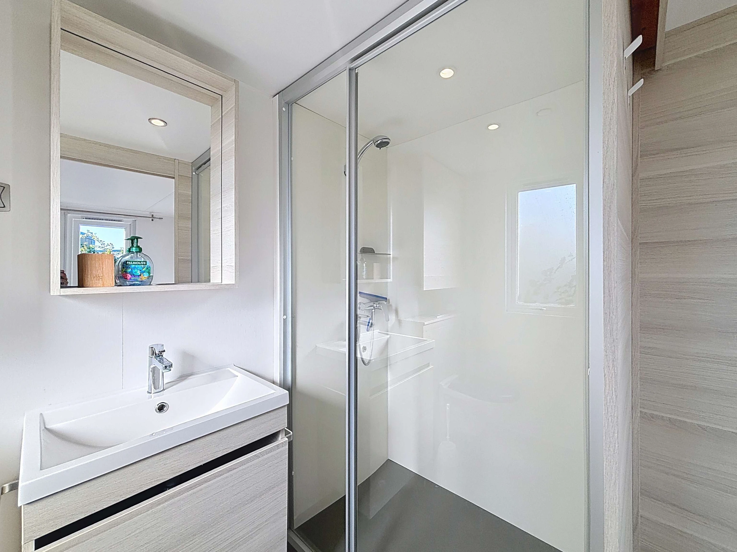 Laissez-vous séduire par ce Mobil-home de 40m² composé d’une pièce de vie avec un coin cuisine aménagée et équipée, d’un coin salon avec canapé et TV, d’une chambre parentale avec lit double (160x200) et sa salle d’eau attenante, d'une chambre avec deux lits simples (90), une chambre avec 2 lits superposés et d’une deuxième salle d’eau et wc séparé. Celui-ci est équipé d’une grande terrasse en bois pour manger dehors ou prendre un bain de soleil sur les transats.
