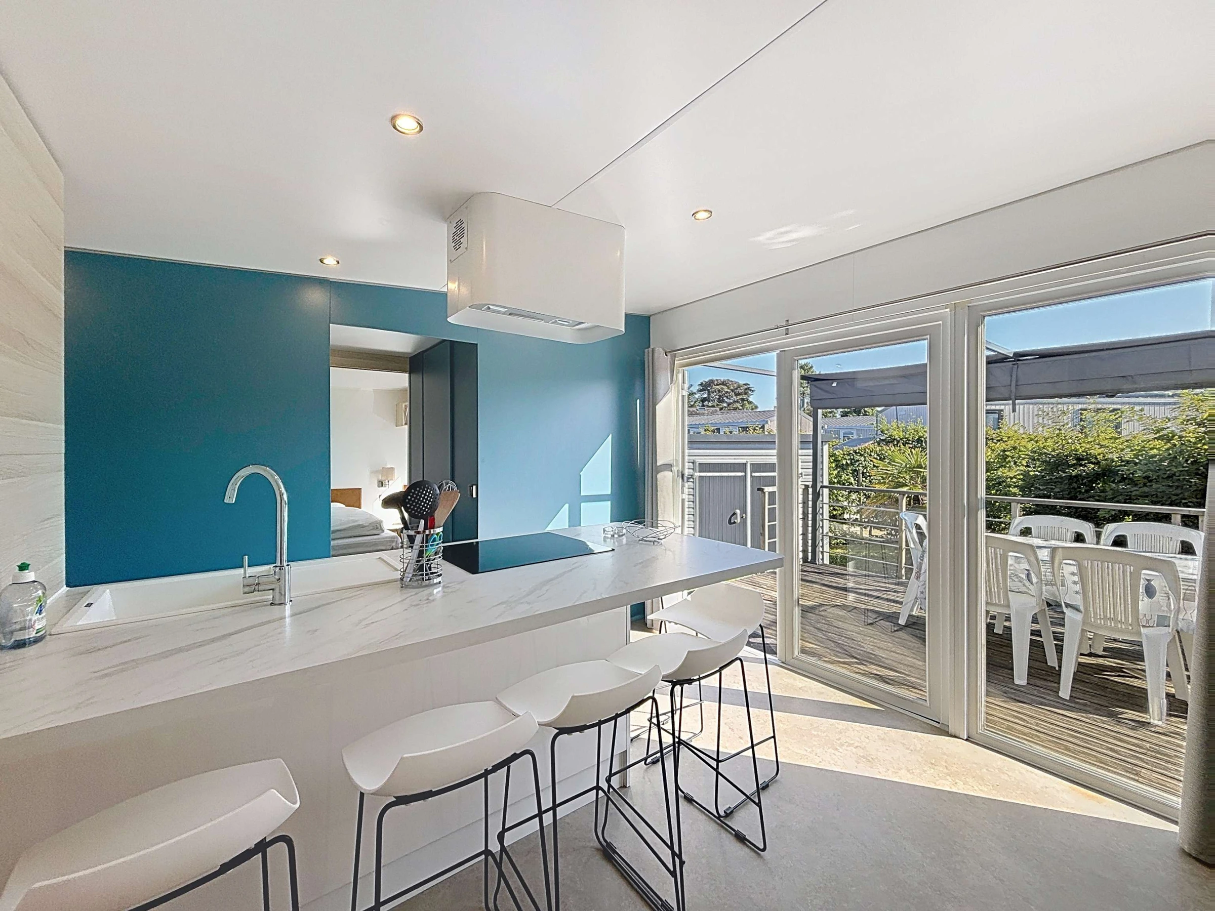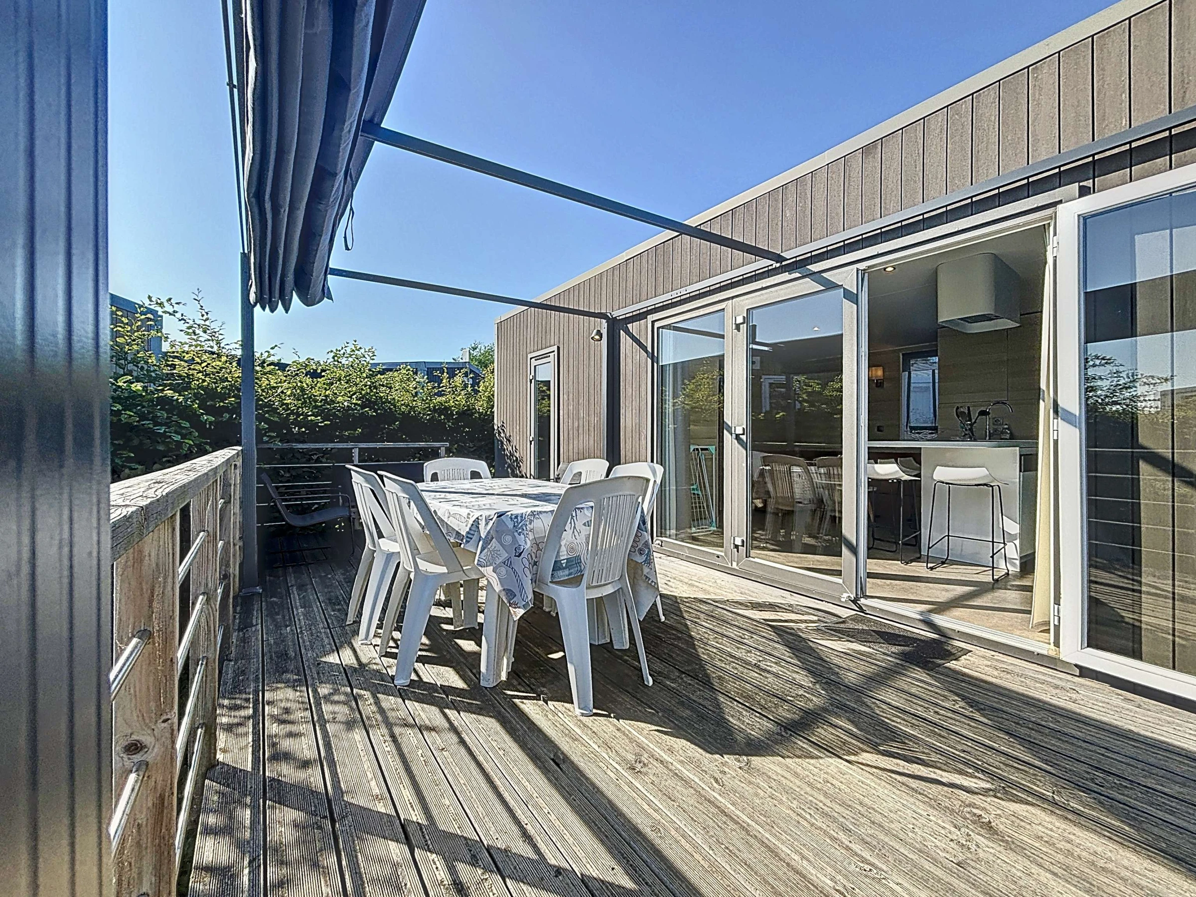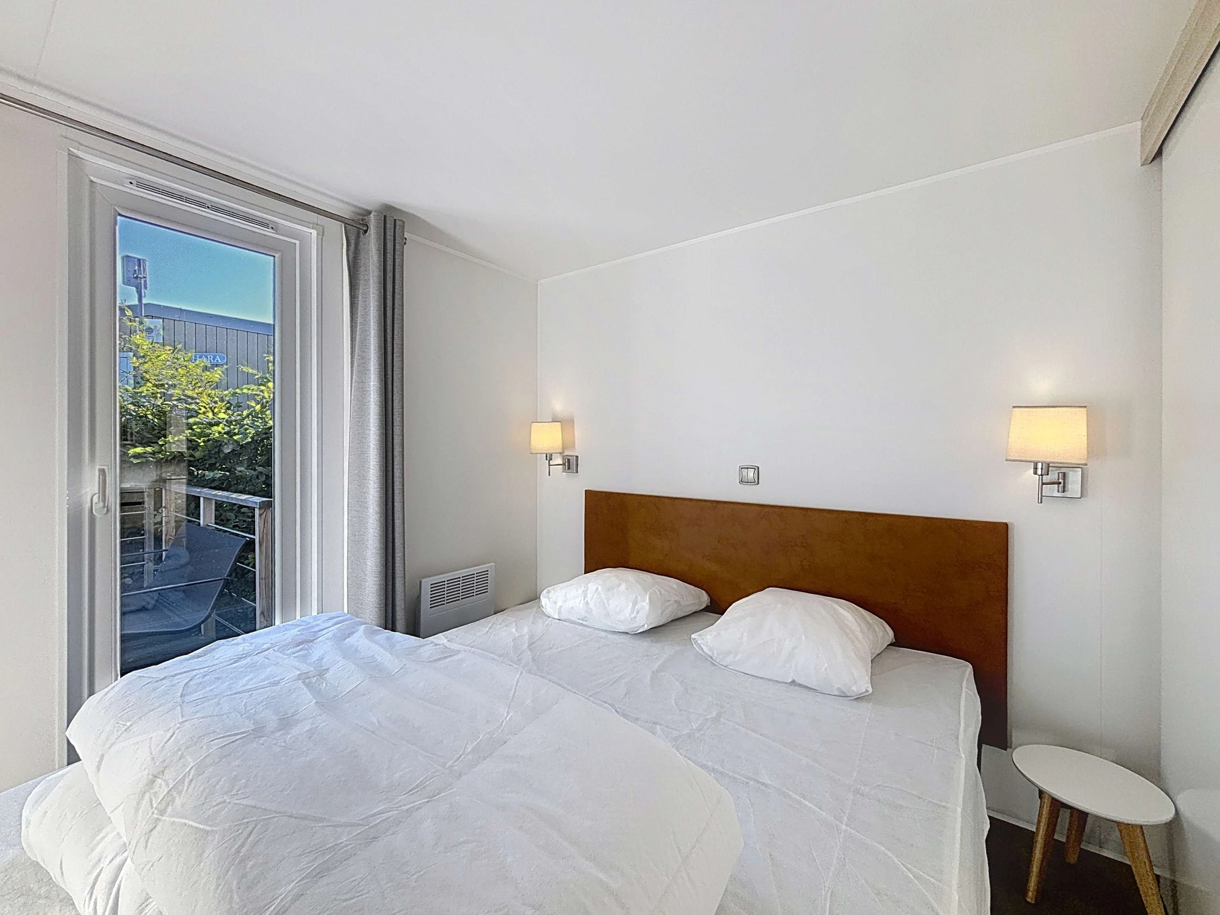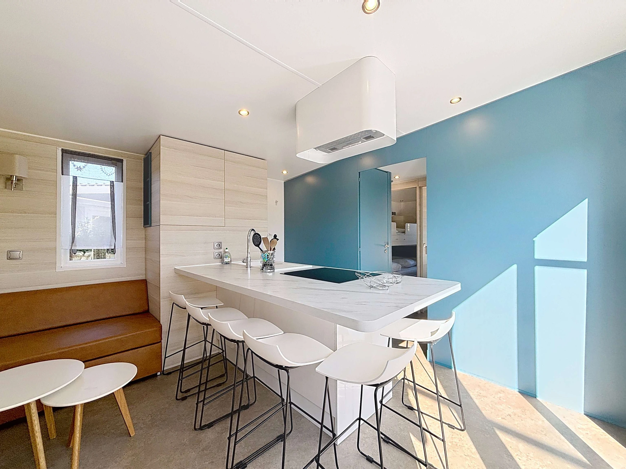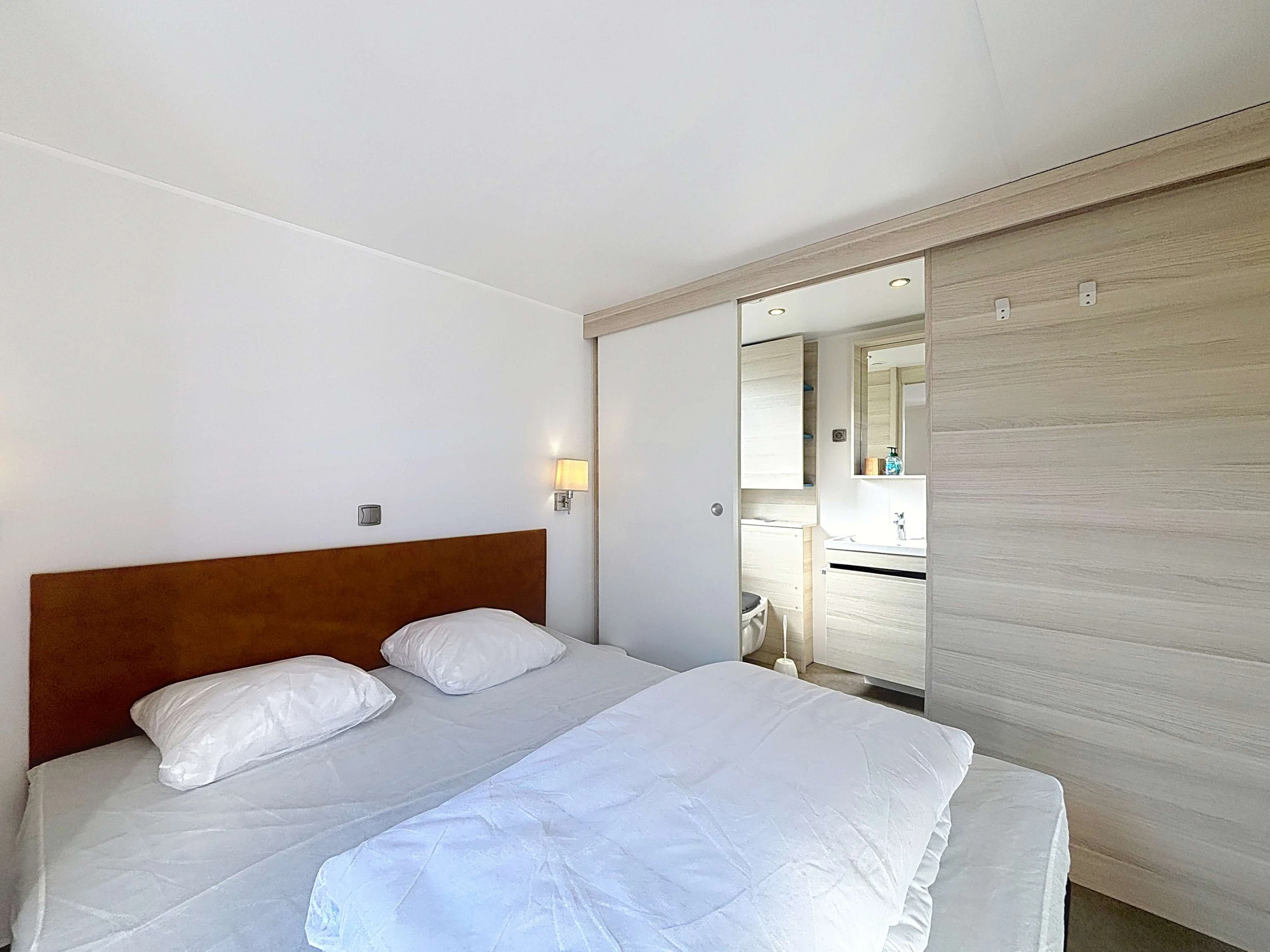 Laissez-vous séduire par ce Mobil-home de 40m² composé d’une pièce de vie avec un coin cuisine aménagée et équipée, d’un coin salon avec canapé et TV, d’une chambre parentale avec lit double (160x200) et sa salle d’eau attenante, d'une chambre avec deux lits simples (90), une chambre avec 2 lits superposés et d’une deuxième salle d’eau et wc séparé. Celui-ci est équipé d’une grande terrasse en bois pour manger dehors ou prendre un bain de soleil sur les transats.