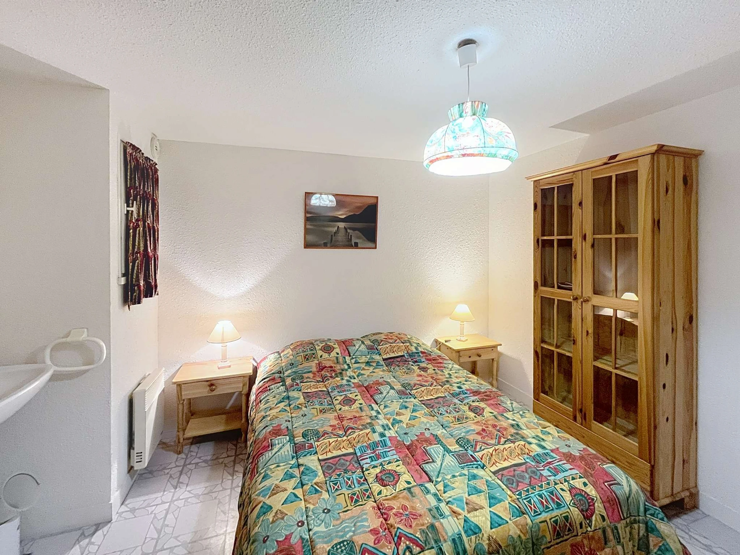 L'appartement se compose d'un séjour salon (canapé convertible, télévision) donnant sur une terrasse (table, chaises de jardin et parasol), un coin cuisine (deux plaques électriques, réfrigérateur, mini four, micro ondes, lave-vaisselle), une chambre avec un lit de 140, une salle d'eau (douche, lavabo), wc, une chambre (sans ouverture) avec un lit de 140 avec un lavabo et placard, Garage au sous sol (réfrigérateur, lave linge, sèche linge, fer à repasser).
