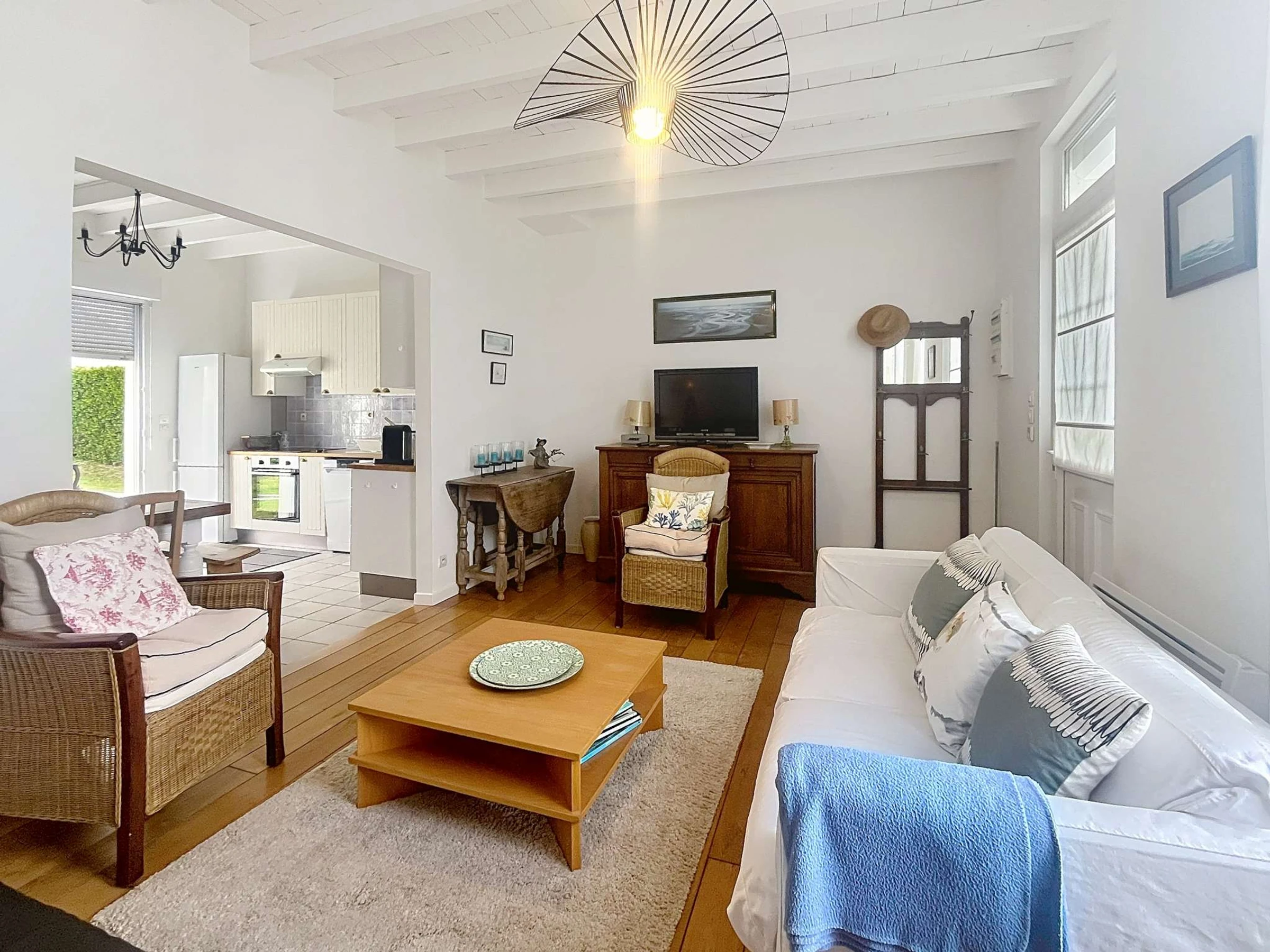 À 200m de la plage et moins d'un 1km du bourg et des commerces de Jullouville, jolie maison comprenant un salon, un coin repas et coin cuisine (four, plaques vitrocéramique, micro-ondes, lave-vaisselle, réfrigérateur/case congélateur, lave-linge et sèche-linge) donnant sur un agréable jardin. Au 1er étage, une chambre avec un lit de 140, une chambre avec deux lits de 90, une salle d'eau (douche, lavabo) et toilettes. Au 2e étage, une mezzanine avec un bureau et une chambre avec deux lits de 90 rapprochés. Jardin avec salon de jardin et barbecue.