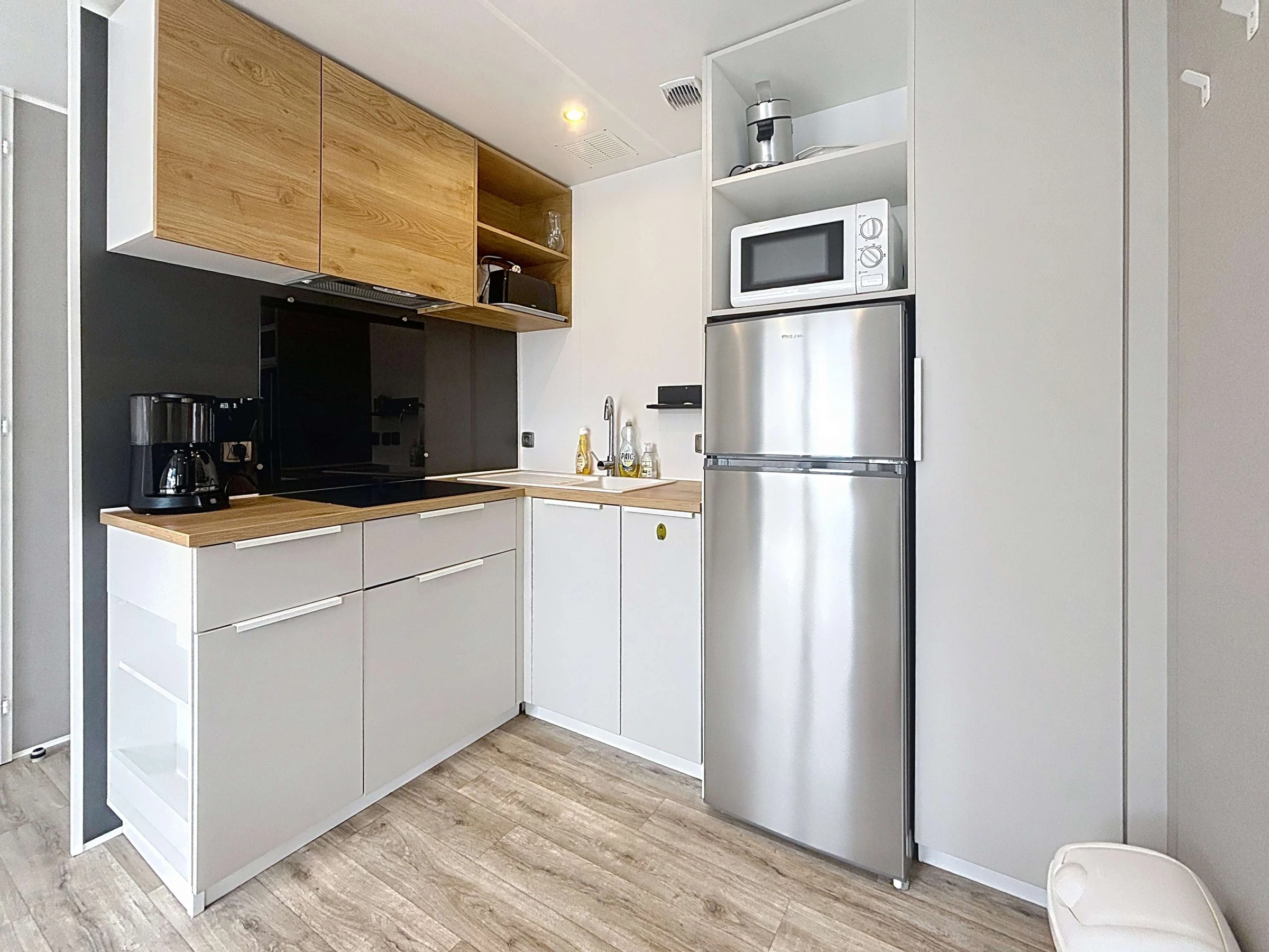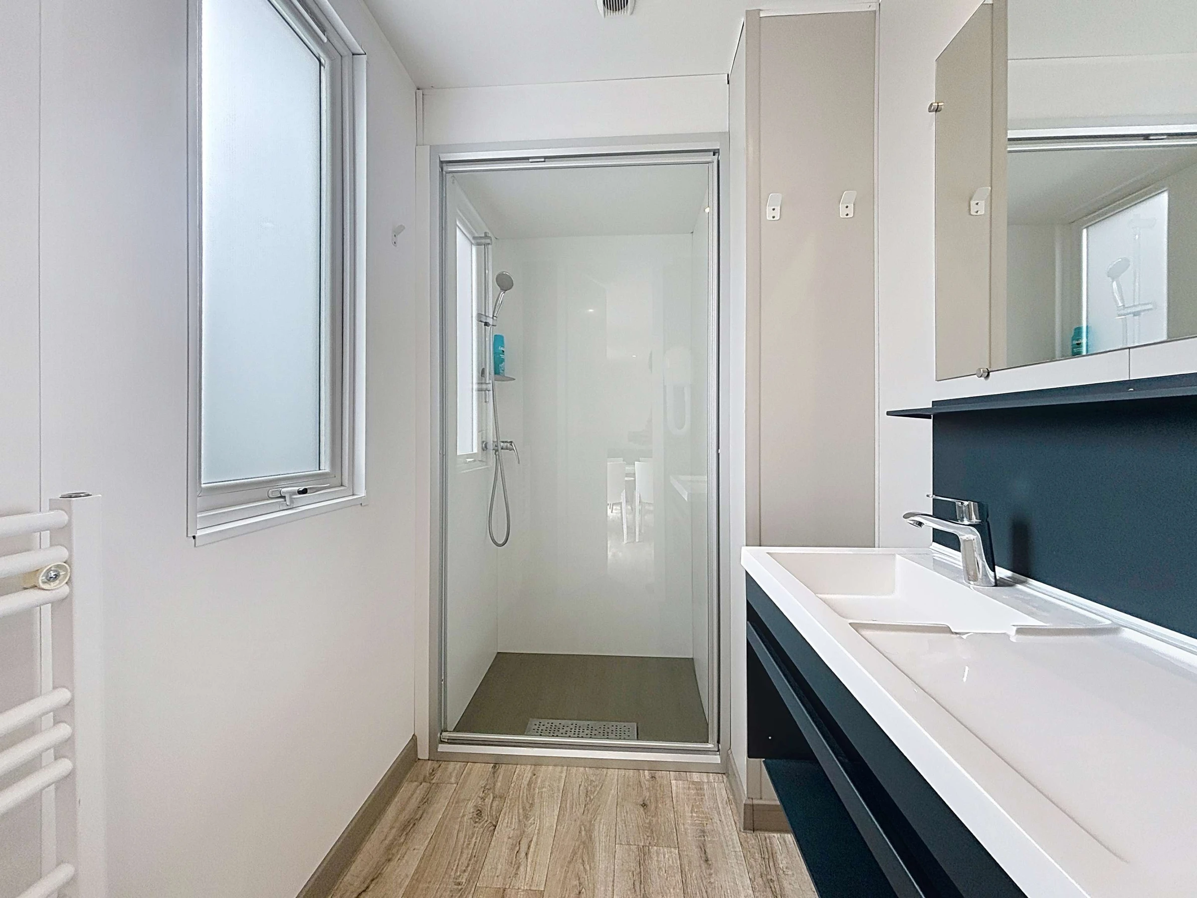 Laissez-vous séduire par ce Mobile-home 2 chambres, Grand confort, 4 personnes d'une surface de 28m² composé d’une pièce de vie avec un coin cuisine aménagée et équipée, d’un coin salon avec Tv et canapé, d’une chambre équipée d’un lit double (160x200), d’une deuxième chambre avec deux lits simples (90), une salle d’eau et wc séparé. Vous pourrez profiter de la terrasse en bois équipée. Un emplacement de parking est disponible sur la parcelle, uniquement pour un seul véhicule.