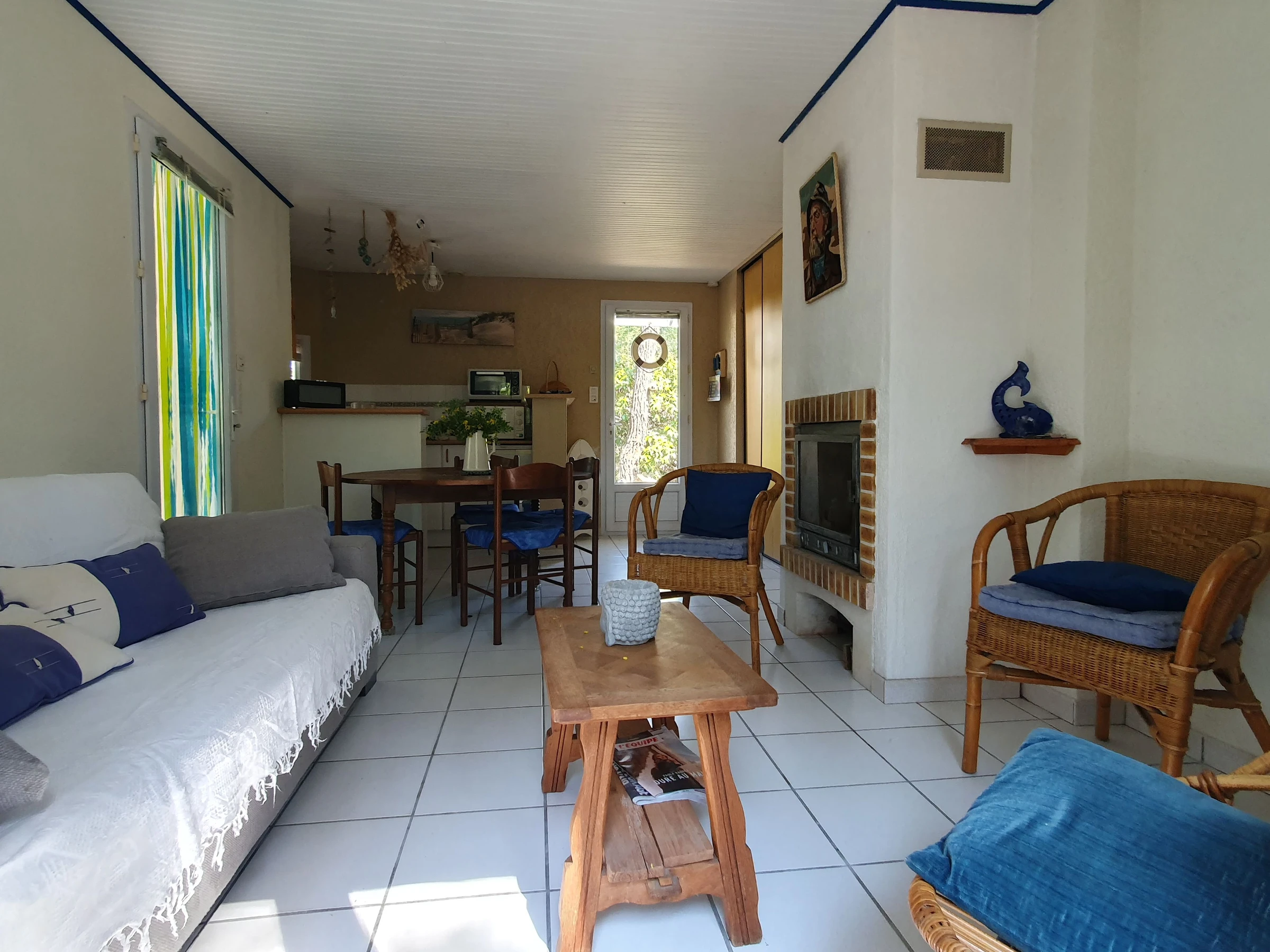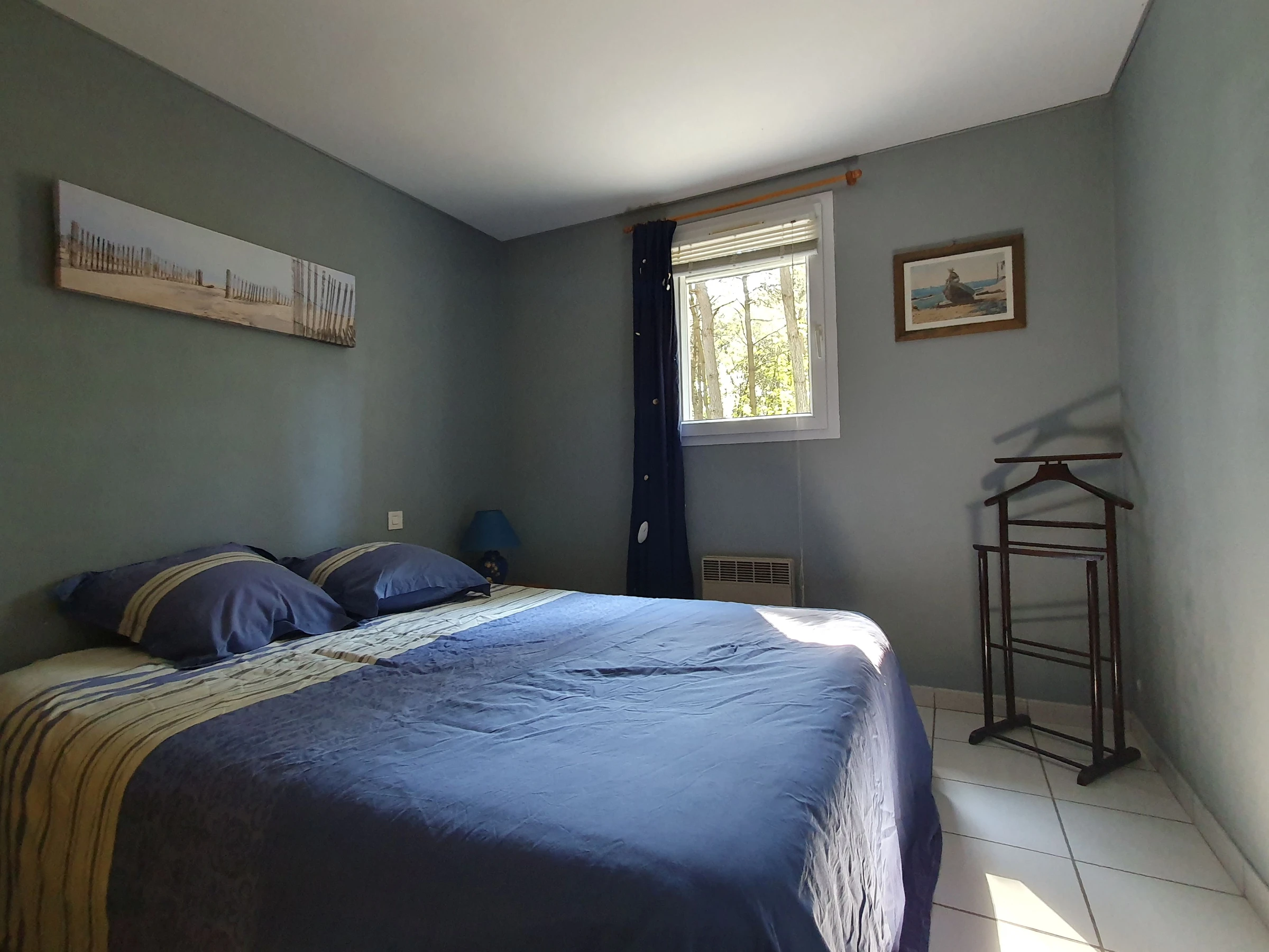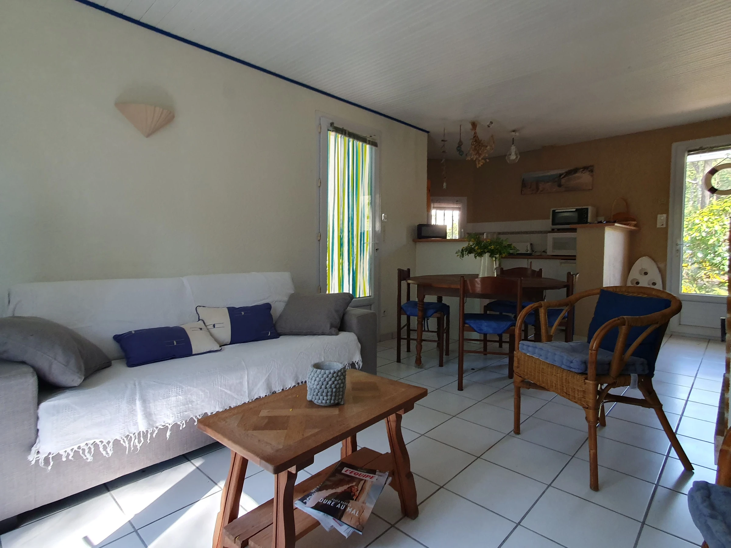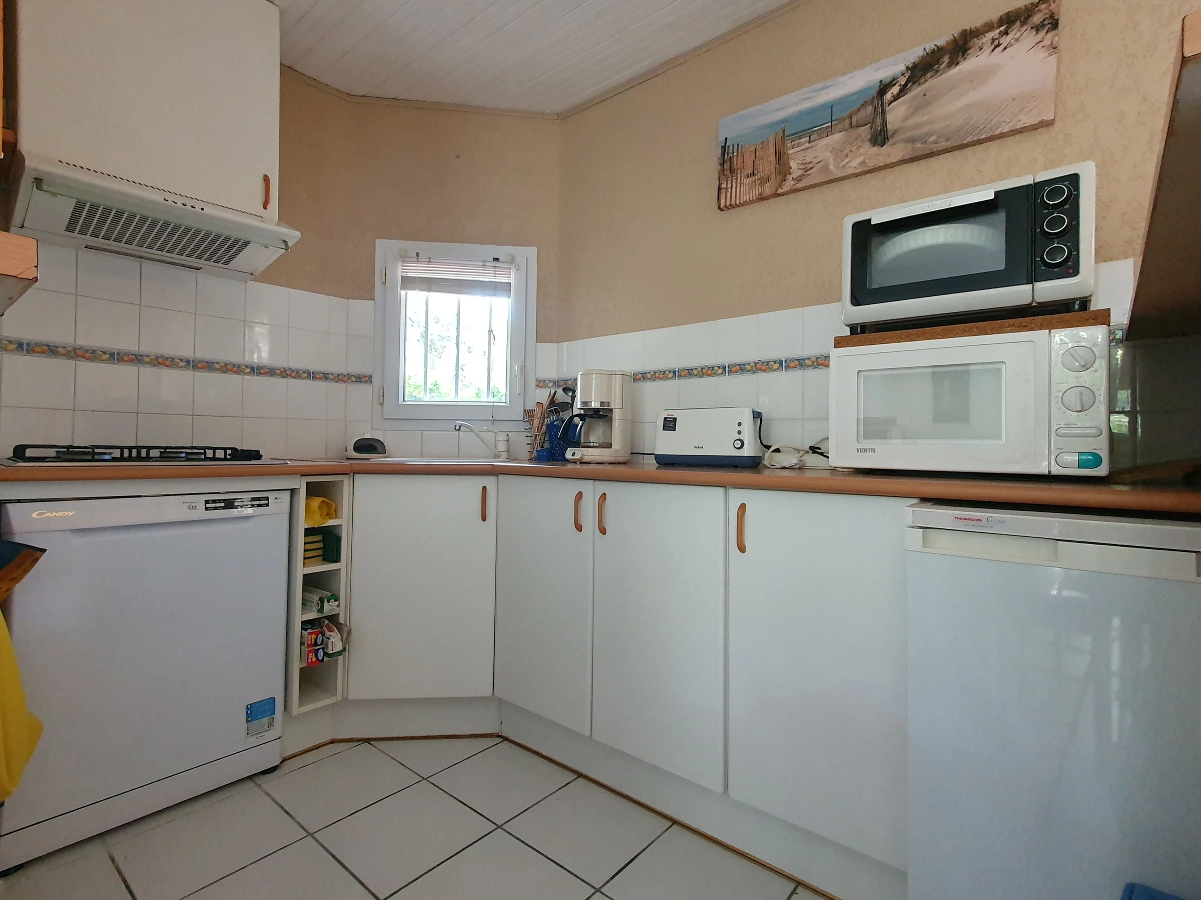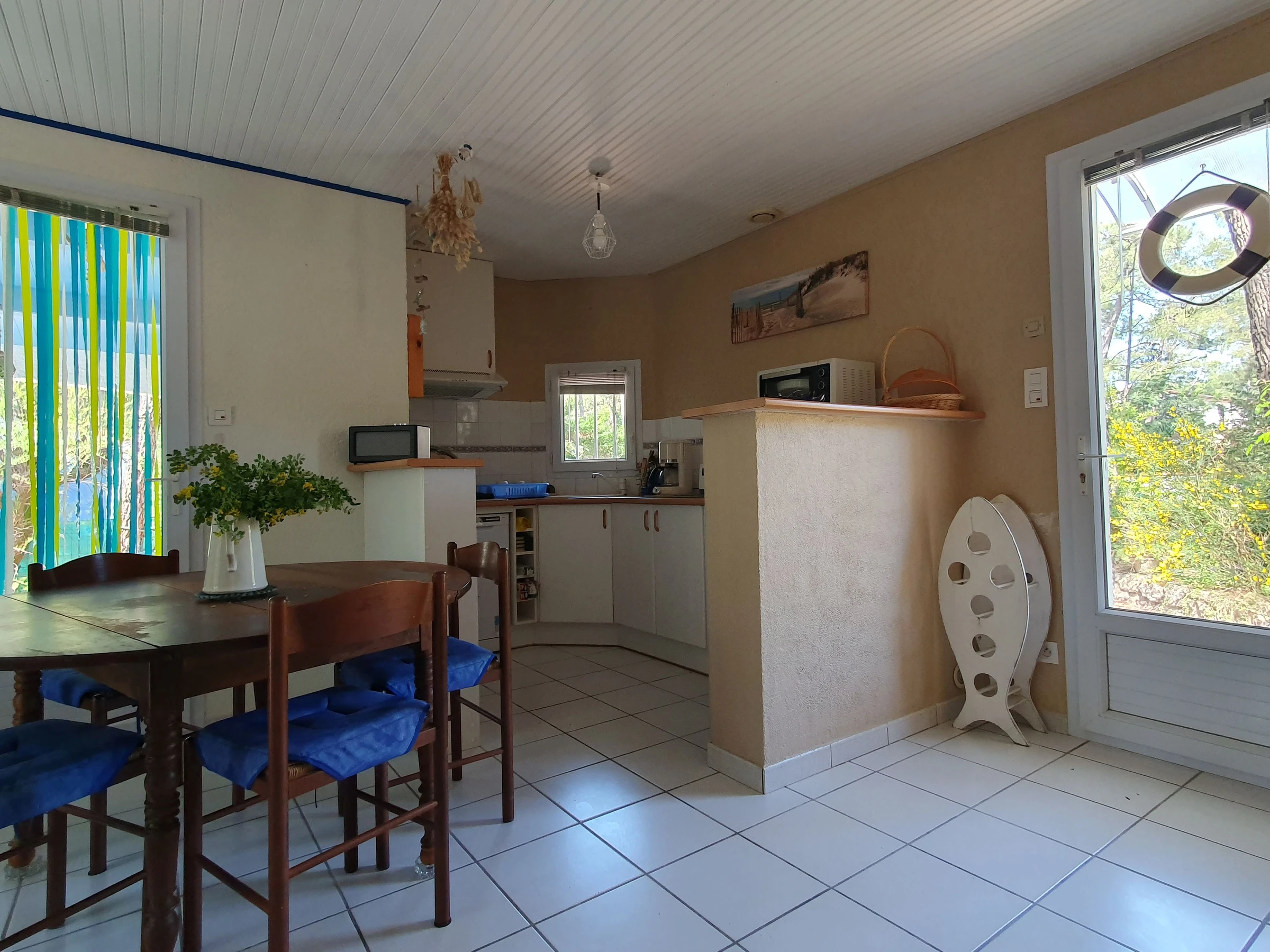 Située à 400 Mètres de la Plage et 3000 Mètres du centre bourg - Appréciée pour sa proximité de la forêt de pinèdes et ses sentiers pédestres pour des balades - Comprenant : Une pièce de vie avec TELEVISION, un coin cuisine équipé d’un petit frigo/freezer, LAVE VAISSELLE, 4 feux gaz, Micro ondes et mini-four - dégagement desservant une chambre avec un lit de 160 cm et une salle d’eau avec douche et double vasque, un WC, un cellier avec LAVE LINGE, évier et frigo/congélateur, une chambre avec 2 lits superposés de 90 cm, jolie terrasse sous auvent avec salon de jardin, transat et plancha. - Ménage au soin du locataire. Linge de maison non fourni, location possible auprès de notre partenaire, nous contacter. Chauffage du 1er octobre au 31 mai en sus selon relevé de compteur. Location wifi possible avec box 5G : 40€/semaine Maison en vente, visites possibles sur rendez vous à convenir de l'horaire avec vacanciers.