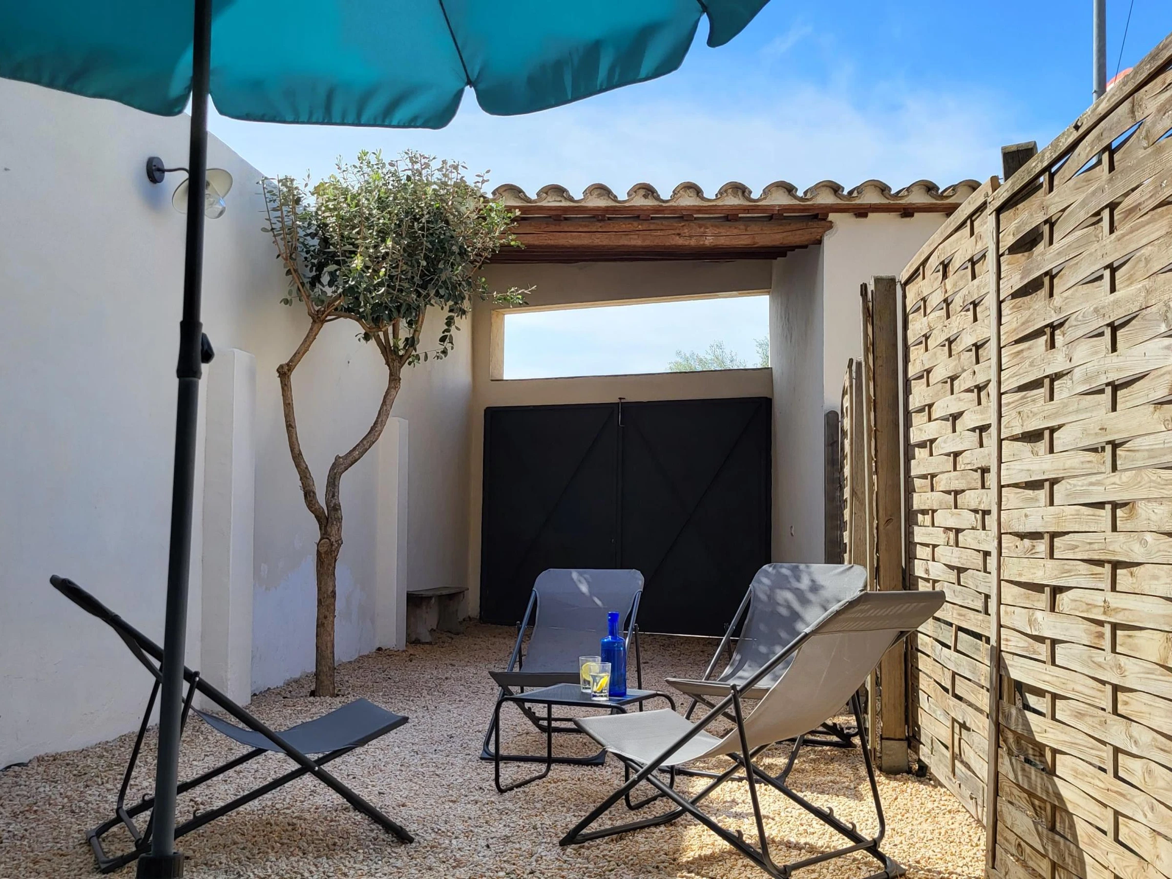intégrée (kitchenette), patio extérieur avec barbecue et salon de jardin. Salle