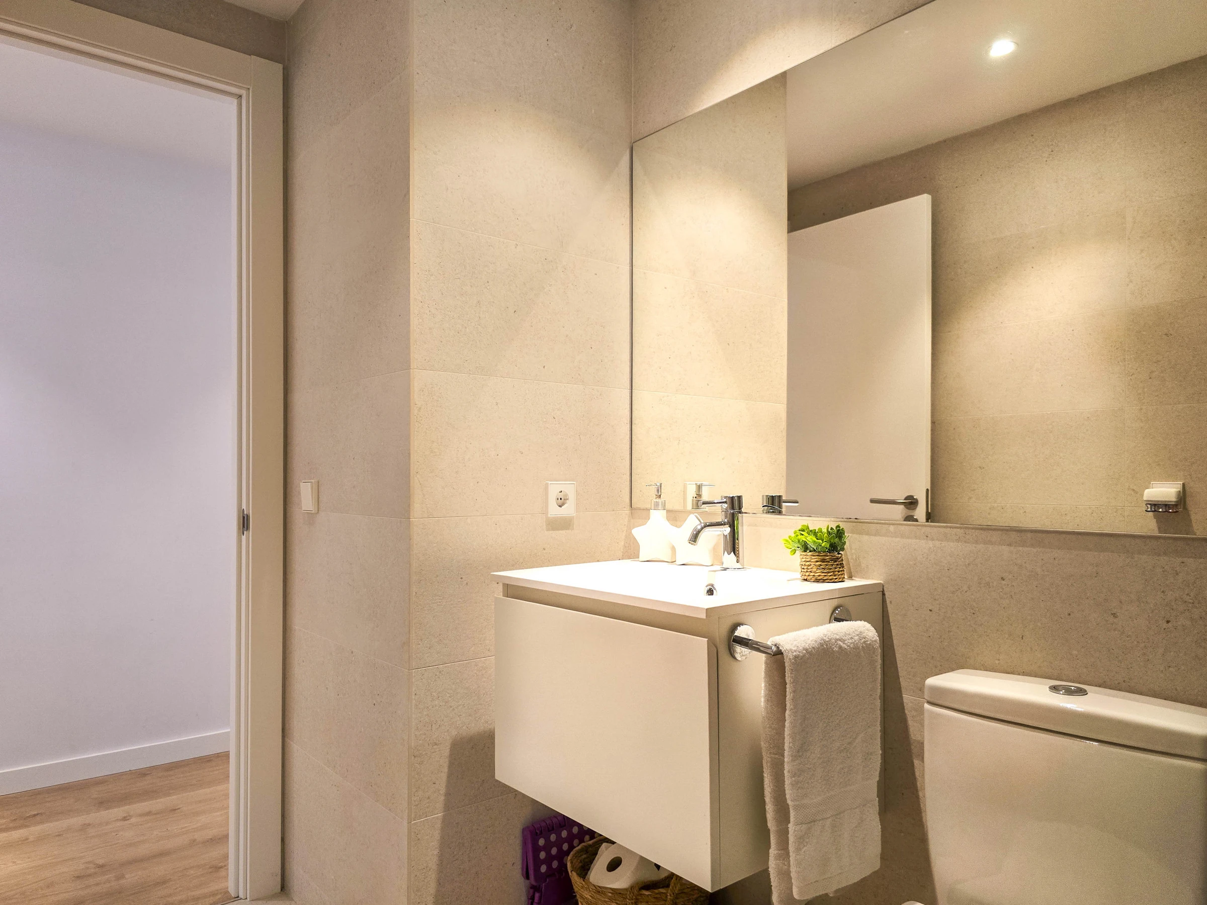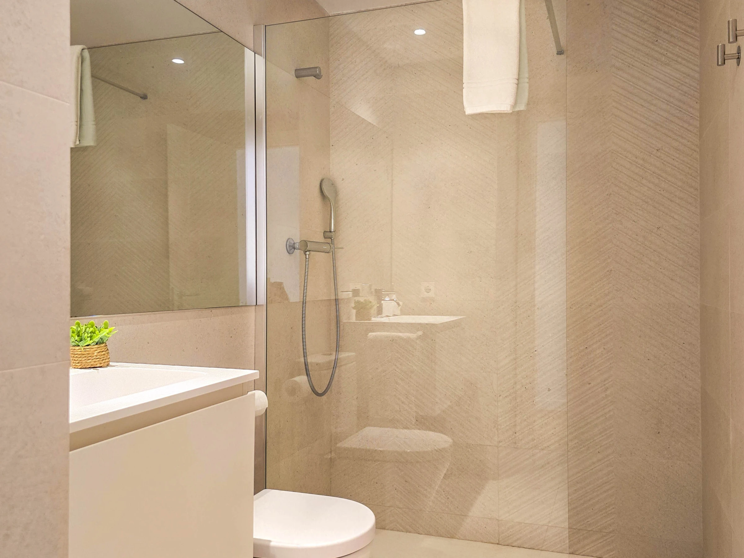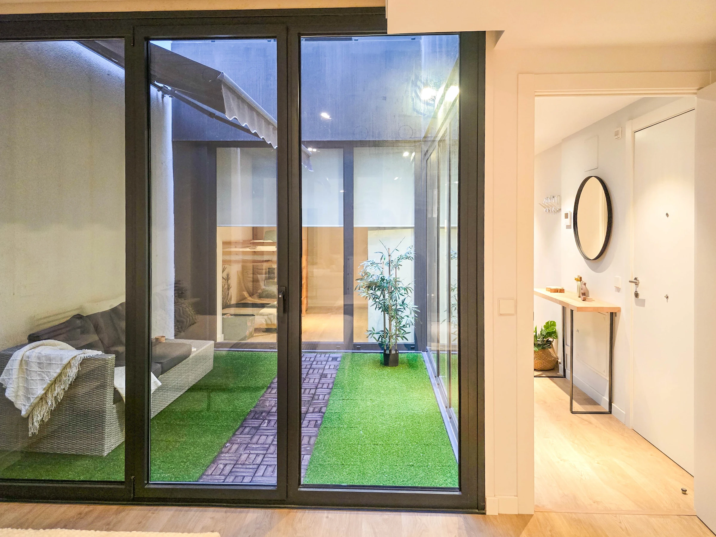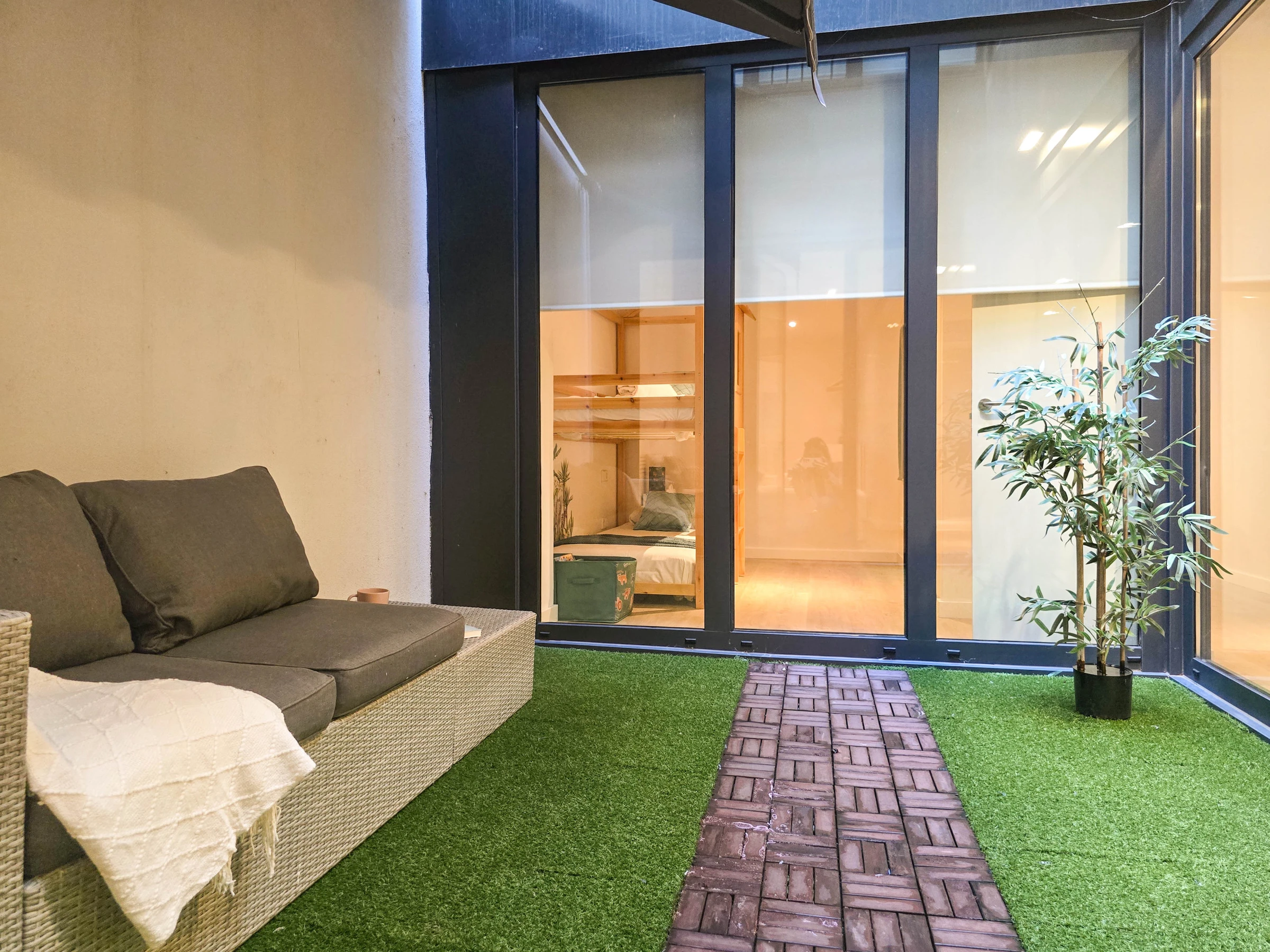 Il dispose de deux chambres bien distinctes : une suite avec lit double et salle de bain privée avec douche, et une seconde chambre avec lits superposés composée de deux lits simples, idéale pour les enfants ou les jeunes. Les deux chambres ont accès à un patio intérieur apportant lumière naturelle et ventilation. L’appartement dispose également d’une seconde salle de bain complète avec douche située dans le couloir.