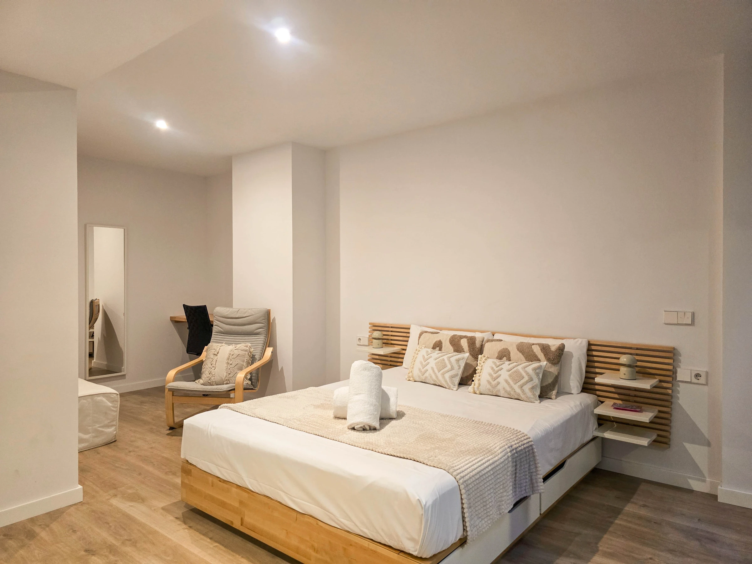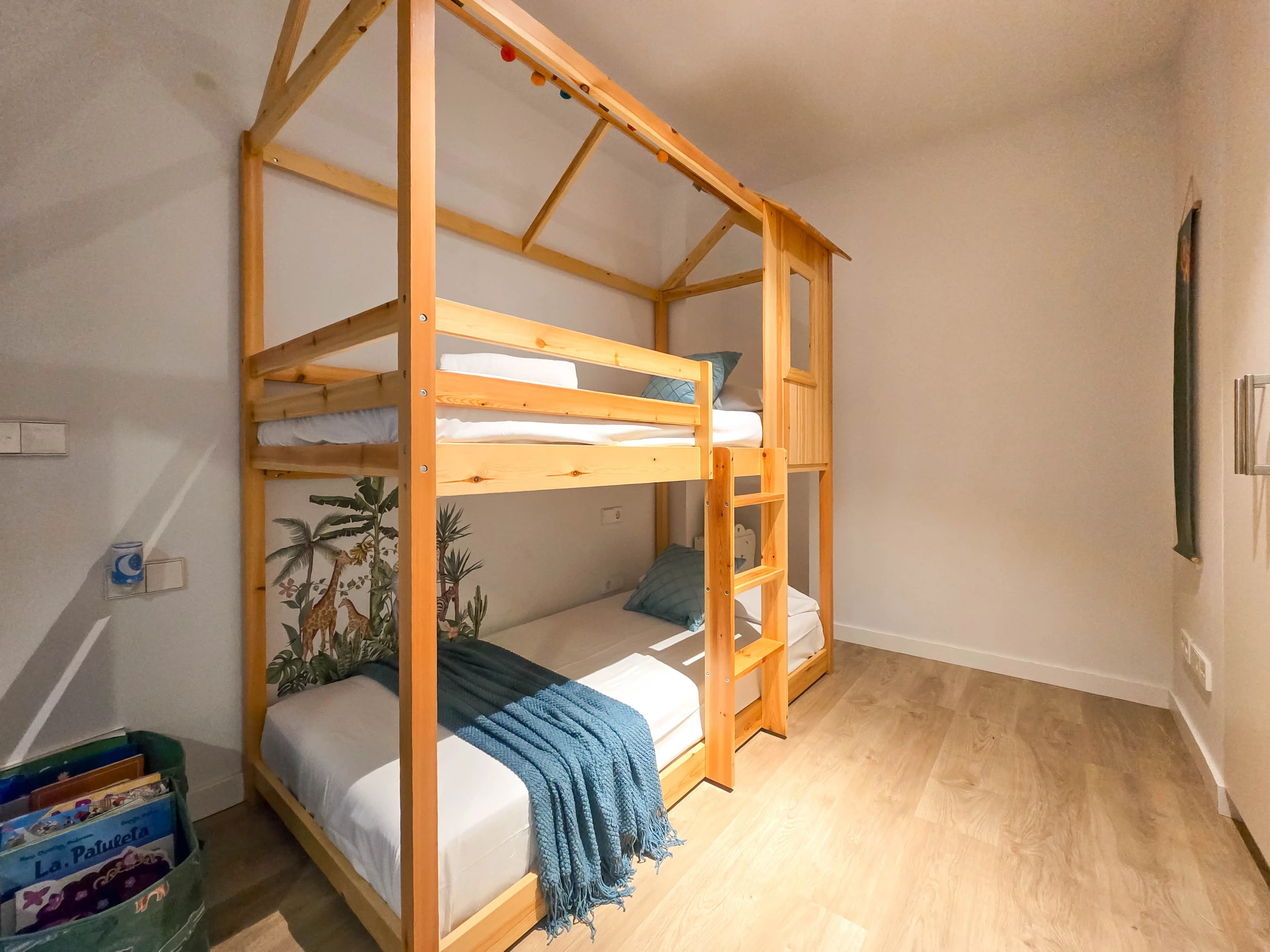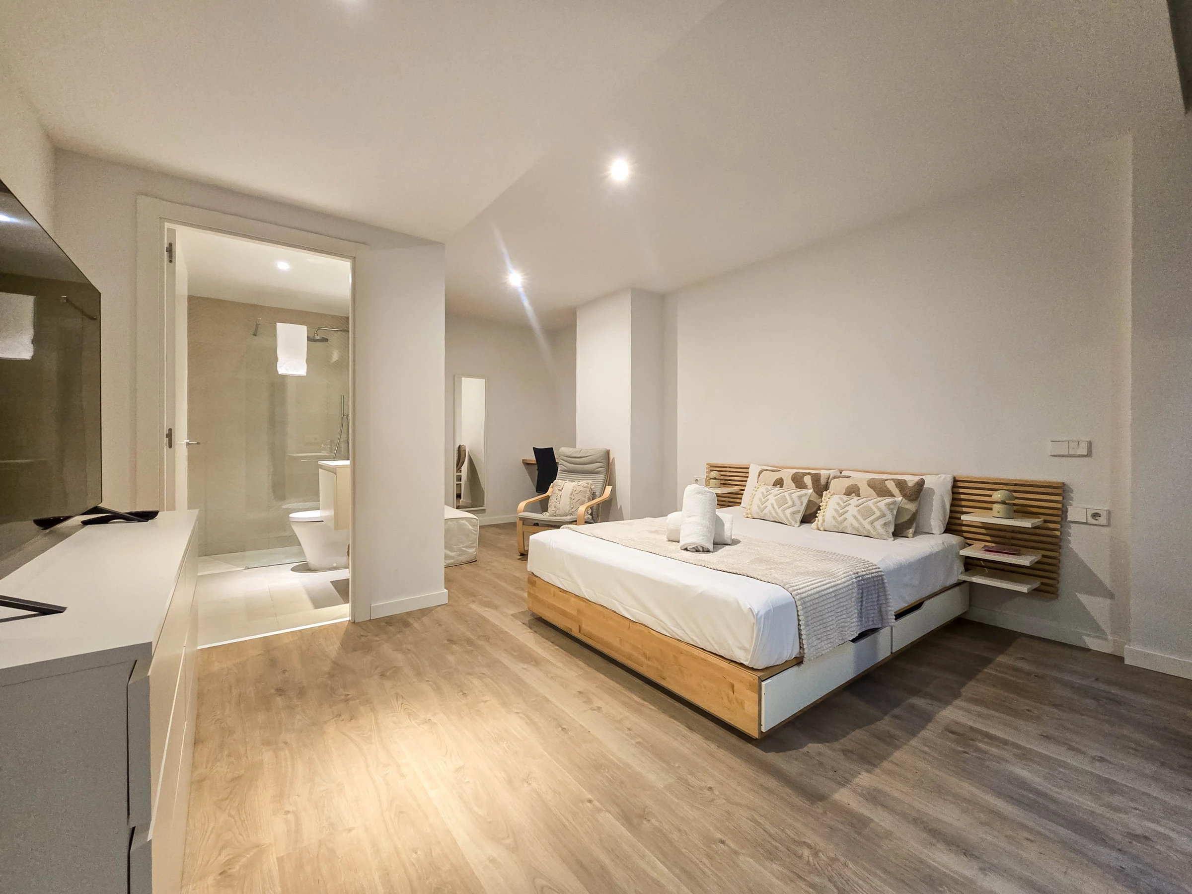 Il dispose de deux chambres bien distinctes : une suite avec lit double et salle de bain privée avec douche, et une seconde chambre avec lits superposés composée de deux lits simples, idéale pour les enfants ou les jeunes. Les deux chambres ont accès à un patio intérieur apportant lumière naturelle et ventilation. L’appartement dispose également d’une seconde salle de bain complète avec douche située dans le couloir.