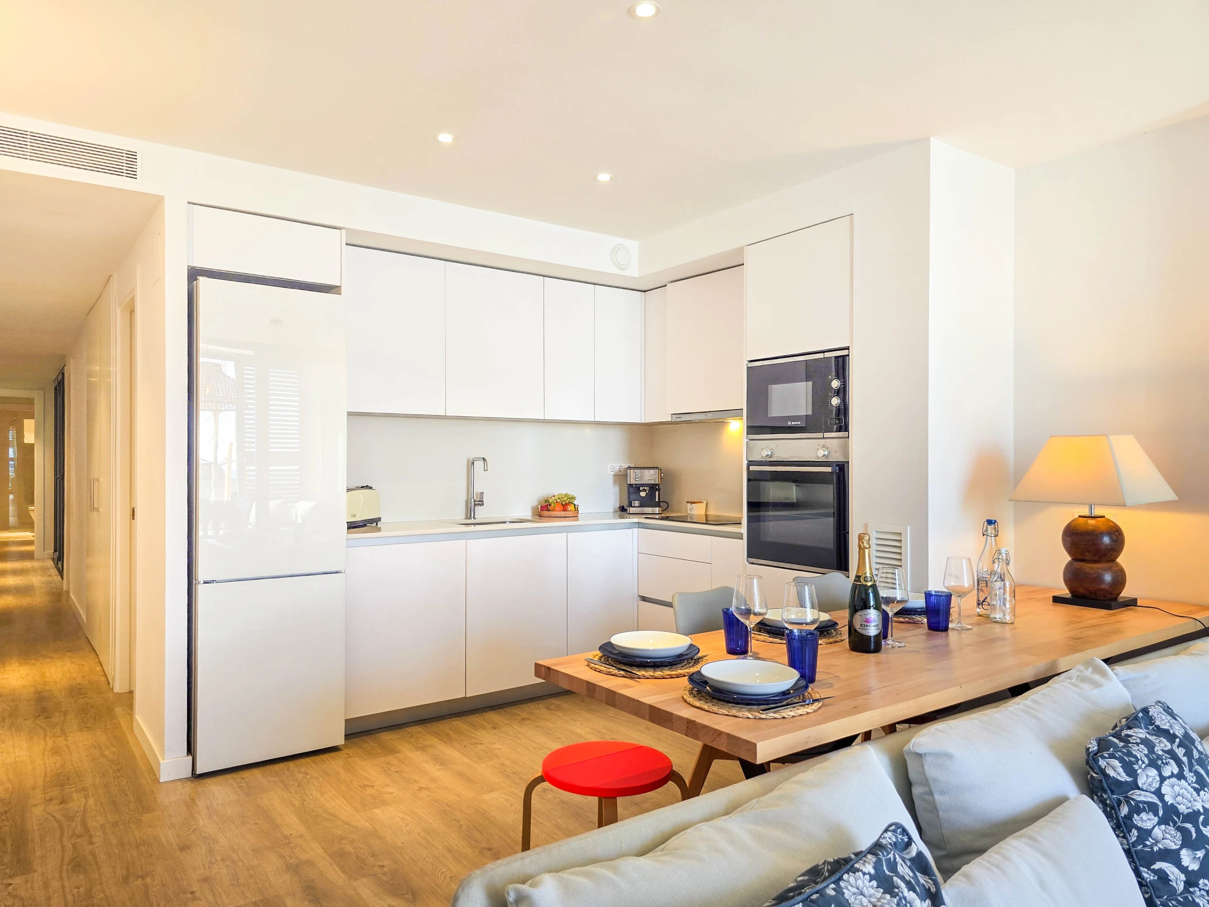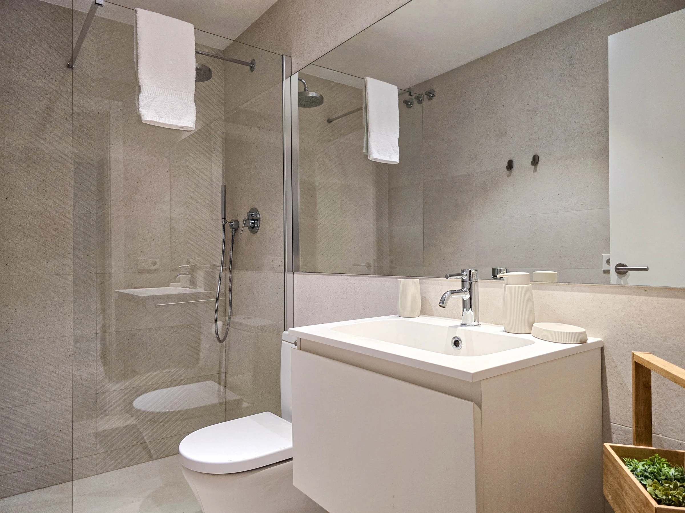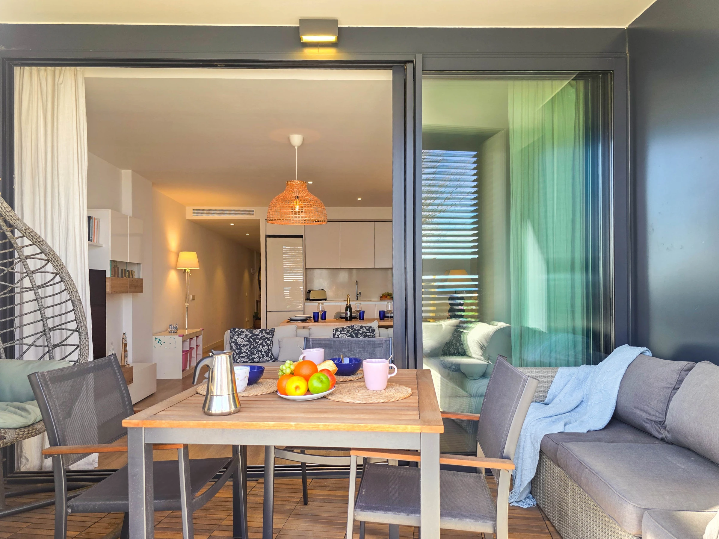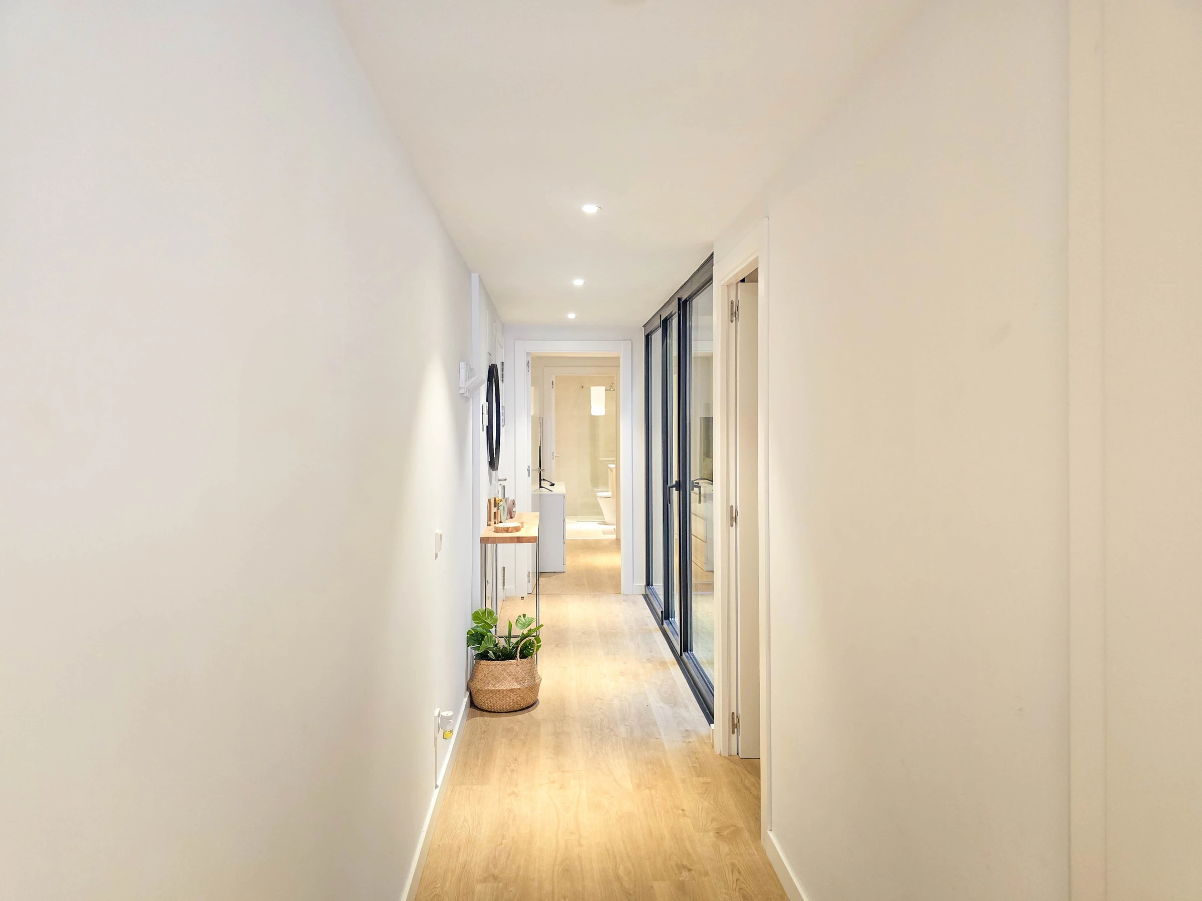 Il dispose de deux chambres bien distinctes : une suite avec lit double et salle de bain privée avec douche, et une seconde chambre avec lits superposés composée de deux lits simples, idéale pour les enfants ou les jeunes. Les deux chambres ont accès à un patio intérieur apportant lumière naturelle et ventilation. L’appartement dispose également d’une seconde salle de bain complète avec douche située dans le couloir.