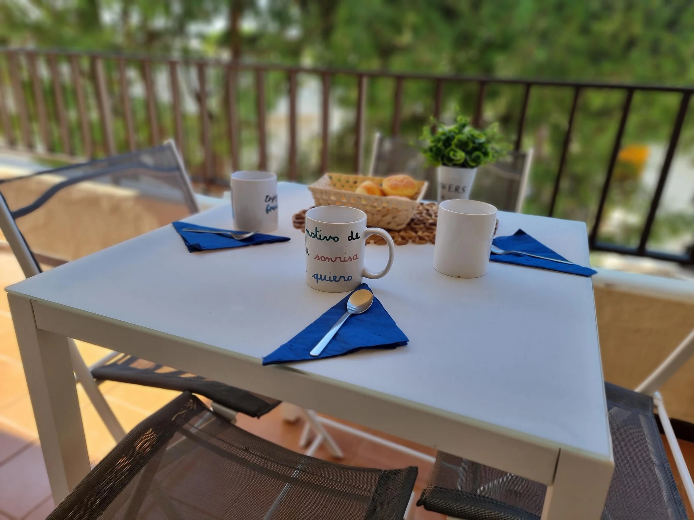 La terrasse privée est parfaite pour prendre le petit-déjeuner en plein air ou profiter des chaudes nuits méditerranéennes. Le complexe dispose également d'une piscine commune, idéale pour se rafraîchir après une journée de soleil et de sable.