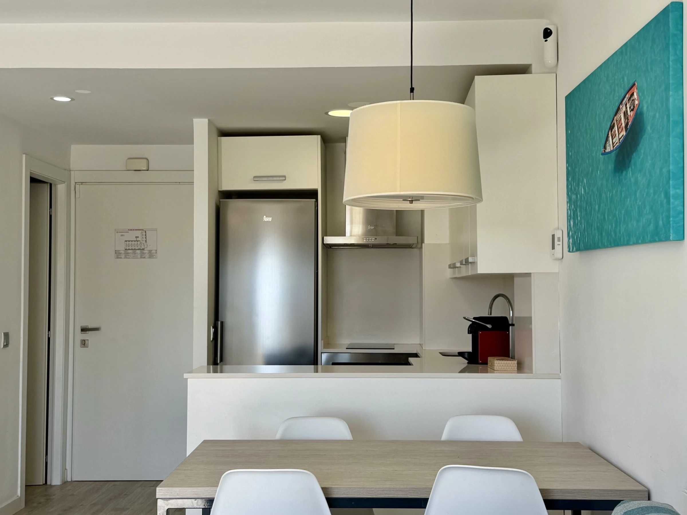 La cuisine américaine entièrement équipée est l'un des points forts de l'appartement. Elle dispose d'appareils électroménagers modernes tels que réfrigérateur, congélateur, lave-vaisselle, four, grille-pain et machine à café. De plus, vous trouverez tous les ustensiles de cuisine nécessaires pour préparer de délicieux repas en famille.