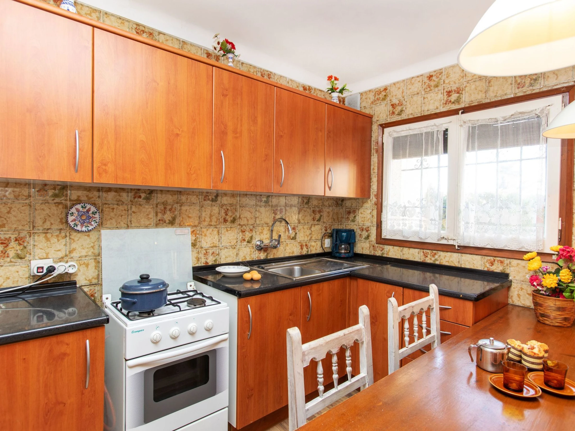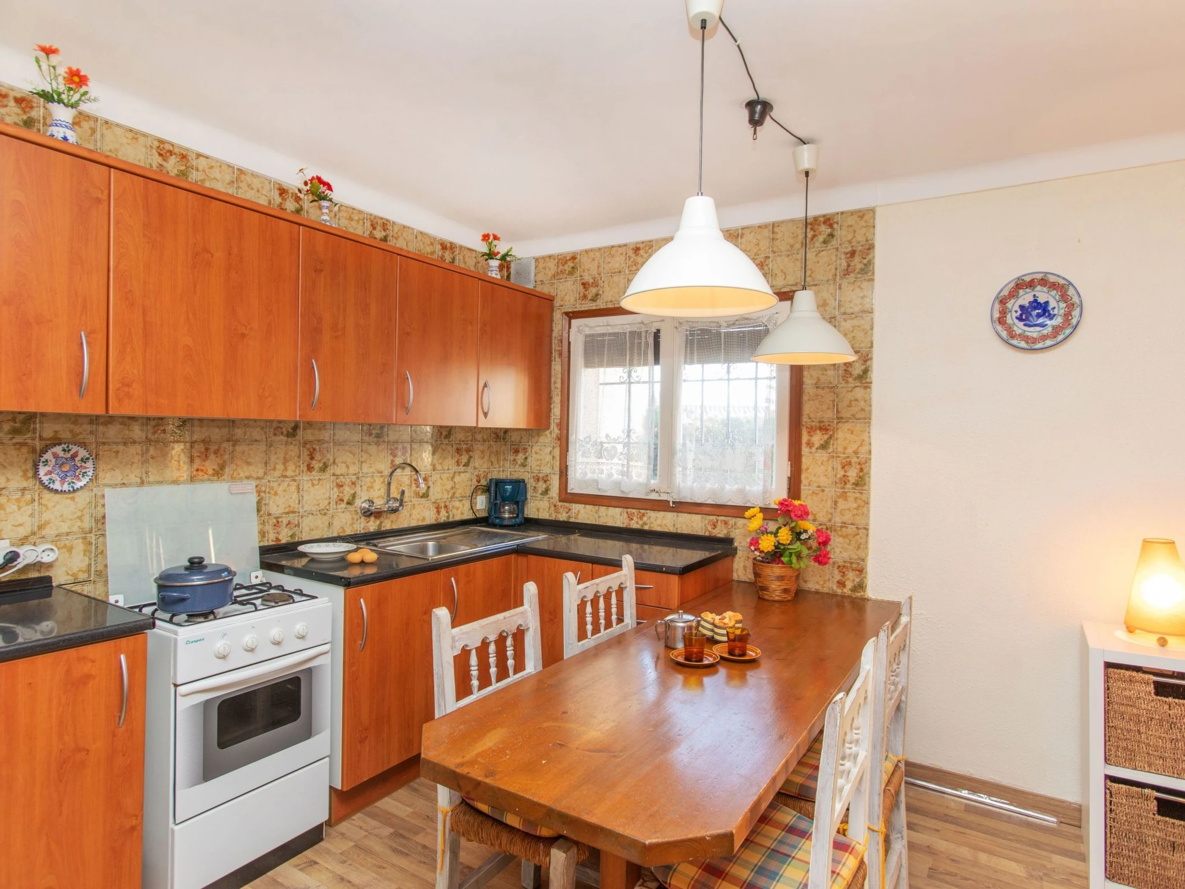 Maison mitoyenne 2 pièces 40 m2. Aménagement fonctionnel et confortable: séjour/salle à manger avec 2 lits pliants (80 cm, longueur 180 cm). Sortie sur le jardinet. 1 chambre avec 2 lits (90 cm, longueur 190 cm). Cuisine ouverte (3 plaques de cuisson, four, grille-pain, bouilloire électrique, micro-ondes, cafetière électrique). Douche/WC. Chauffe eau (50 litres). Pas de chauffage. Grande terrasse 3 m2 partiellement couverte. Meubles de terrasse. Vue sur le jardin. A disposition: lave-linge, fer à repasser, lit bébé jusqu'à 2 ans (en sus), sèche-cheveux. Veuillez noter: maison non-fumeur. TV seulement ES. [hidden]