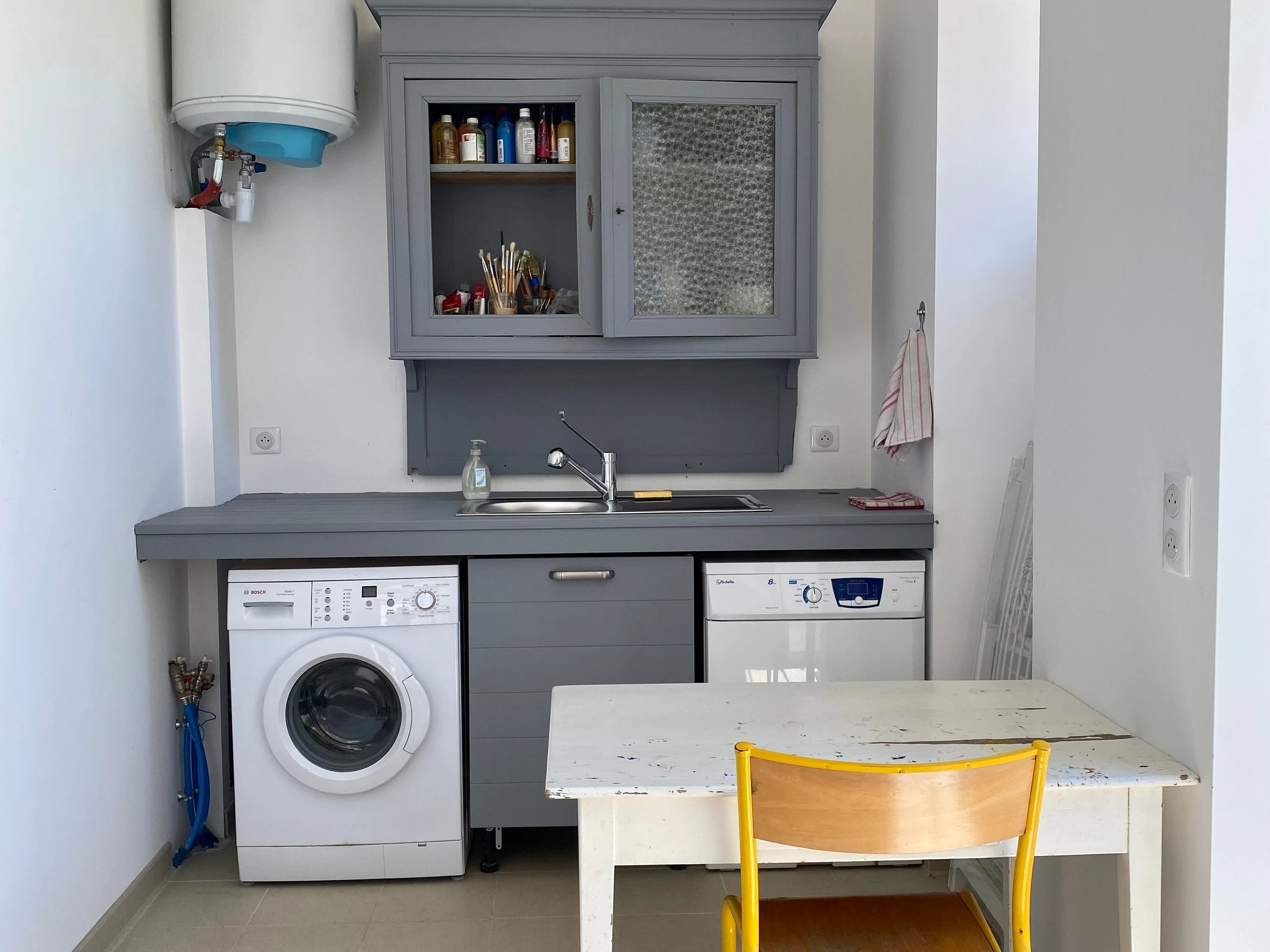 Dans local commun aux 3 studios : lave-linge, sèche-linge, congélateur et fer/planche à repasser partagés.