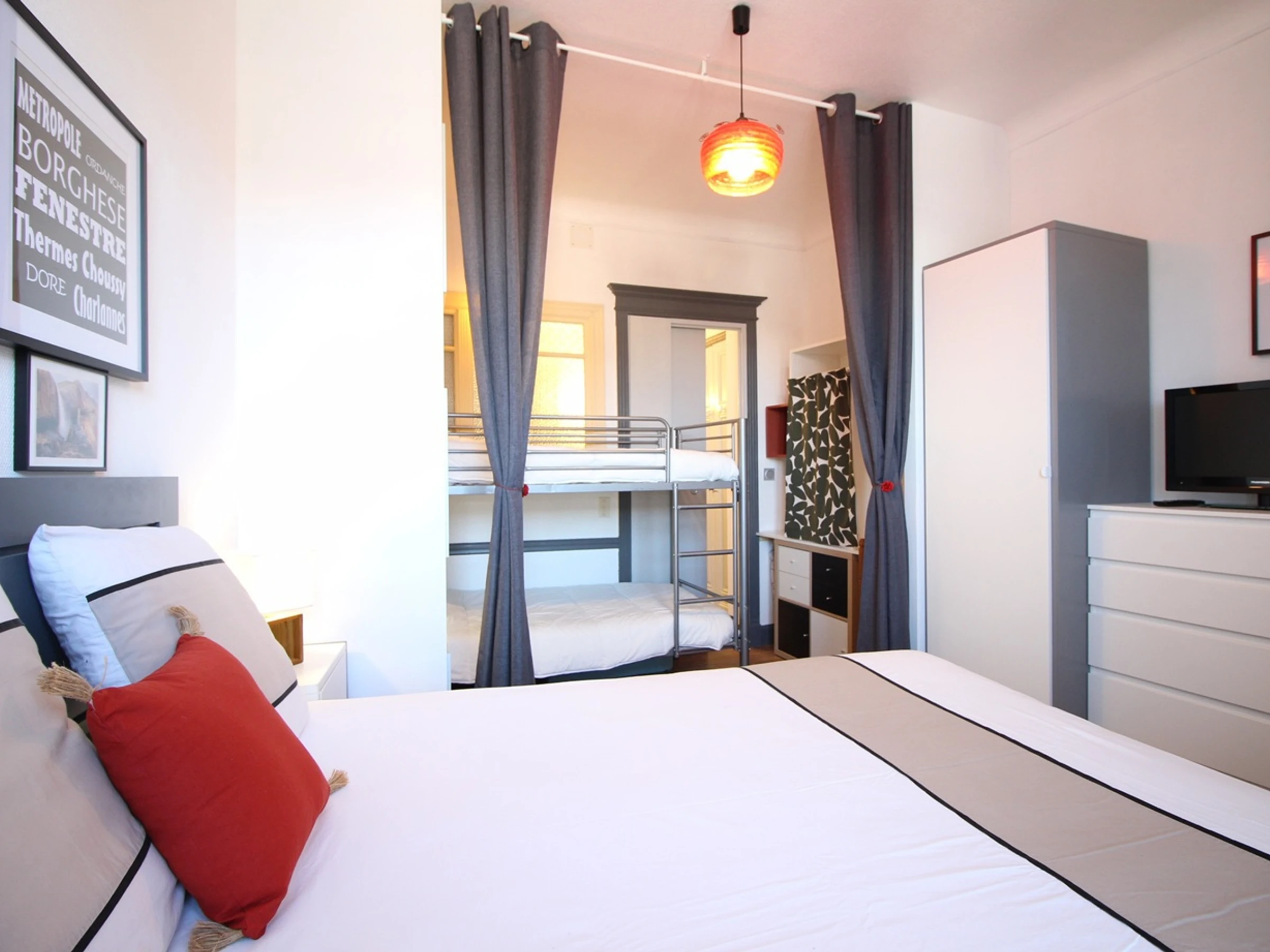 Une chambre lit 140 et lits superposés 90x190, rangements et télévision bénéficiant également d'une porte fenêtre,