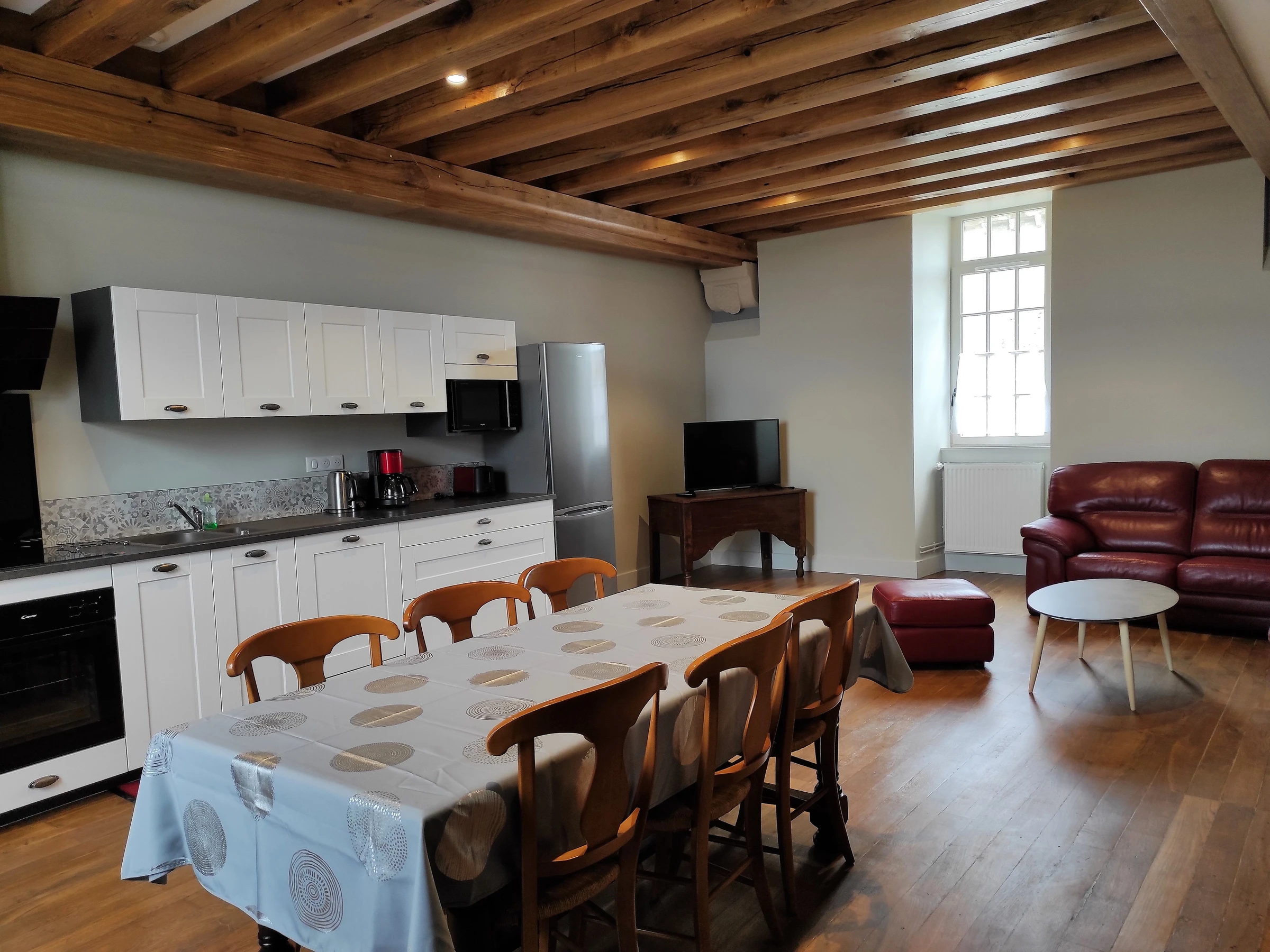 Dans un bourg calme au patrimoine bâti riche, gîte mitoyen à un autre, aménagé au premier étage de l'ancien prieuré entièrement restauré, avec terrasse privative non close (salon de jardin et barbecue à disposition). Il comprend 1 grande pièce à vivre avec cuisine équipée, 1 chambre double équipée également d'une banquette-lit, 2 chambres twins, 1 salle d'eau et une salle de bain.
