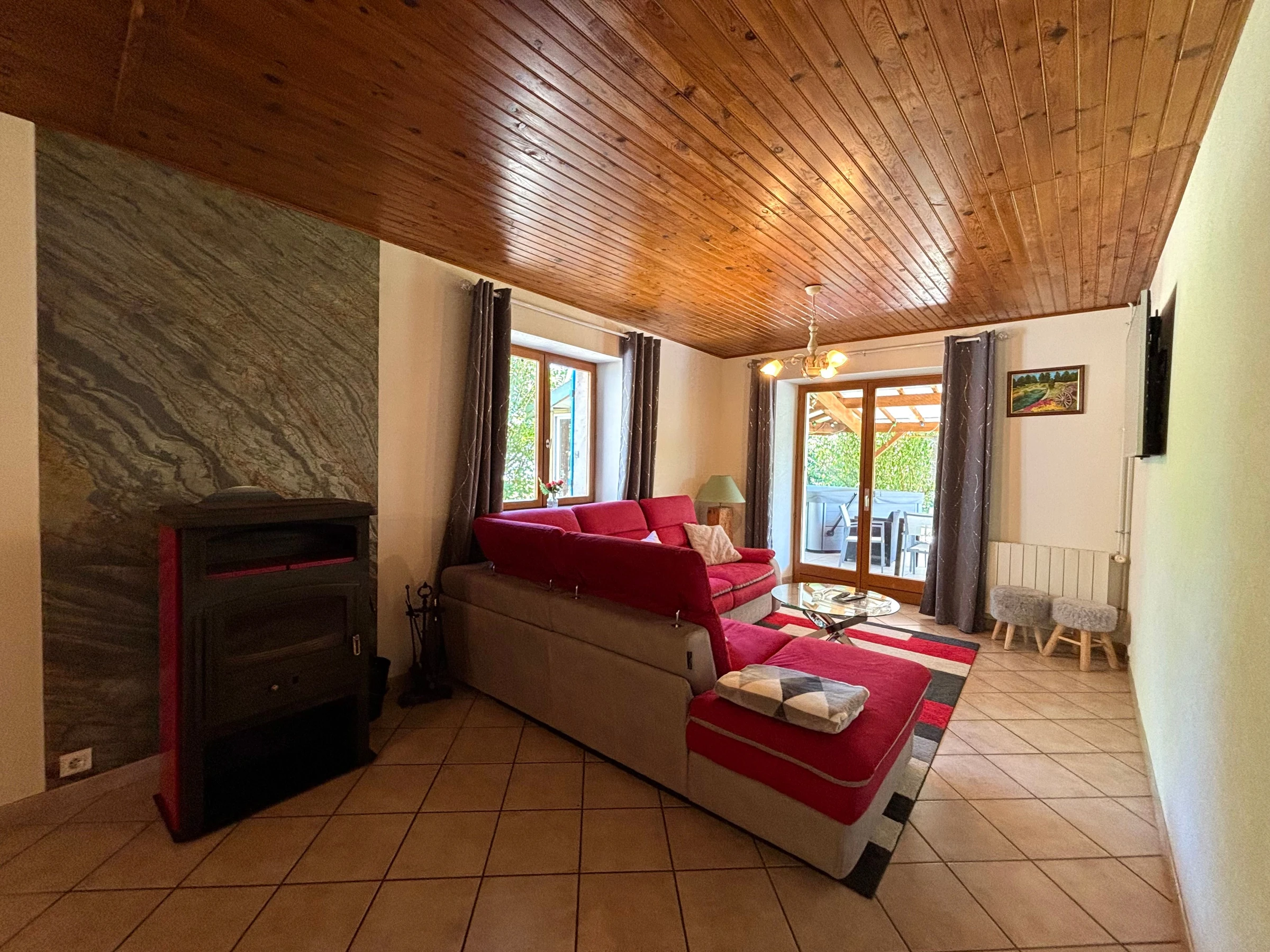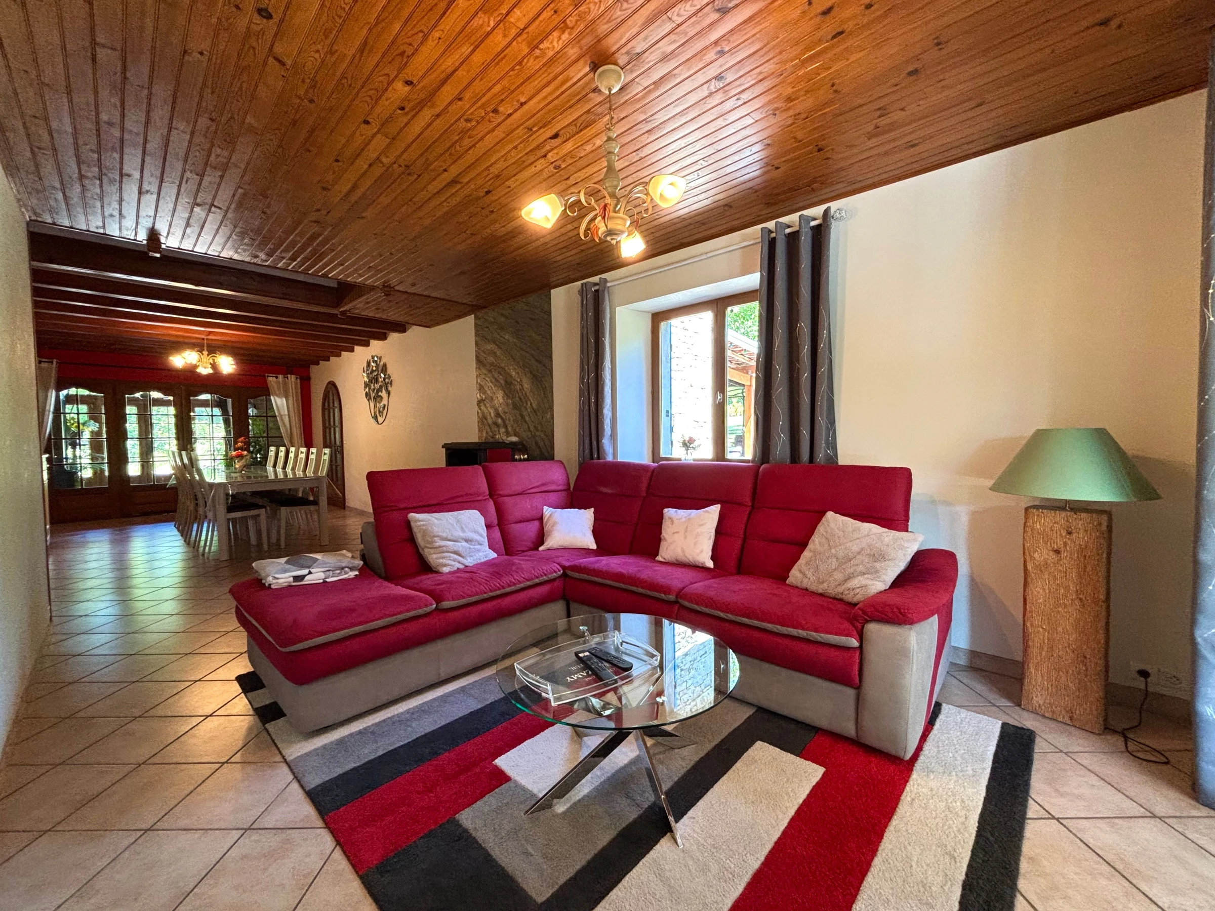 - une salle à manger avec espace détente (canapé d'angle et TV). Pour les soirées, un poêle à bois est à disposition.