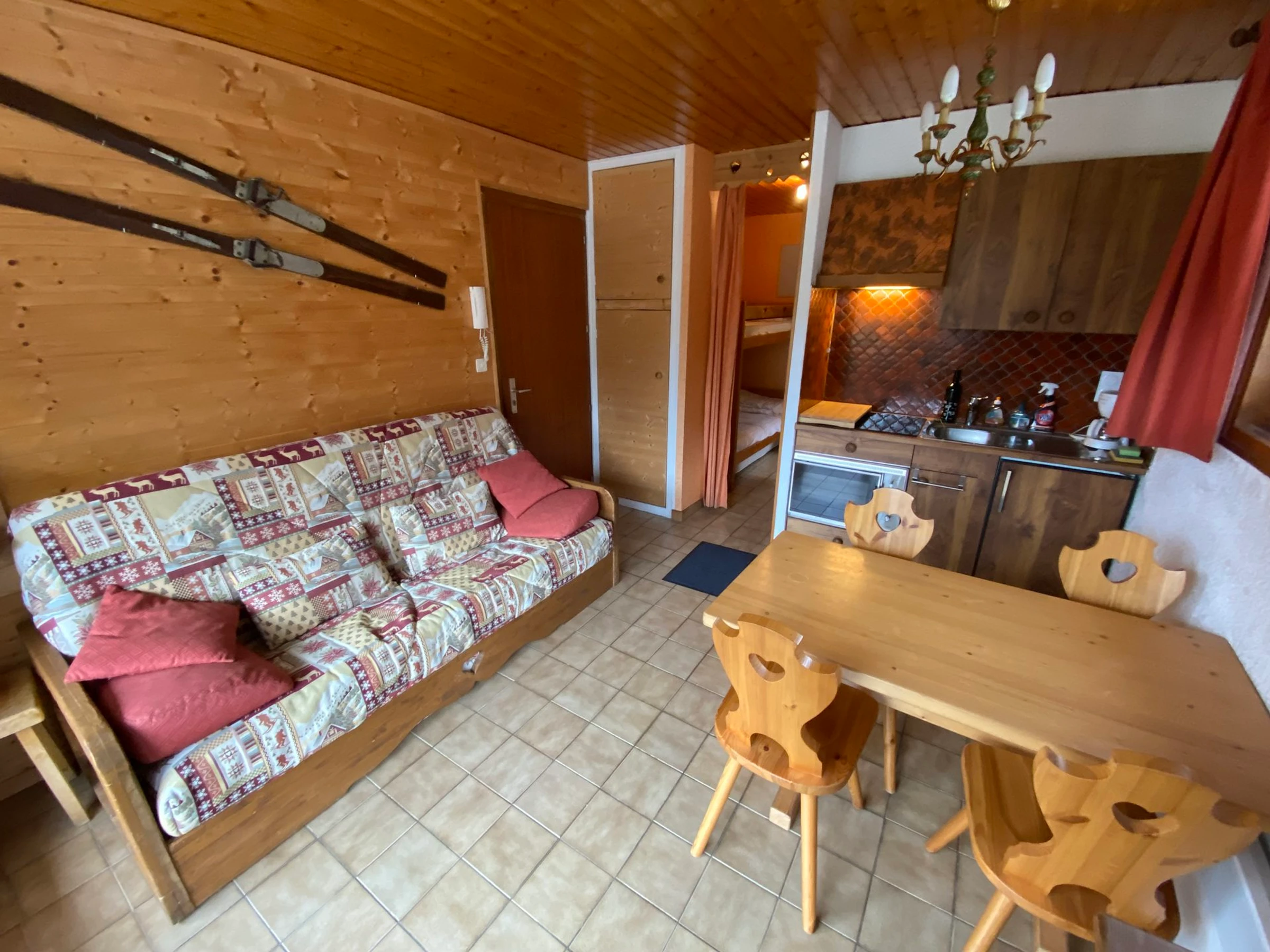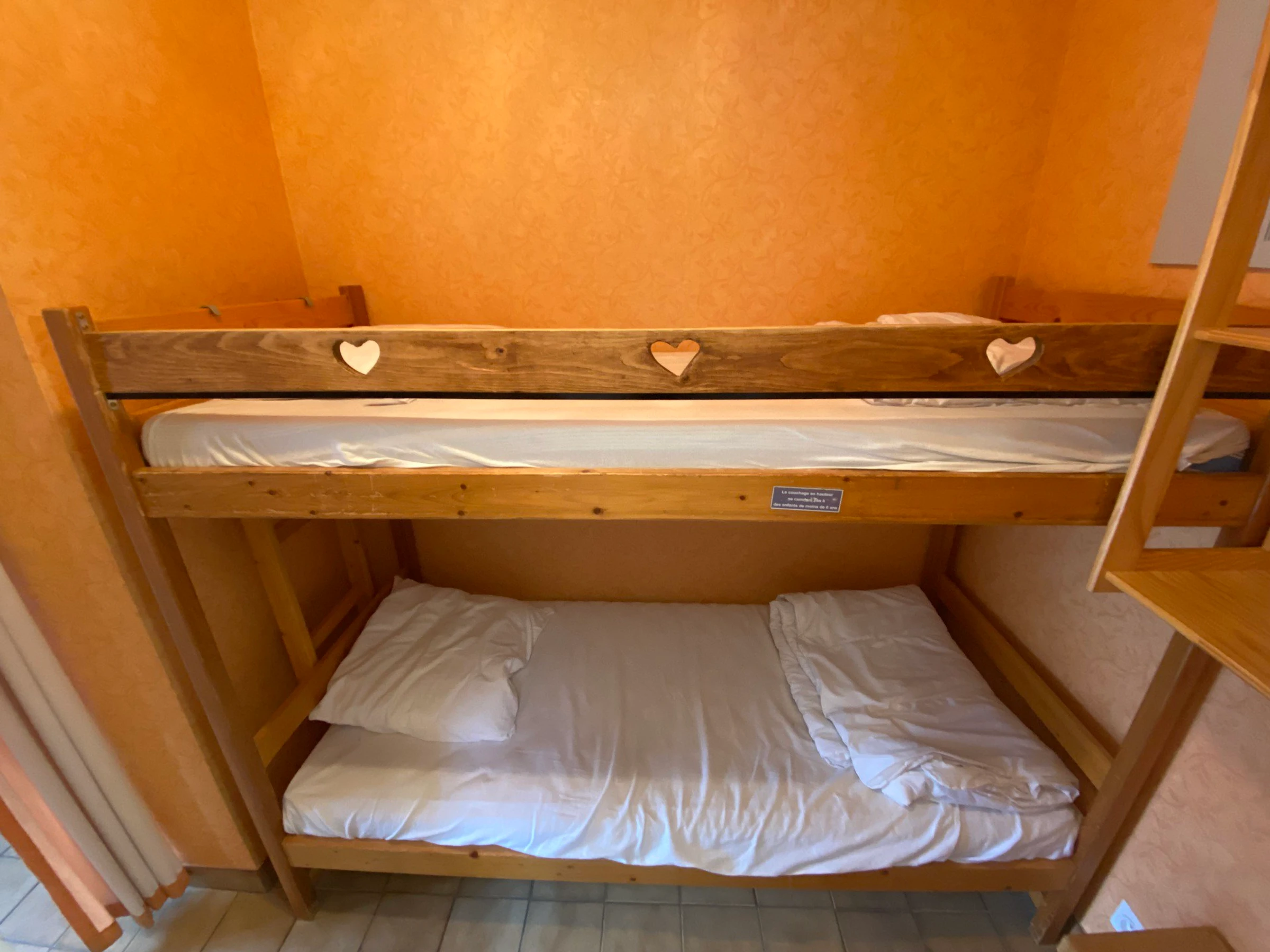 Appartement de 18 m², situé au 1er étage comprenant un séjour avec canapé convertible (130x180), une kitchenette équipée, un coin montagne avec lits superposés (2x1 personne 80x190), une salle de bain avec douche, lavabo et toilettes.