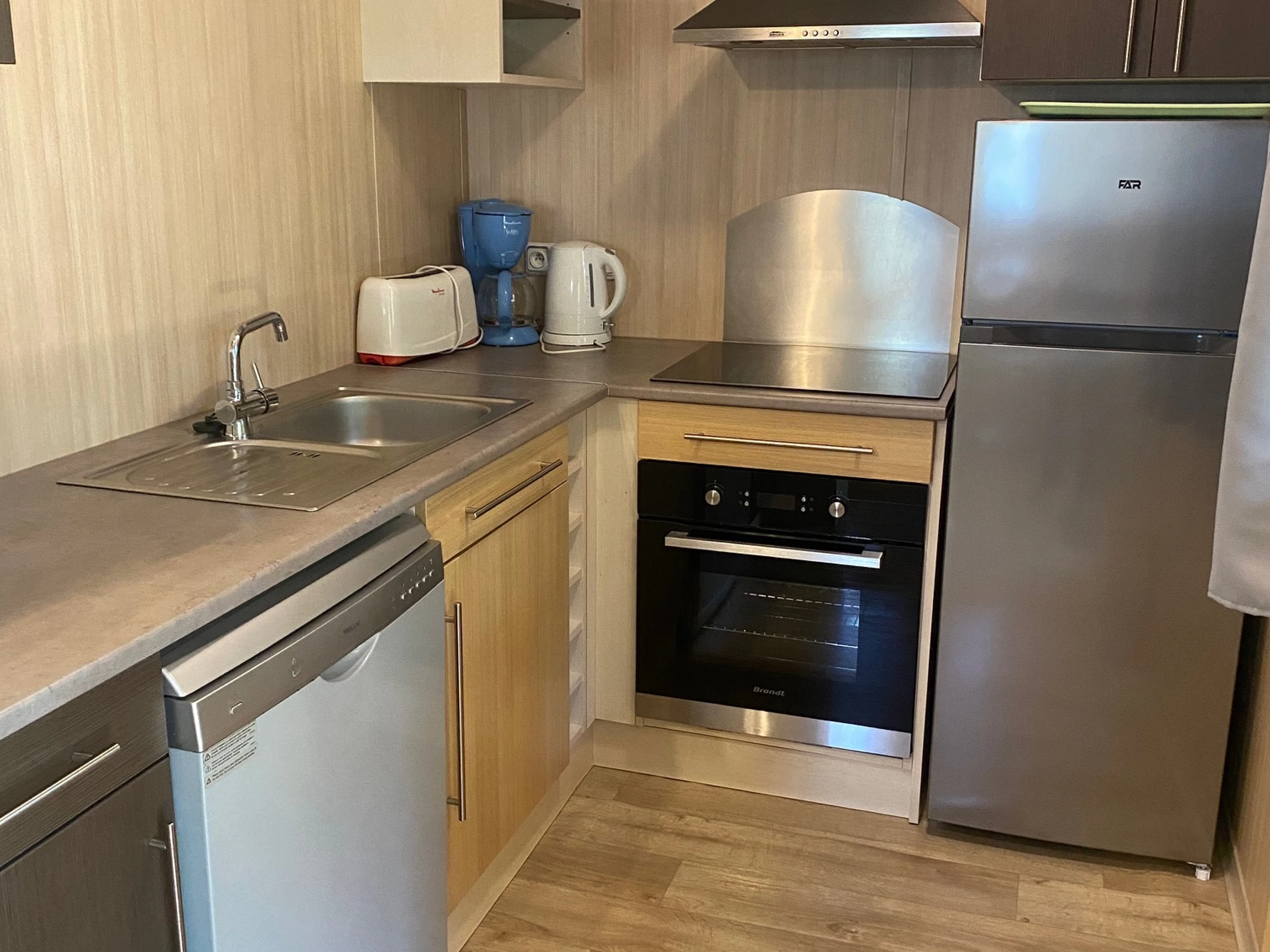 1 Cuisine aménagée et équipée lave-vaisselle, four, plaque vitrocéramique, frigo-congélateur, cafetière classique, micro-ondes, bouilloire, grille-pain.