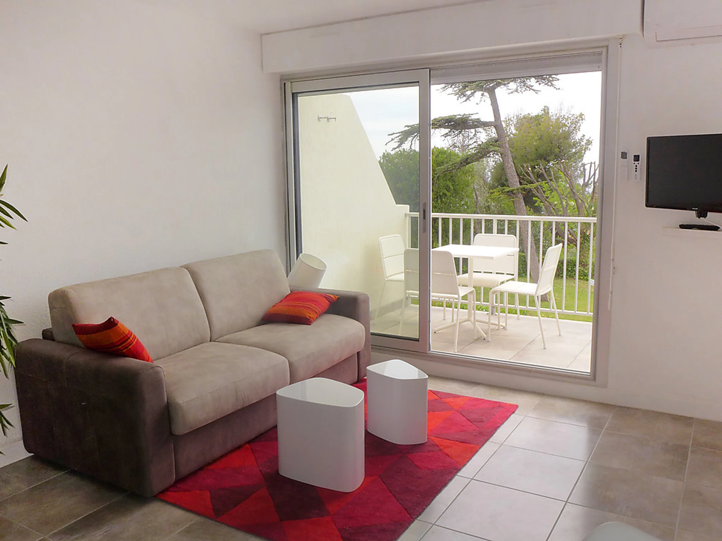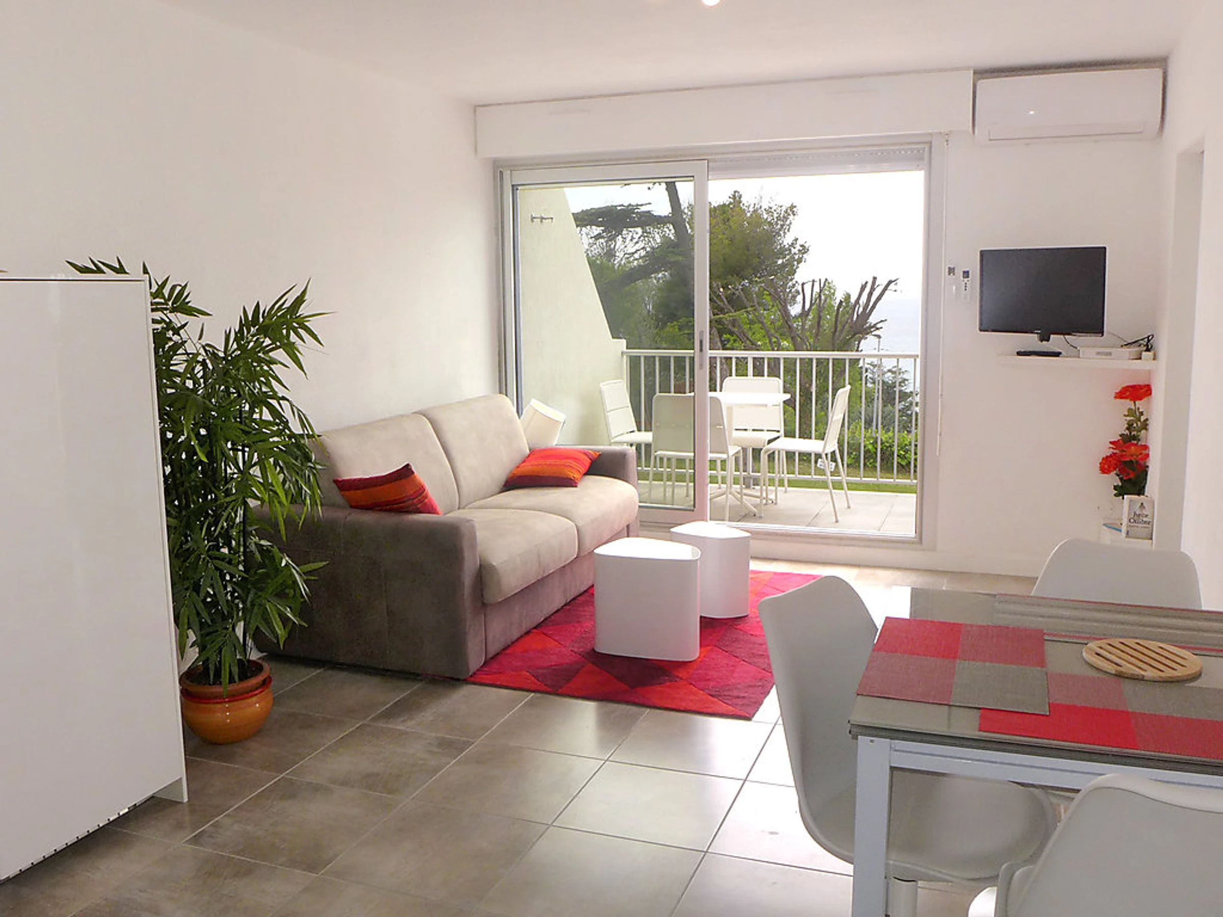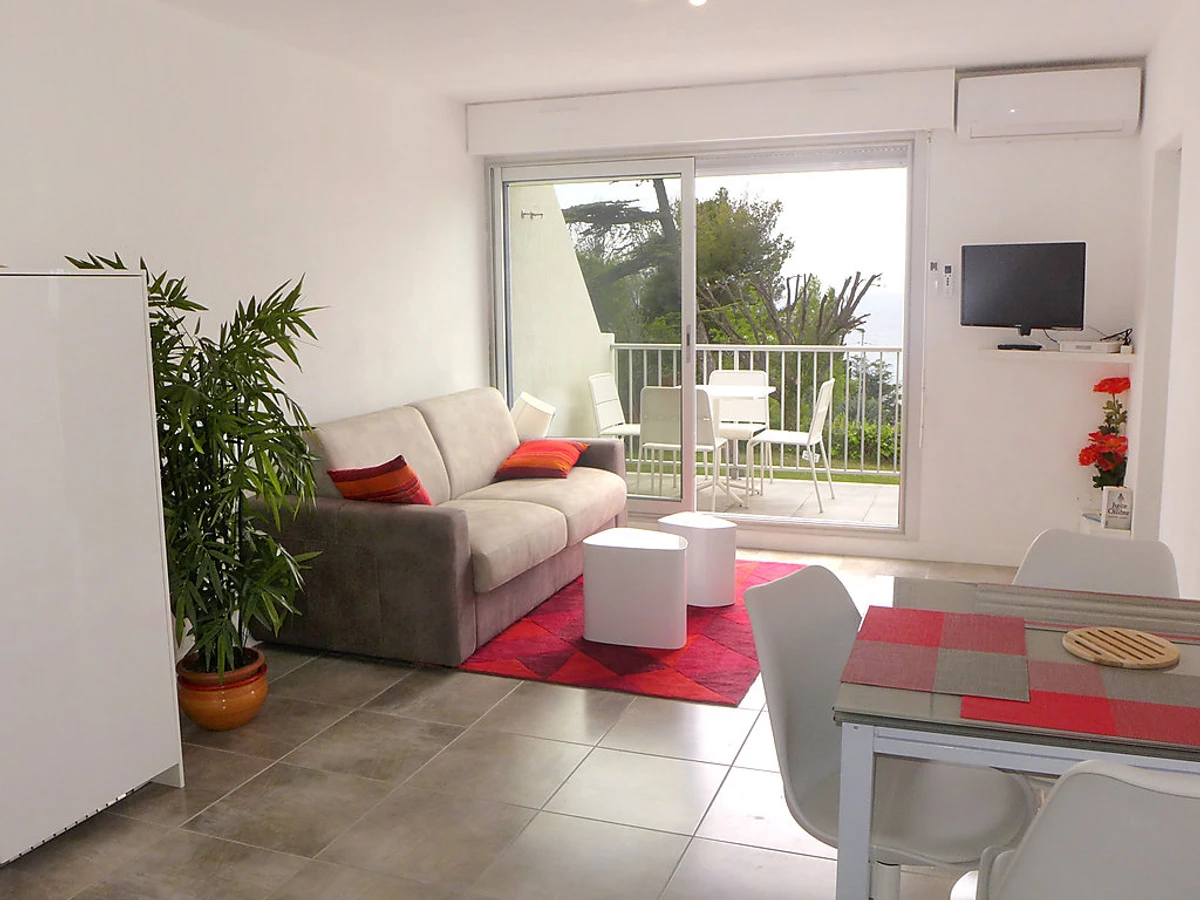 Apt 2 pièces 37 m2 au 1er étage. Complètement rénové en 2016, aménagement agréable et moderne: séjour/salle à manger avec 1 divan-lit double (140 cm, longueur 190 cm), TV (écran plat), air-conditionné. Sortie sur la terrasse. 1 chambre avec 1 grand-lit (140 cm, longueur 190 cm). Coin cuisine (four, lave-vaisselle, 4 plaques vitrocéramique, four micro-ondes). Douche/WC. Terrasse 6 m2. Meubles de terrasse. Très belle vue sur la mer. A disposition: lave-linge, fer à repasser. Internet (Connexion WIFI, gratuit). Veuillez noter: TV seulement FR. Services supplémentaires obligatoires sur le site: Taxe de séjour 0.66EUR par personne et par jour, Taxe de séjour enfants (par personne et par jour), Taxe de séjour bébés (0-2) (par personne et par jour), Taxe de séjour 0.3EUR par personne et par jour